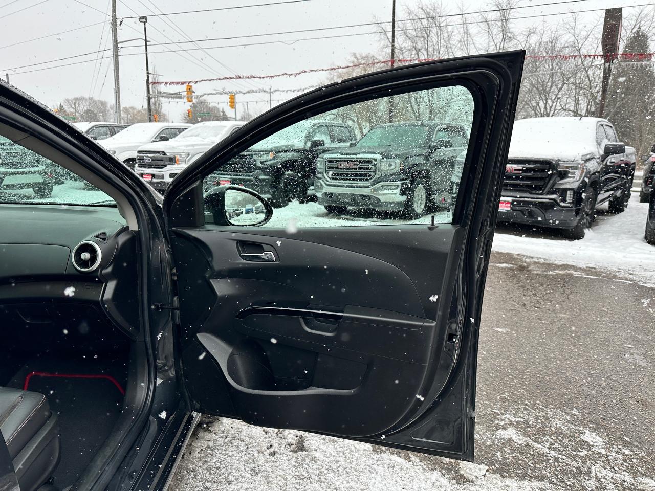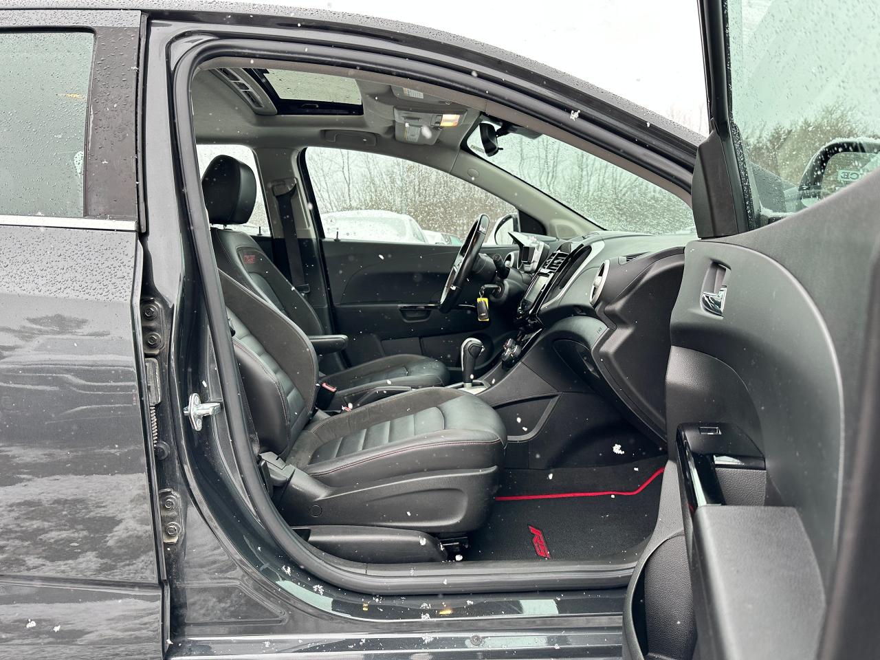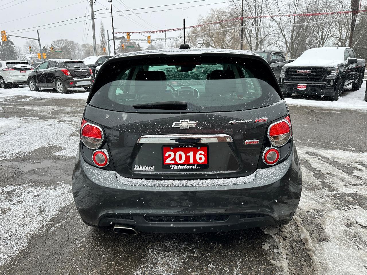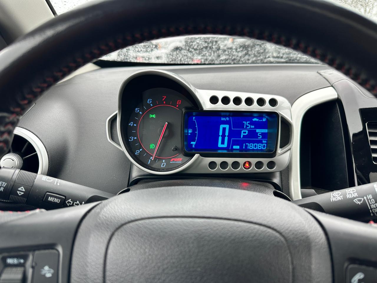 Super-Clean local trade-in Chevrolet Sonic from Bowmanville, ON! This RS hatchback model looks great in its dark Grey/Black paint, with nice options inside and out! The exterior features keyless entry with remote start, automatic headlights, foglights, a large factory power sunroof, colour-matched side mirrors, lane departure and forward collision warnings, a sleek rear spoiler, and gorgeous Black factory alloy wheels, a peppy fuel-efficient 1.4L 4-Cylinder Turbocharged Engine and Automatic transmission! The interior is clean and comfortable with heated leather front seats with RS motifs, power door locks, windows and mirrors, comfortable rear seating area, a decently sized cargo area, RS floor mats, a leather-wrapped steering wheel with Audio and Cruise controls, a sporty central gauge cluster, a large central touch screen AM/FM/XM Satellite Radio with Bluetooth, Backup Camera and SmartPhoneLink features, A/C climate control with front and rear window defrost settings, dash storage area, USB/AUX/12V accessory ports and more!