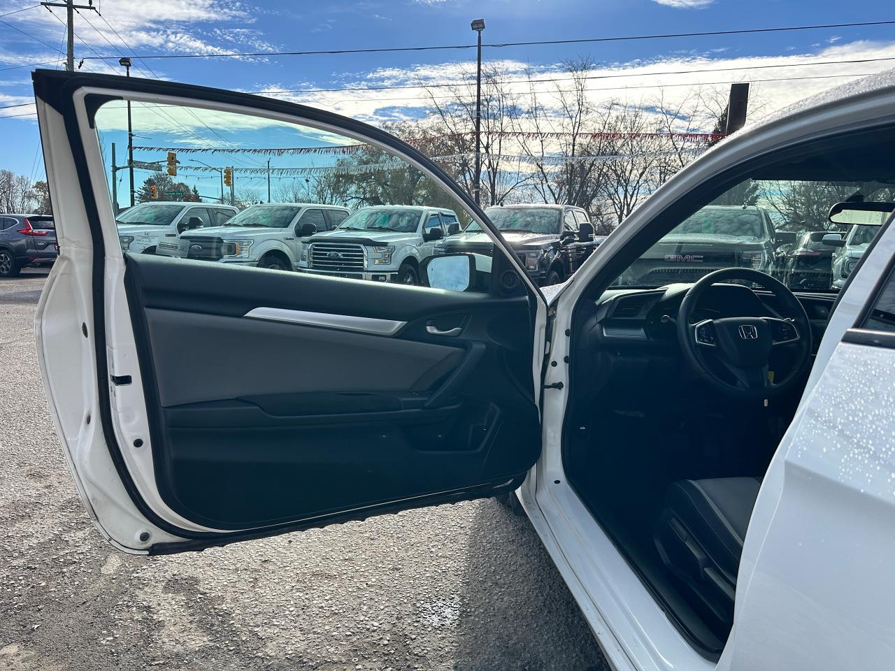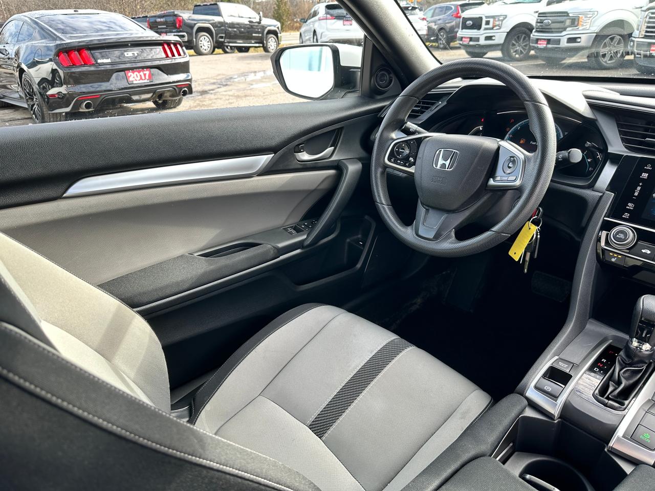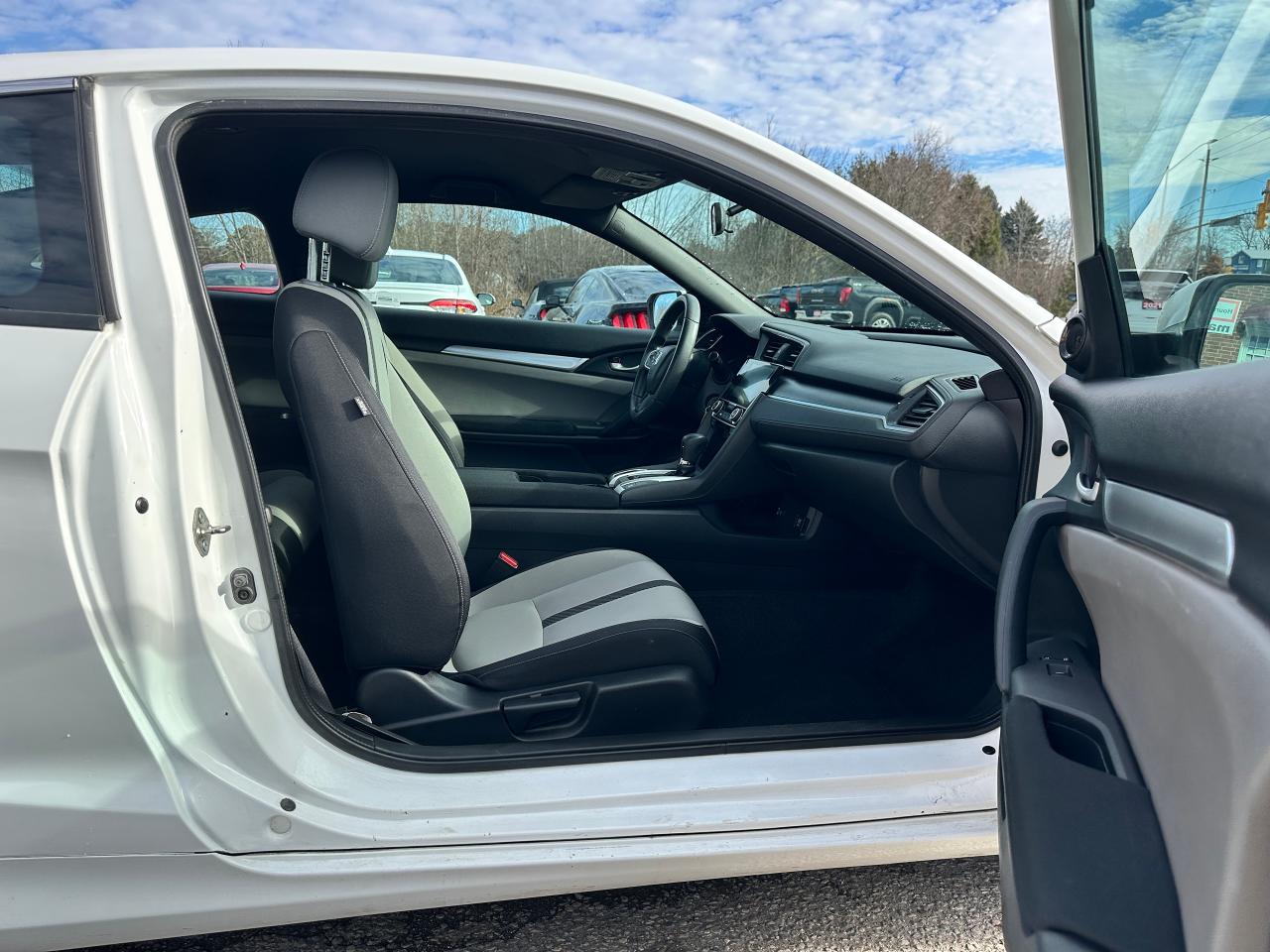 WOW! SUPER-CLEAN, low KM Honda Civic from Cobourg, ON! This 2-Door LX Coupe looks awesome in its White paint and factory alloy wheels, with nice options inside and out! The exterior features keyless entry with remote trunk release, automatic headlights, colour-matched heated side mirrors, sporty exterior styling, gorgeous factory machine-finished alloy wheels, a peppy fuel-efficient 2.0L 4-cylinder Engine and a CVT-Auto transmission! The interior is clean and comfortable with heated Cloth front seats, power door locks, windows and mirrors, steering wheel Audio and Cruise controls, an easy-to-read and use gauge cluster, a large central touch screen AM/FM Radio with Bluetooth, Apple CarPlay, Android Auto, and a Backup Camera, A/C climate controls with front and rear window defrost settings, Brake Auto-Hold setting, ECON driving mode for improved fuel economy, and more!