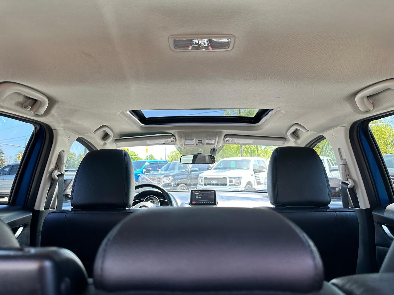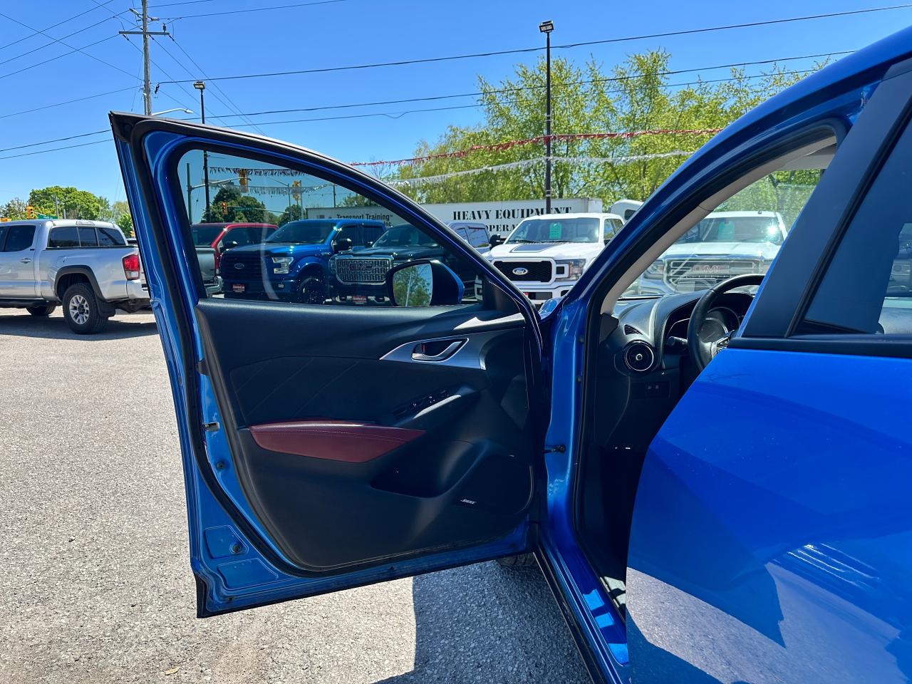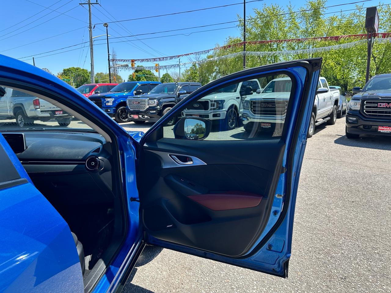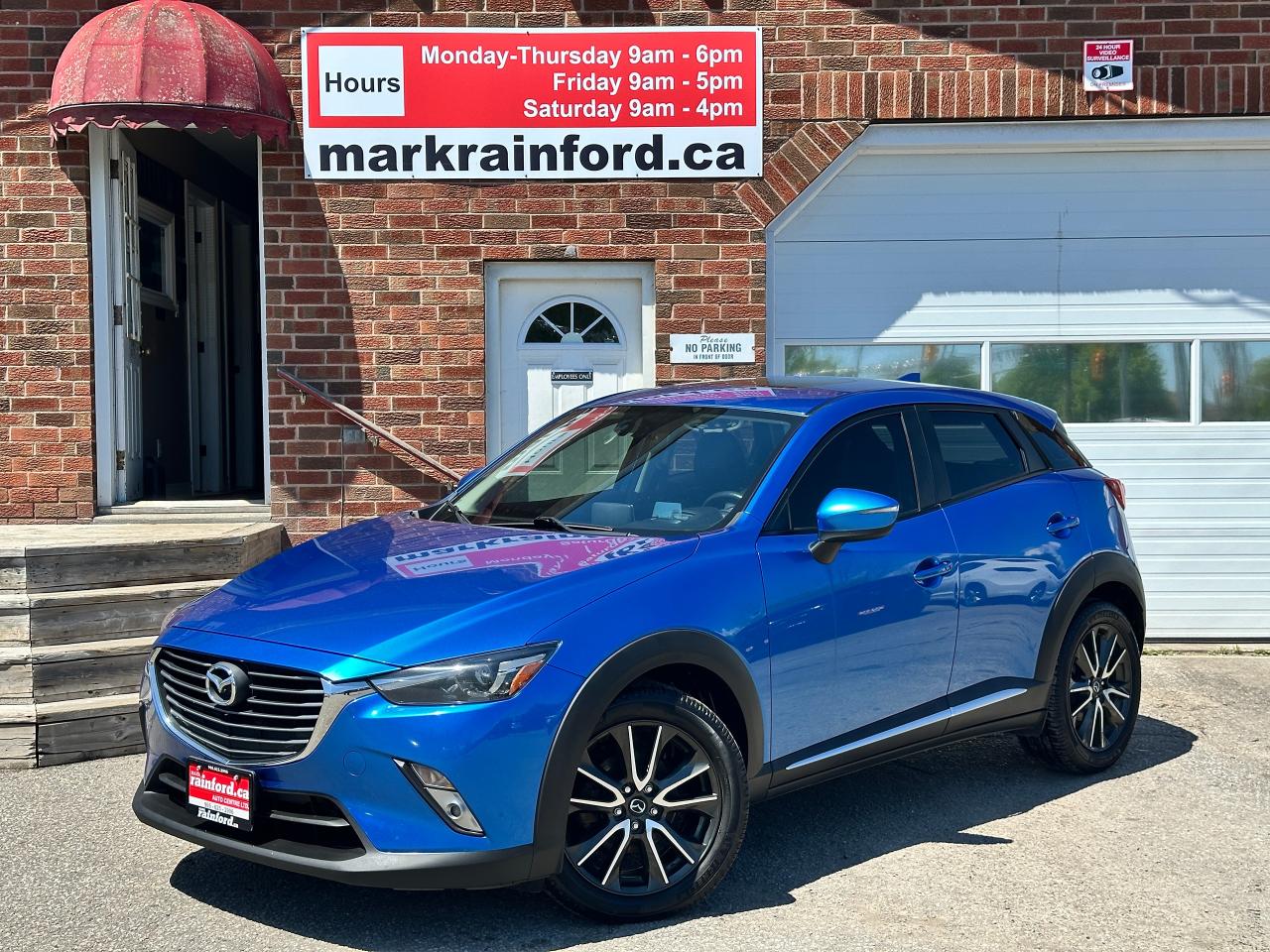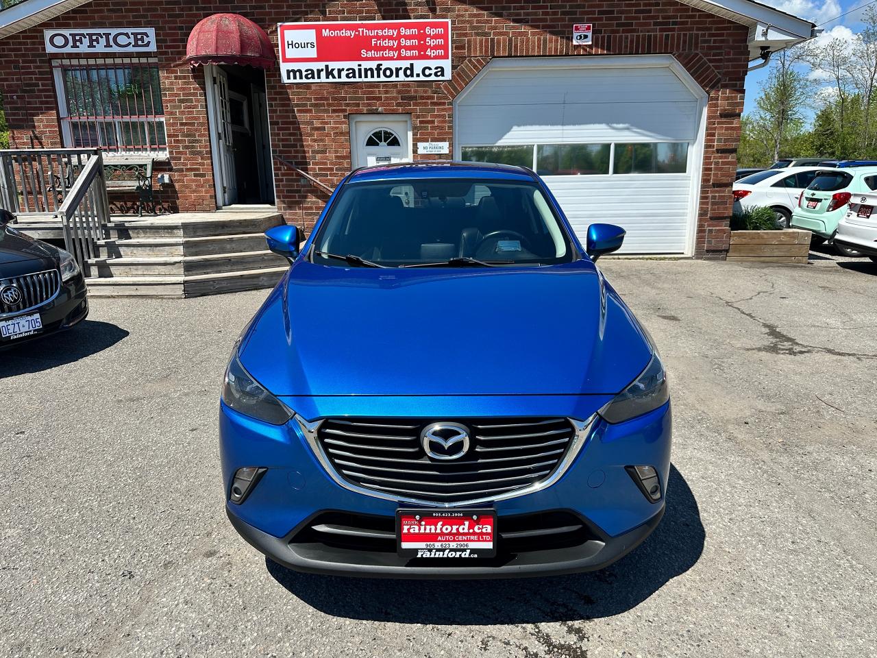 Super-Clean and well-equipped Mazda CX-3 from Ottawa, ON! This GT AWD model looks stunning its Blue paint and factory alloy wheels, with fantastic options inside and out! The exterior features keyless entry with proximity key, automatic headlights, foglights, factory power sunroof, colour-matched side mirrors with integrated turn signals, sporty dual exhaust and sleek spoiler, tinted privacy glass, sharp exterior styling, gorgeous machine finished dark Alloy wheels, a peppy and fuel efficient 2.0L 4-cylinder Engine and Automatic transmission powering the All-Wheel-Drive system! The interior is clean and comfortable with heated leather front seats, a comfortable rear seating area and a large cargo area with a cargo shade, all-weather Mazda mats, power door locks, windows and mirrors, a leather wrapped steering wheel with Audio and Cruise controls, paddle shifters, an easy to read and use gauge cluster, push button start, central AM/FM HD Radio with BOSE Premium Audio, Bluetooth, Navigation, Backup Camera and CD Player, A/C Climate control with front and rear window defrost settings, USB/AUX/12V accessory ports, SPORT Driving mode and more!