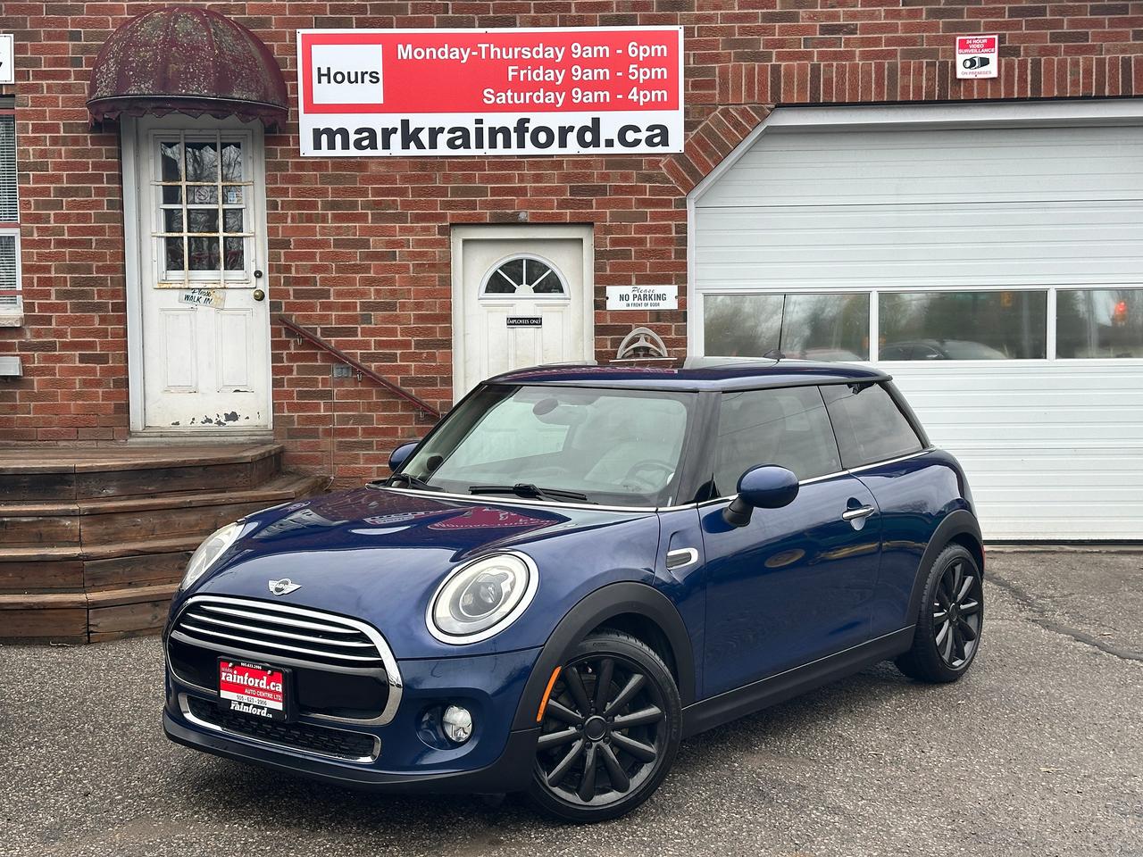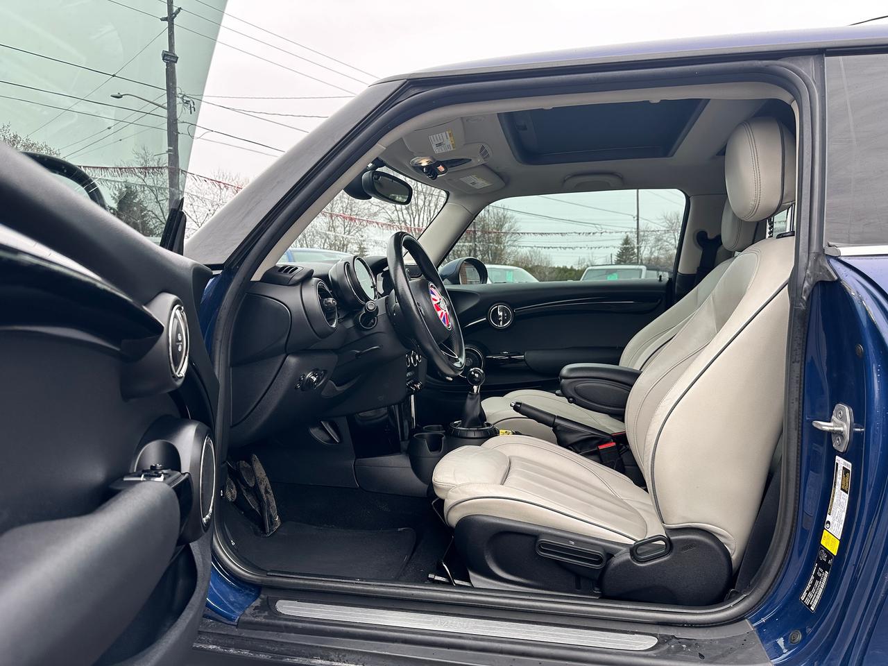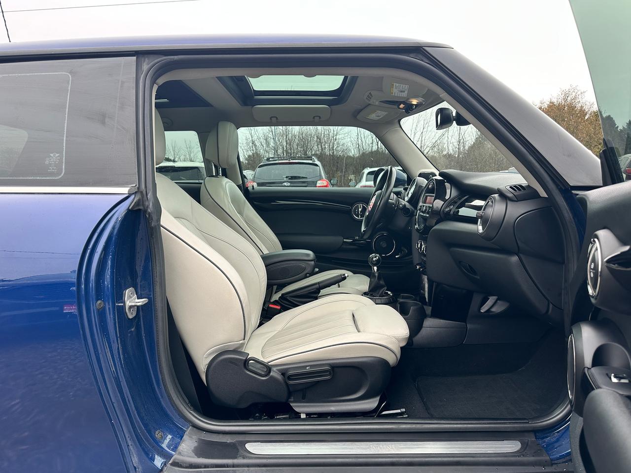 WOW! Super-Clean LOW KM Local MINI Cooper from Bowmanville, ON! This 2-Door Hatchback model looks incredible in its Dark Blue paint and Black Alloy wheels! The exterior features keyless entry with proximity keys, dual moonroofs, colour-matched side mirrors, automatic headlights, foglights, tinted privacy glass, a sleek rear spoiler, beautiful Black alloy wheels, a peppy fuel-efficient 1.5L 3-Cylinder Turbocharged Engine and 6-Speed Manual Transmission, Car Cover Included! The interior is clean and comfortable with heated leather front seating, power door locks, windows and mirrors, a leather wrapped steering wheel with Audio and Cruise controls, a sporty gauge cluster, push button start, a central AM/FM Radio with Bluetooth, and MP3 capability, Dual-Zone A/C Climate controls with front and rear window defrost settings, heated front windscreen wiper area, Auto-Stop/Start override switch, USB/AUX/12V accessory ports, Sport/Green Driving modes, and more!