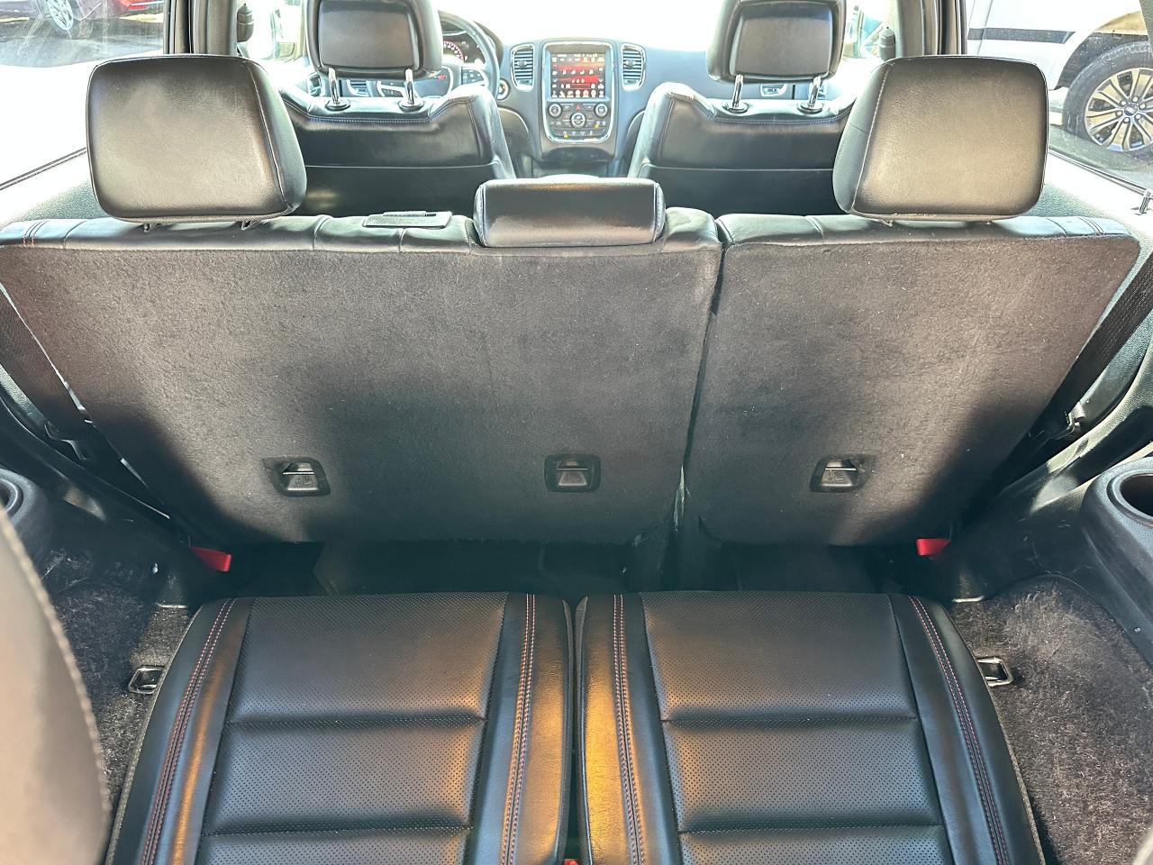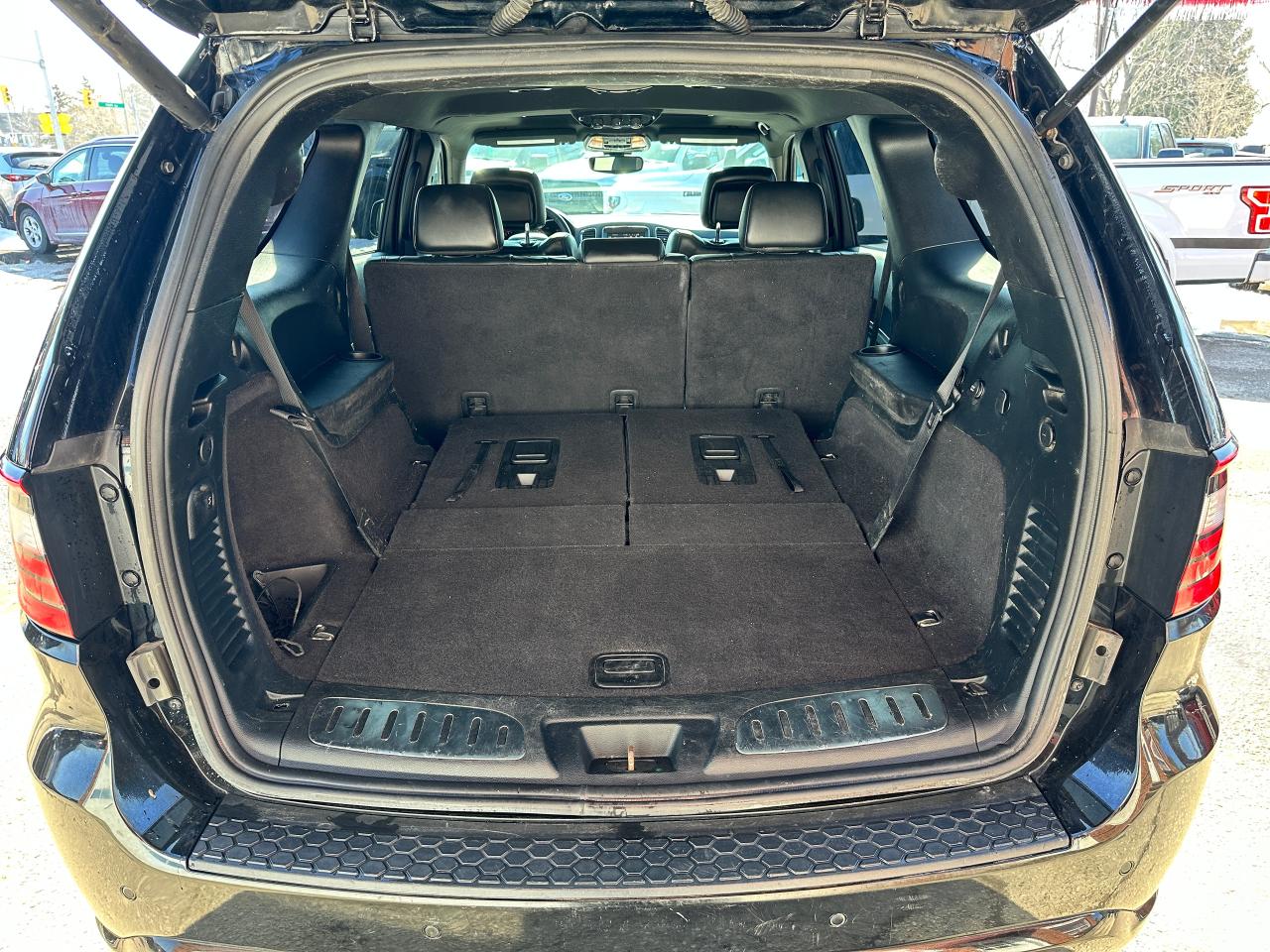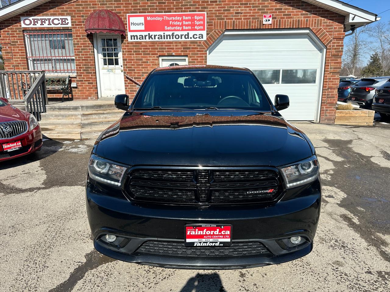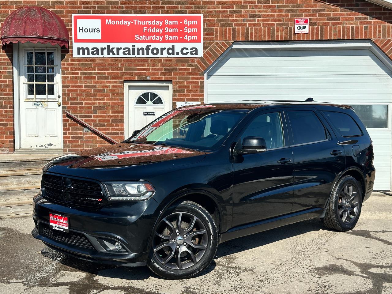 Super-Clean and Low-KM Dodge Durango from Rockland, ON! This R/T AWD model looks awesome in its Black/Black Colour scheme, with nice options inside and out! The exterior features keyless entry with proximity keys and remote start, a large factory power sunroof, a remote power liftgate, automatic headlights, foglights, colour-matched side mirrors with integrated turn signals, a sleek rear spoiler, sporty dual rear exhaust, tinted privacy glass, rearparking sensors, gorgeous dark factory split spoke alloy wheels, a powerful 5.7L V8 Engine and Automatic transmission and All-Wheel-Drive! The interior is very clean and comfortable with heated and cooled front leather seating with power adjustment and lumbar controls, driver's memory seating, heated rear seating, third row fold-up seats, power door locks, windows and mirrors, a heated leather wrapped steering wheel with Audio and Cruise controls, paddle shifters, push button start, an easy to read and use gauge cluster, a large central touch screen AM/FM/XM Satellite Radio with Bluetooth, Navigation, MP3 Capability and Backup Camera, ECO/Sport Modes, Dual-Zone A/C climate controls with front and rear window defrost settings, USB/AUX/12V accessory ports, universal garage door openers, and more!
