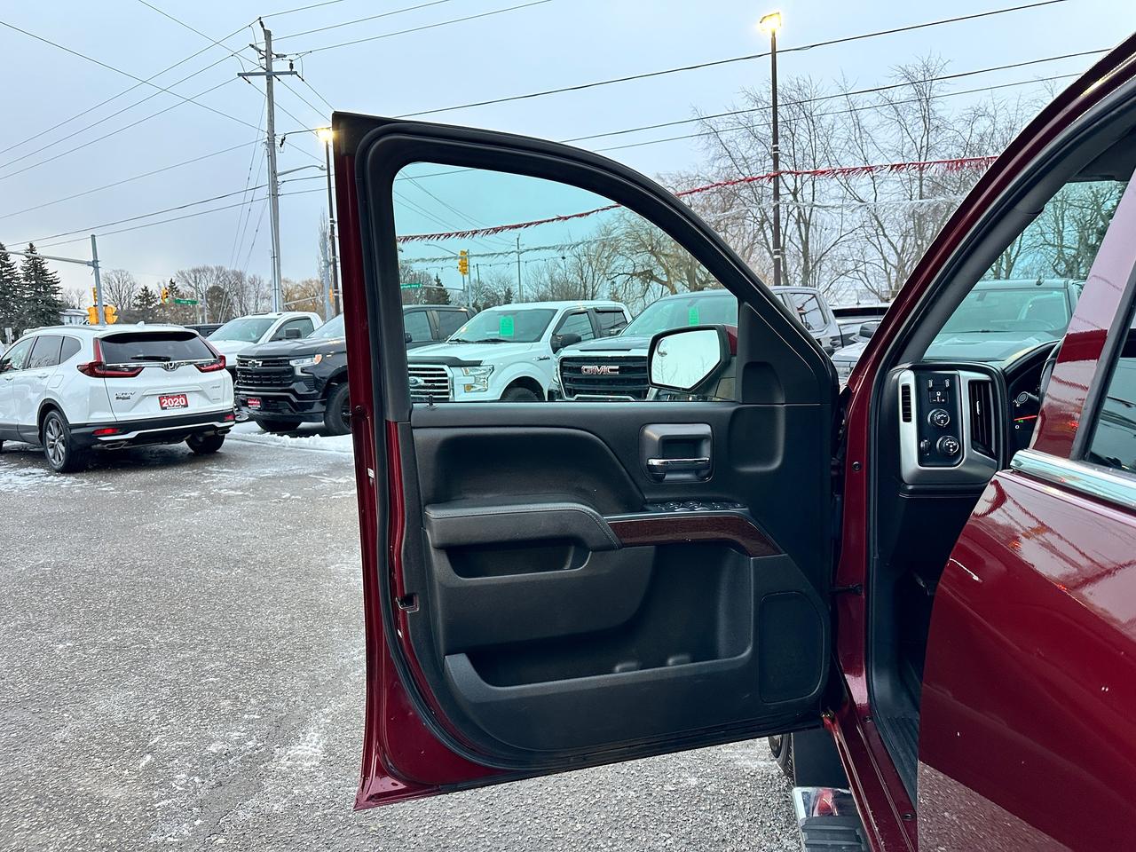 Sharp-looking GMC Sierra 1500 from Carp, ON! This SLE Kodiak 4x4 CrewCab model looks great in its Burgundy paint and factory alloy wheels, with nice options inside and out! The exterior features keyless entry with remote start, colour-matched side mirrors, front tow hooks, a trailer hitch, automatic headlights, foglights, chromed bumpers, rear parking sensors, chromed step sides, rear bumper steps, a spray-in GMC bedliner, tinted privacy glass, sliding rear window, nice factory alloy wheels, a powerful 5.3L V8 Engine and Automatic Transmission driving the 4x4 system! The interior is clean and comfortable with cloth seating for 6 through its fold-up centre console, power door locks, windows and mirrors, all-weather floor mats, spacious rear seating area, power adjustable driver's seating with lumbar controls and adjustable pedals, integrated electronic trailer brake controller, electronic 4x4 selection knob, a leather wrapped steering wheel with Audio and Cruise controls, an easy to read and use gauge cluster, a large central touch screen AM/FM/XM Satellite HD Radio with Bluetooth, Apple CarPlay, Android Auto, Backup Camera and CD player, Dual-Zone A/C climate controls with front and rear window defrost settings, Universal garage door openers, USB/12V accessory ports and more!