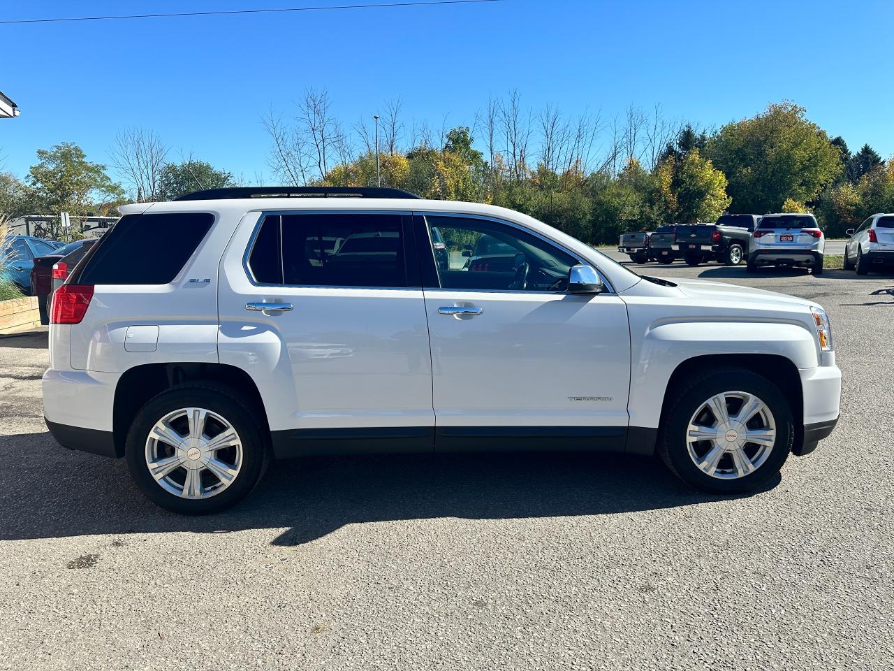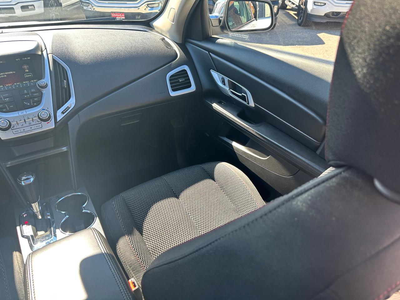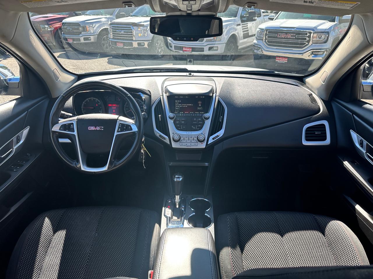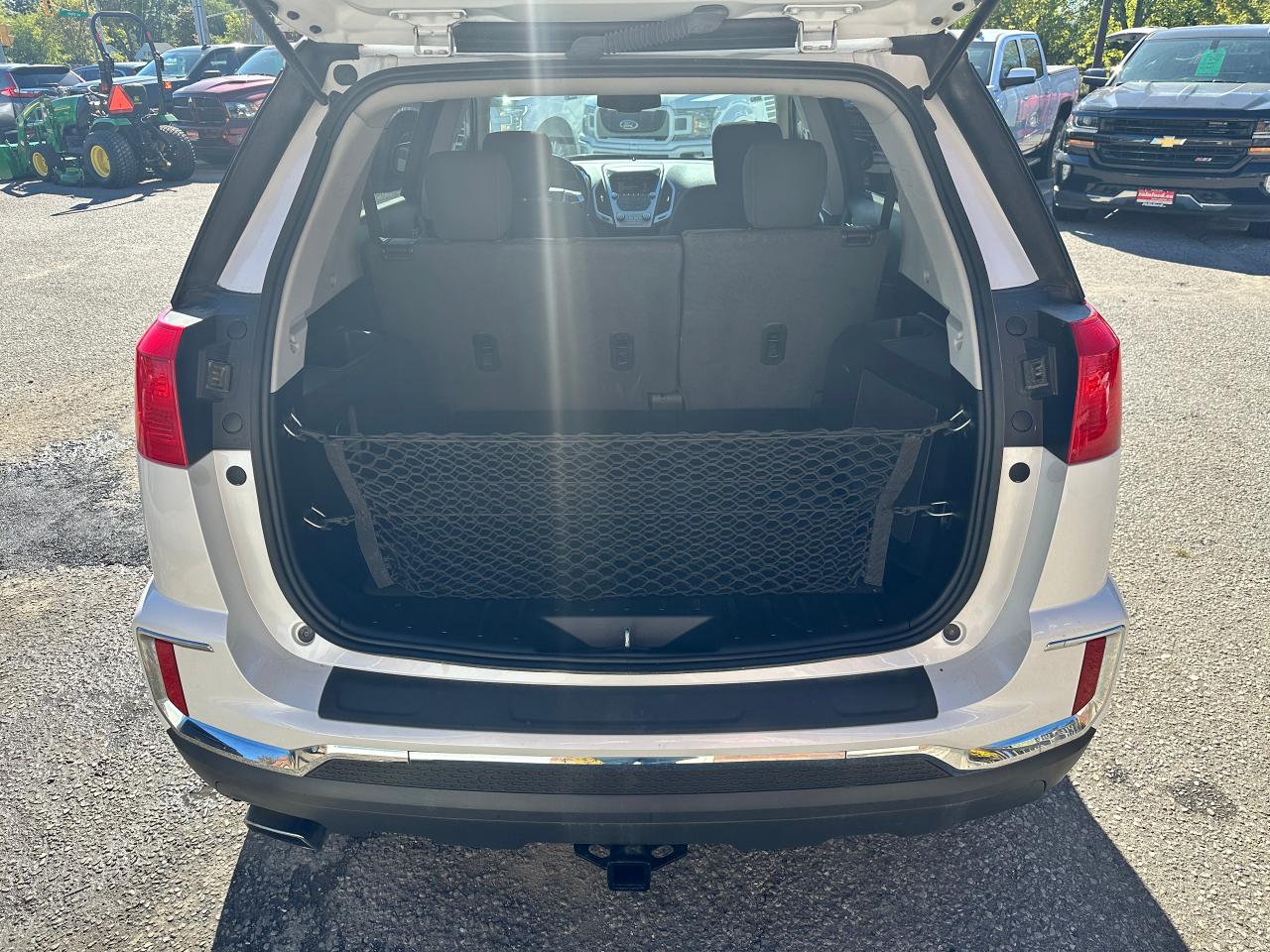 Super-Clean local GMC Terrain from Peterborough/Oshawa, ON! This SLE2 AWD model looks nice in its White paint and factory alloy wheels, with great options inside and out! The exterior features keyless entry with remote start, headlights and foglights, tinted privacy glass, a factory power sunroof, roof rack rails, a trailer hitch, chromed accents, a peppy fuel-efficient 2.4L 4-cylinder Engine and Automatic transmission powering the All-Wheel-Drive system! The interior is clean and comfortable with heated cloth front seats with driver's power adjustment and lumbar controls, power door locks, windows and mirrors, spacious rear seating and cargo area with cargo net, red accent stitching, a leather wrapped steering wheel with Audio and Cruise controls, an easy to read and use gauge cluster, central touch screen AM/FM/XM Satellite Radio with Bluetooth, Navigation and Backup Camera, A/C climate control with front and rear window defrost settings, ECO driving mode for improved fuel economy, USB/12V accessory ports, all-weather floor mats and more!