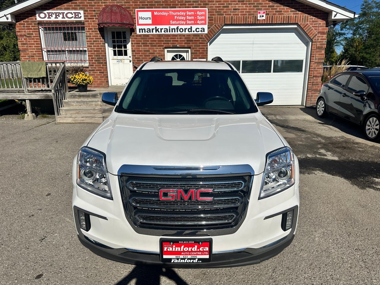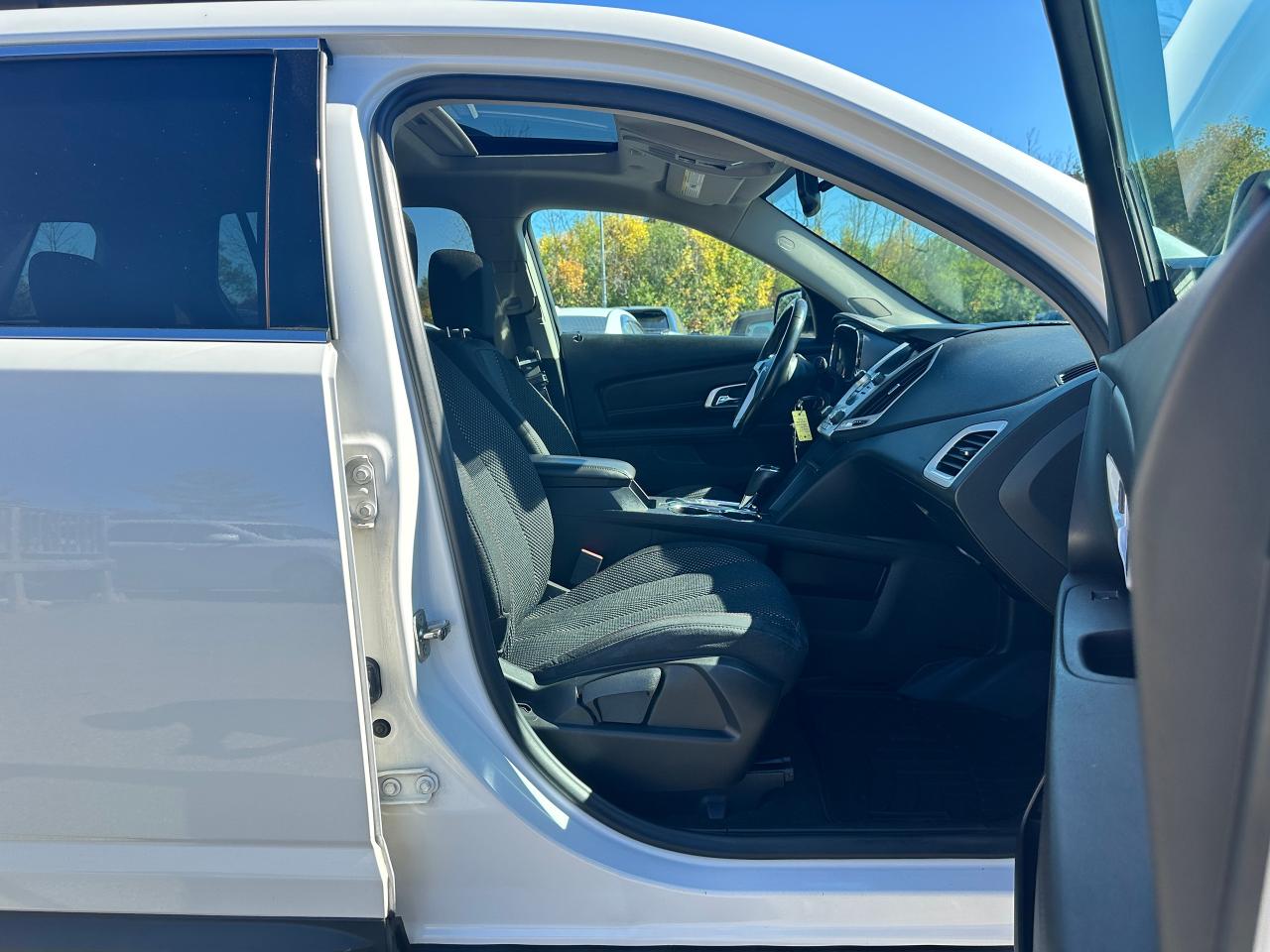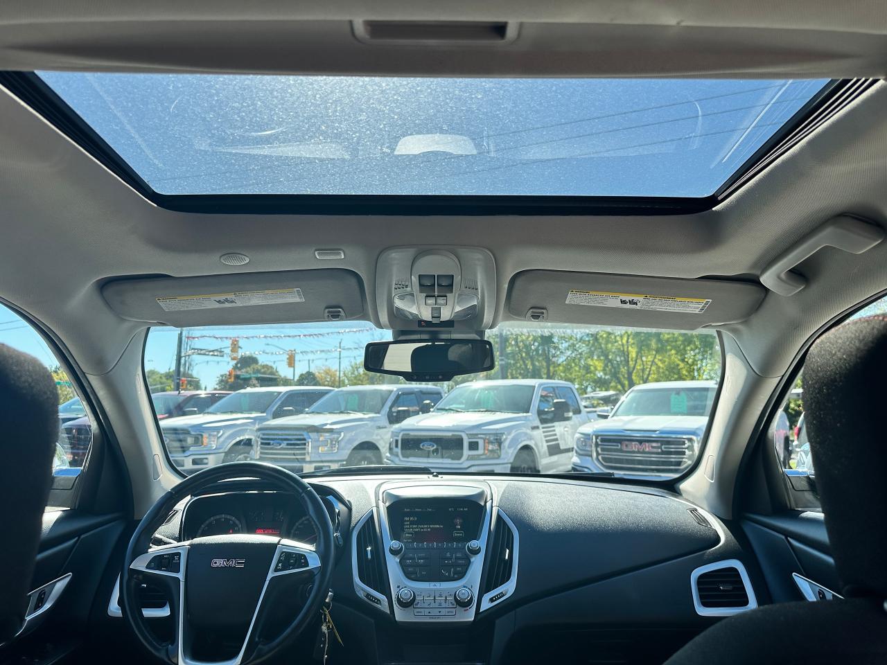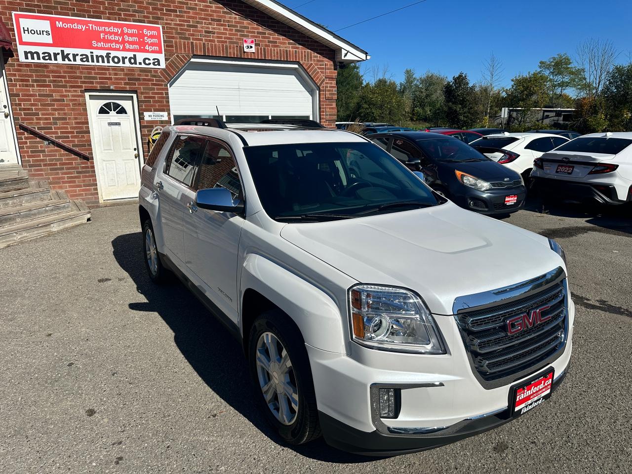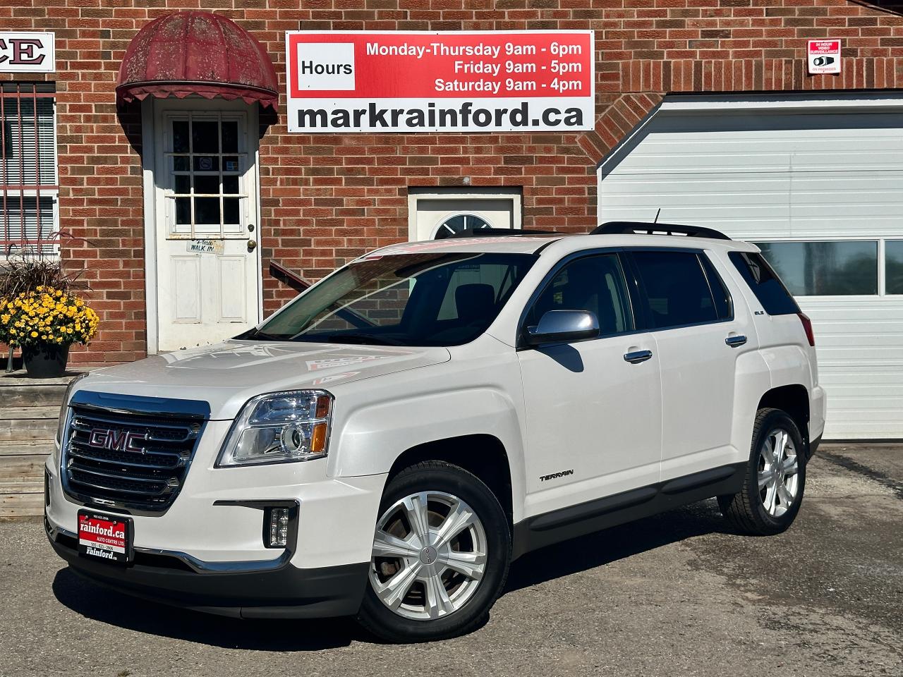 Super-Clean local GMC Terrain from Peterborough/Oshawa, ON! This SLE2 AWD model looks nice in its White paint and factory alloy wheels, with great options inside and out! The exterior features keyless entry with remote start, headlights and foglights, tinted privacy glass, a factory power sunroof, roof rack rails, a trailer hitch, chromed accents, a peppy fuel-efficient 2.4L 4-cylinder Engine and Automatic transmission powering the All-Wheel-Drive system! The interior is clean and comfortable with heated cloth front seats with driver's power adjustment and lumbar controls, power door locks, windows and mirrors, spacious rear seating and cargo area with cargo net, red accent stitching, a leather wrapped steering wheel with Audio and Cruise controls, an easy to read and use gauge cluster, central touch screen AM/FM/XM Satellite Radio with Bluetooth, Navigation and Backup Camera, A/C climate control with front and rear window defrost settings, ECO driving mode for improved fuel economy, USB/12V accessory ports, all-weather floor mats and more!