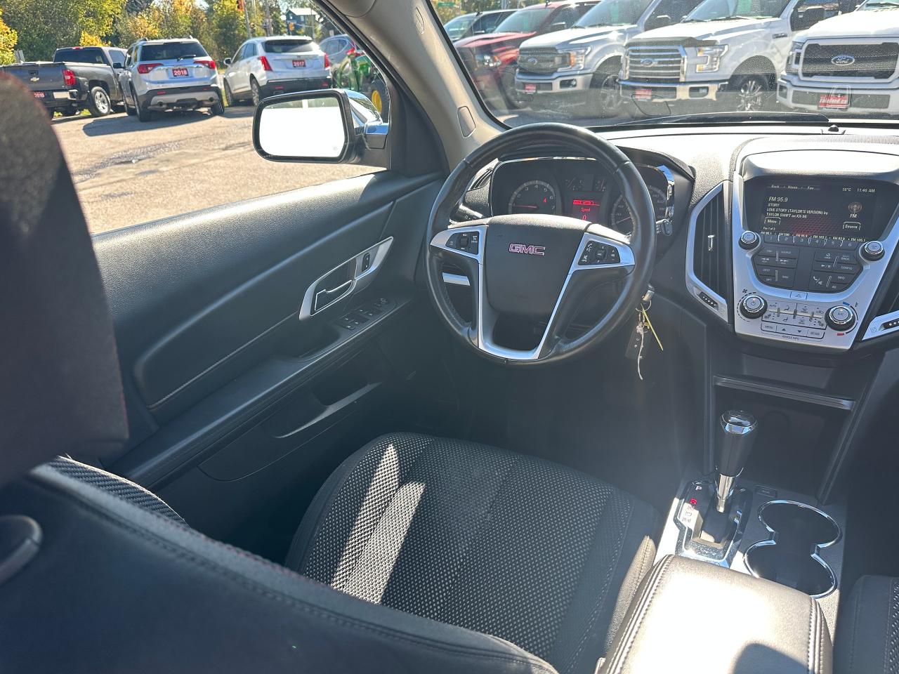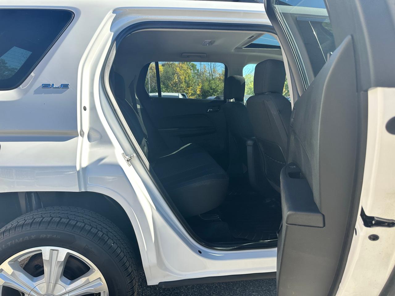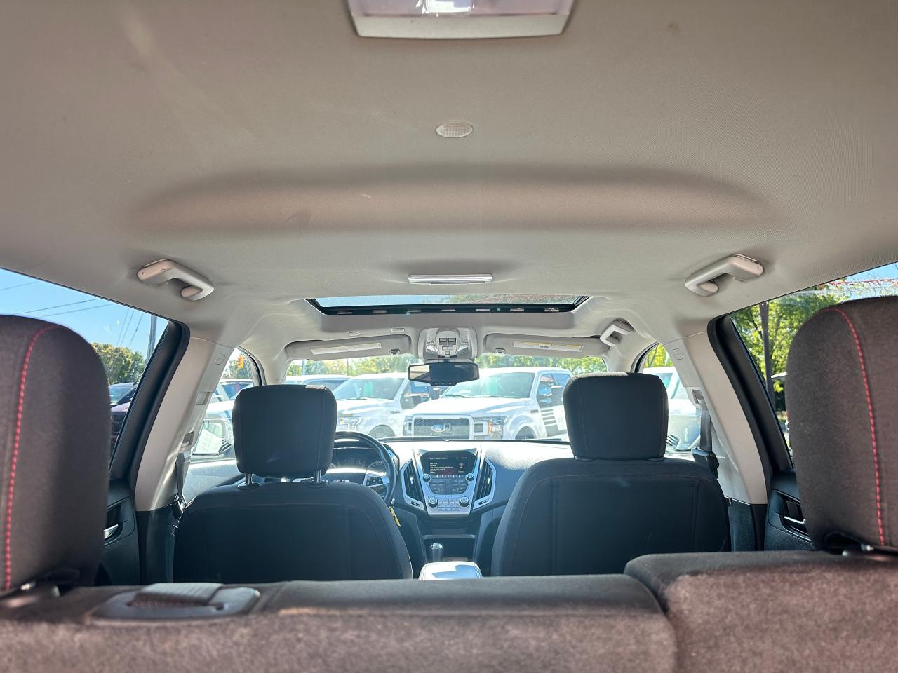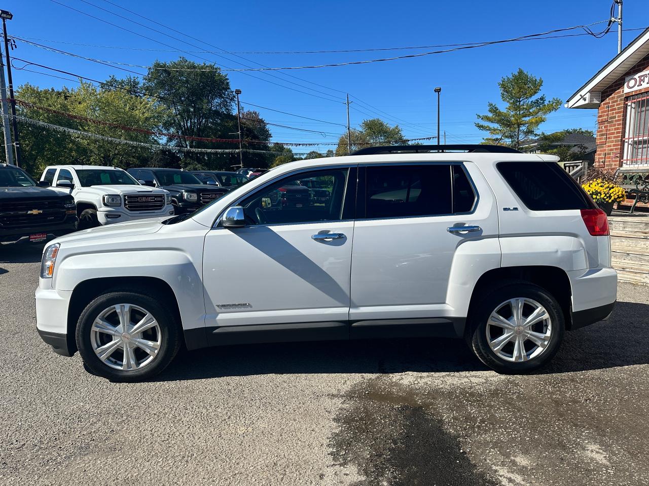 Super-Clean local GMC Terrain from Peterborough/Oshawa, ON! This SLE2 AWD model looks nice in its White paint and factory alloy wheels, with great options inside and out! The exterior features keyless entry with remote start, headlights and foglights, tinted privacy glass, a factory power sunroof, roof rack rails, a trailer hitch, chromed accents, a peppy fuel-efficient 2.4L 4-cylinder Engine and Automatic transmission powering the All-Wheel-Drive system! The interior is clean and comfortable with heated cloth front seats with driver's power adjustment and lumbar controls, power door locks, windows and mirrors, spacious rear seating and cargo area with cargo net, red accent stitching, a leather wrapped steering wheel with Audio and Cruise controls, an easy to read and use gauge cluster, central touch screen AM/FM/XM Satellite Radio with Bluetooth, Navigation and Backup Camera, A/C climate control with front and rear window defrost settings, ECO driving mode for improved fuel economy, USB/12V accessory ports, all-weather floor mats and more!