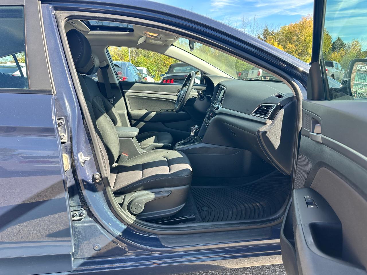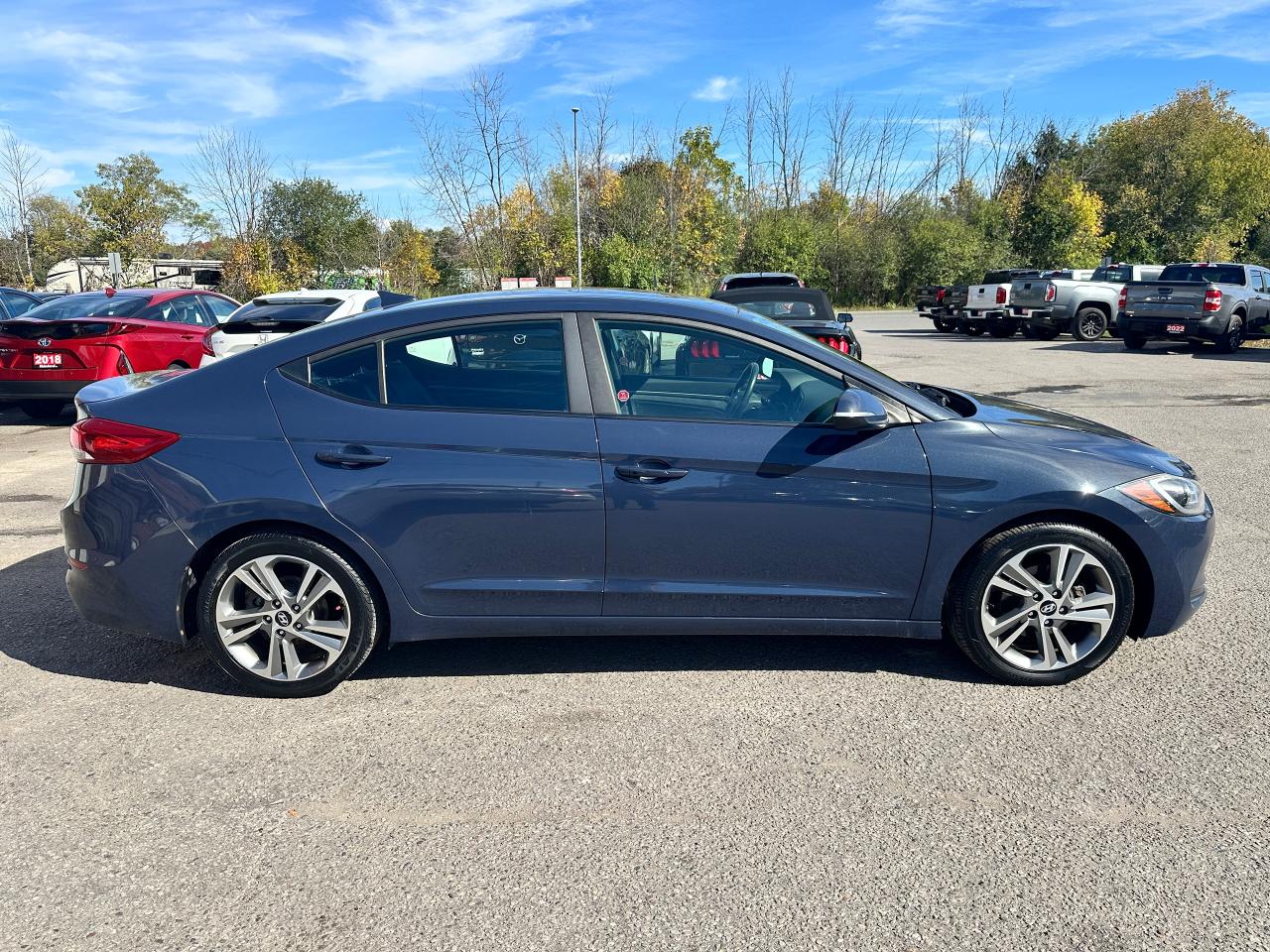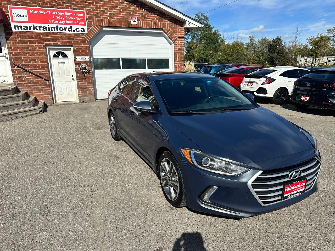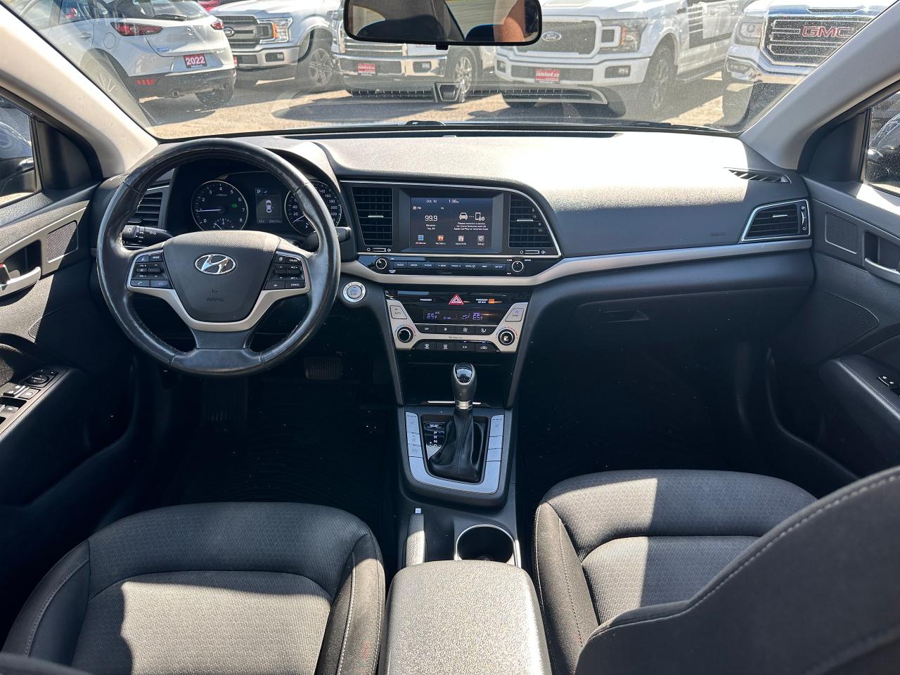 Super-Clean local Hyundai Elantra from Bowmanville, ON! This One Owner GLS model looks great in its Grey/Blue paint with nice options inside and out! The exterior features keyless entry with proximity keys, a large factory sunroof, colour-matched side mirrors with integrated turn signals, blind spot monitors, gorgeous factory alloy wheels, a peppy fuel-efficient 2.0L 4-cylinder Engine and Automatic transmission! The interior is clean and comfortable with heated cloth seats front and rear, power door locks, windows and mirrors, a heated leather wrapped steering wheel with Audio and Cruise controls, an easy to read and use gauge cluster, push button start, a large central touch screen AM/FM/XM Satellite Radio with Bluetooth, Apple CarPlay, Android Auto and Backup Camera, Dual-Zone A/C climate control with front and rear window defrost settings, USB/AUX/12V accessory ports, ECO/Sport Driving Modes, and more!
