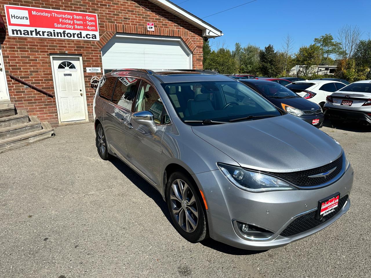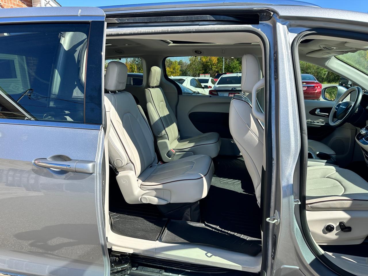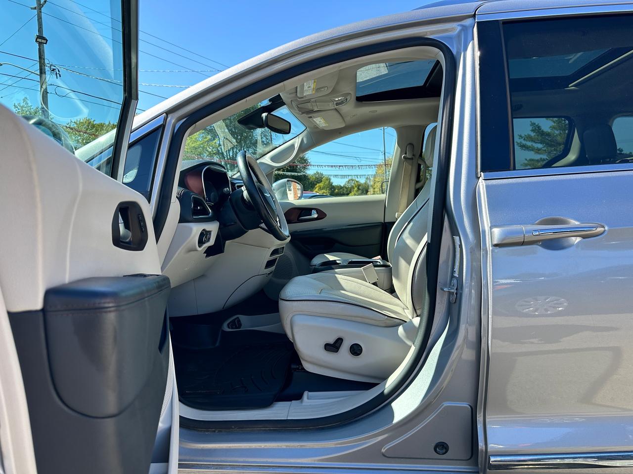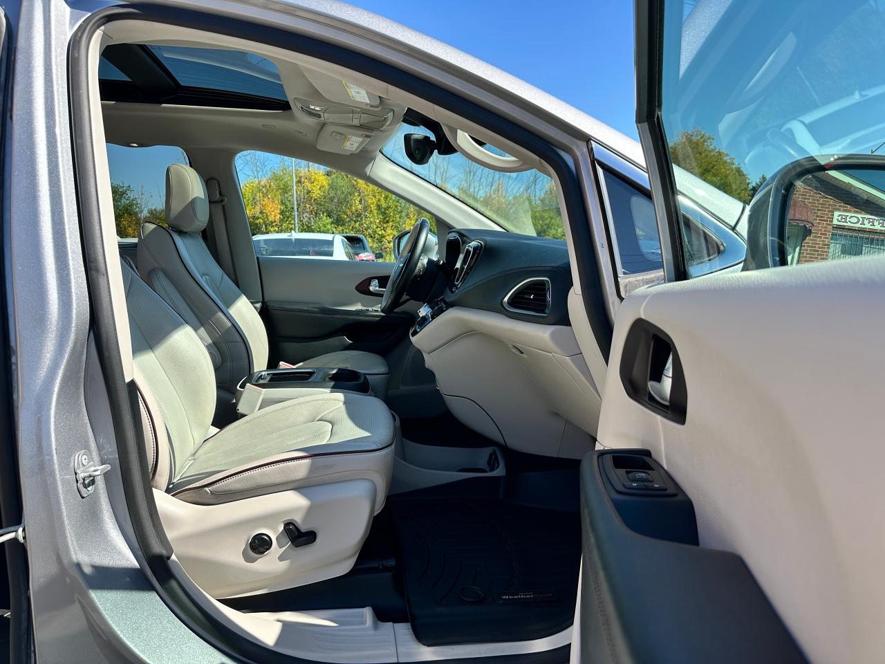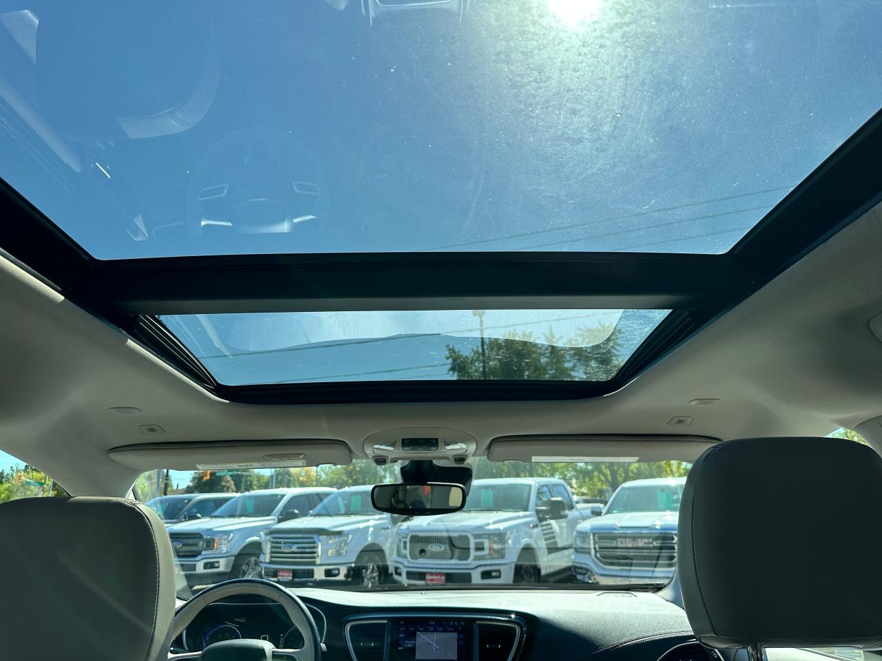 WOW! Super-Clean and Sharp-looking Chrysler Pacifica from Southampton, ON! This Limited 7-Passenger model looks amazing in its Silver paint and Accented Interior, with fantastic options inside and out! The exterior features keyless entry with remote start and proximity keys, remote power sliding doors and rear liftgate, a HUGE Panoramic Sunroof and Rear Moonroof, Automatic headlights, tinted privacy glass, driver assist systems including adaptive cruise controls, lane keeping assist, parking sensors and blind spot monitors, roof rack rails, a sleek rear spoiler, gorgeous factory alloy wheels, a powerful 3.6L V6 Engine and Automatic transmission! The interior is clean and comfortable with heated and cooled power adjustable front leather seats with lumbar controls and driver's memory settings, heated mid row seats and power stowing rear row, power door locks, windows and mirrors, a two-tone leather wrapped heated steering wheel with Audio and Cruise controls, push button start, a large central touch screen AM/FM/XM Satellite HD Radio with Bluetooth, Apple CarPlay, Android Auto, Navigation, SkyView Cameras and Backup Camera, Auto-Stop/Start Override button, Multi-Zone A/C climate control with front and rear window defrost settings, USB/AUX/12V accessory ports, universal garage door openers, and more! This Van has TONS of Features waiting for you to Discover!