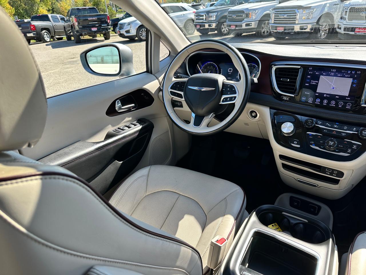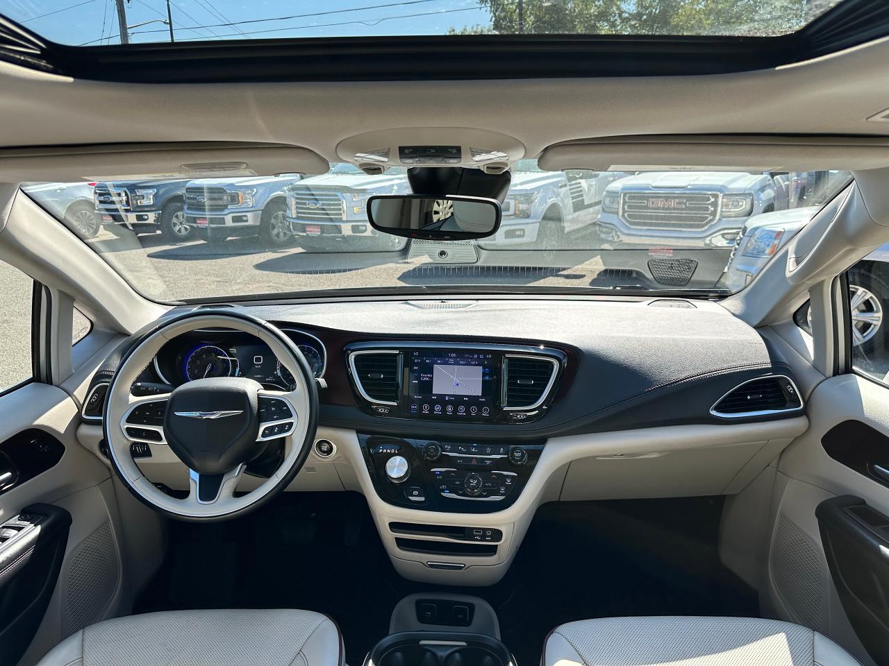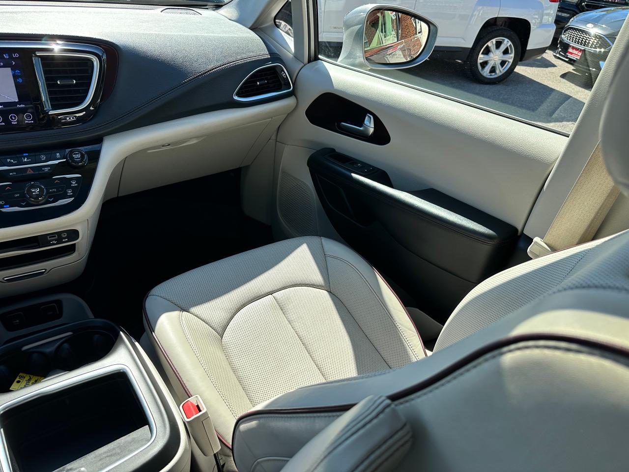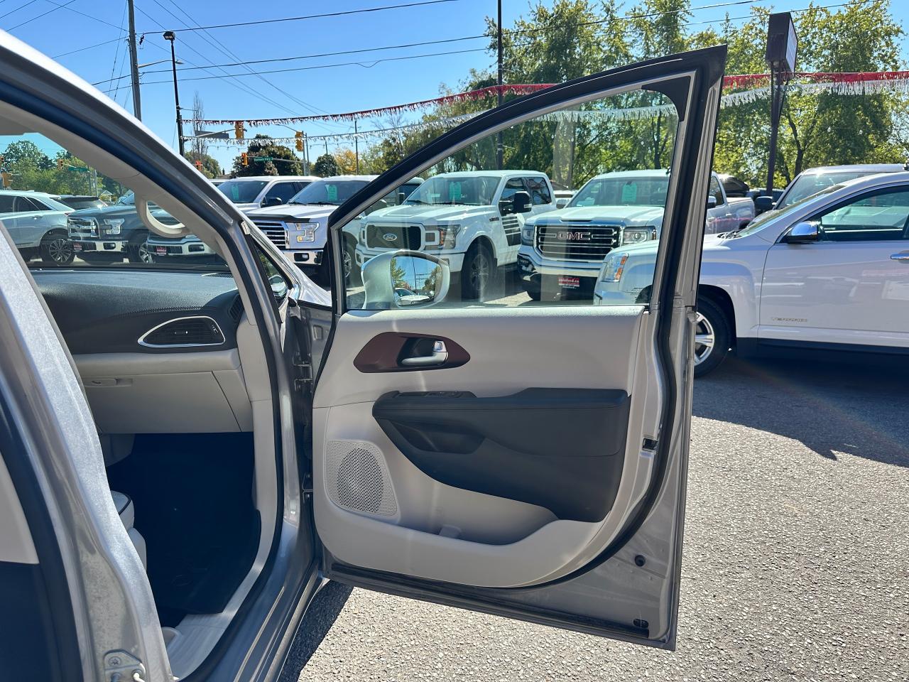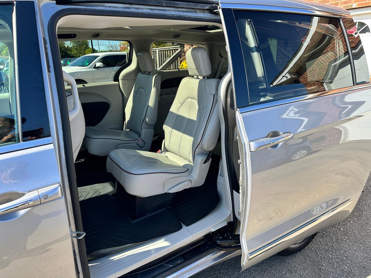 WOW! Super-Clean and Sharp-looking Chrysler Pacifica from Southampton, ON! This Limited 7-Passenger model looks amazing in its Silver paint and Accented Interior, with fantastic options inside and out! The exterior features keyless entry with remote start and proximity keys, remote power sliding doors and rear liftgate, a HUGE Panoramic Sunroof and Rear Moonroof, Automatic headlights, tinted privacy glass, driver assist systems including adaptive cruise controls, lane keeping assist, parking sensors and blind spot monitors, roof rack rails, a sleek rear spoiler, gorgeous factory alloy wheels, a powerful 3.6L V6 Engine and Automatic transmission! The interior is clean and comfortable with heated and cooled power adjustable front leather seats with lumbar controls and driver's memory settings, heated mid row seats and power stowing rear row, power door locks, windows and mirrors, a two-tone leather wrapped heated steering wheel with Audio and Cruise controls, push button start, a large central touch screen AM/FM/XM Satellite HD Radio with Bluetooth, Apple CarPlay, Android Auto, Navigation, SkyView Cameras and Backup Camera, Auto-Stop/Start Override button, Multi-Zone A/C climate control with front and rear window defrost settings, USB/AUX/12V accessory ports, universal garage door openers, and more! This Van has TONS of Features waiting for you to Discover!