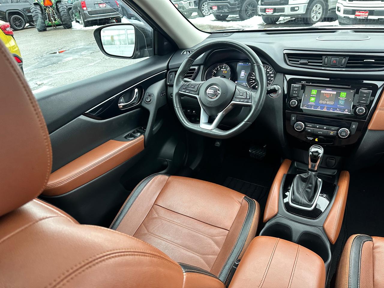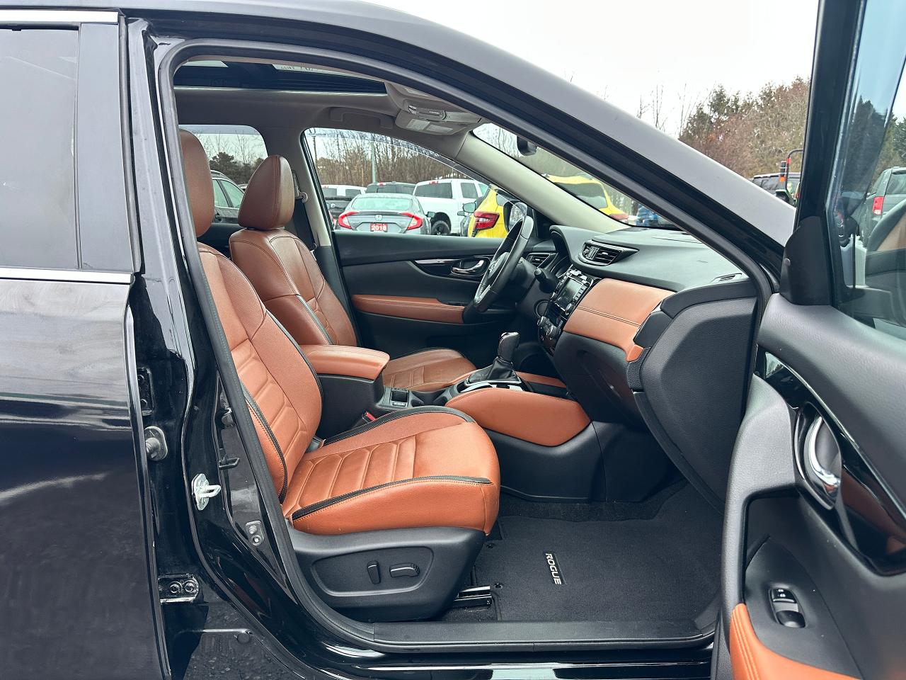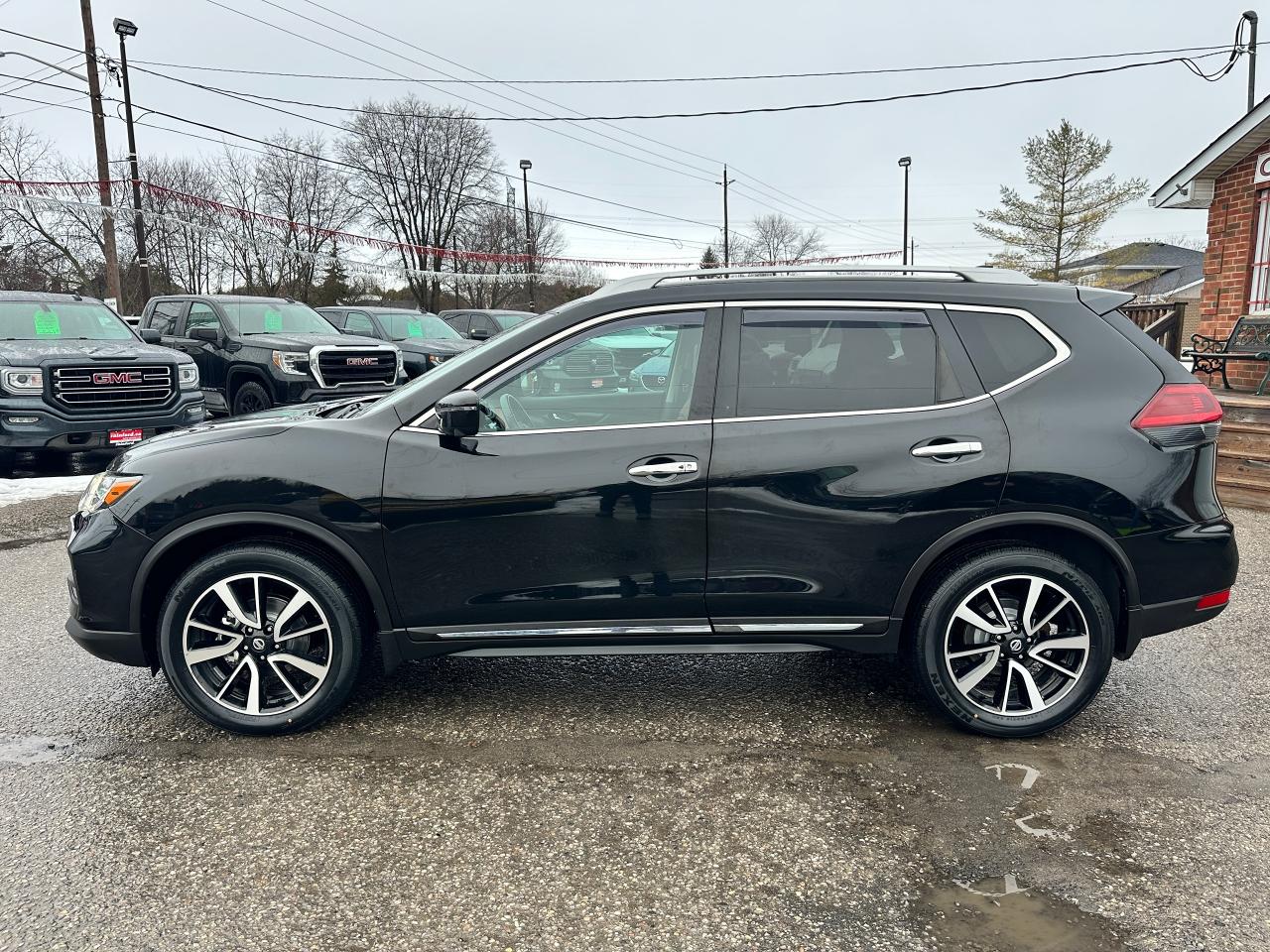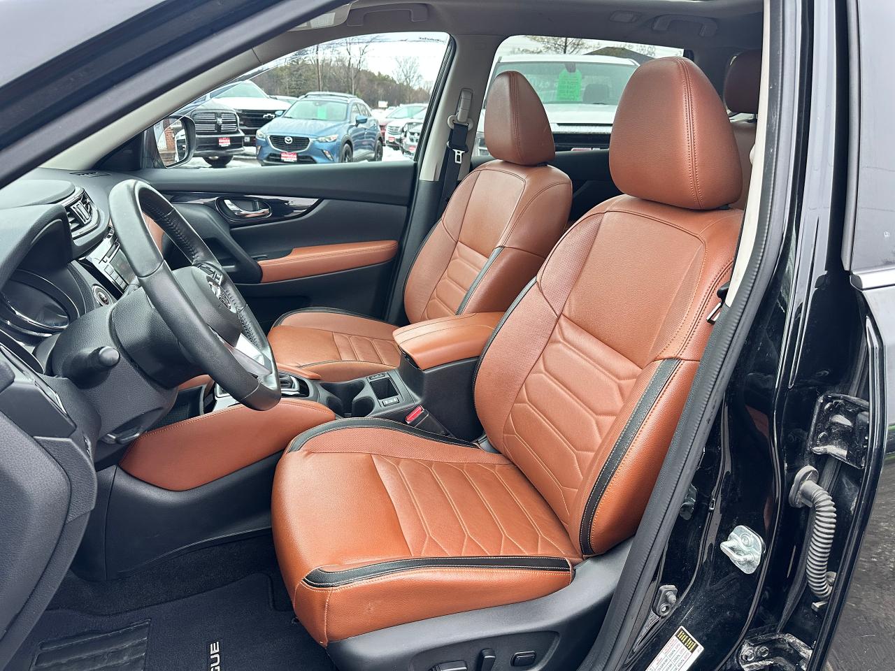 WOW! Stunning LOW-KM, Nissan Rogue from Scarborough, ON! This SL AWD model looks incredible in its Black paint and Factory alloy wheels, with amazing options and styling inside and out! The exterior features keyless entry with remote start and proximity key, remote power liftgate, a HUGE panoramic powered sunroof, automatic headlights, foglights, roof rack rails, tinted privacy glass, Nissan safety shield including blind spot monitors, forward collision/adaptive cruise settings, 360 SkyView Cameras for parking assistance, colour-matched heated side mirrors with integrated turn signals, tinted privacy glass, a sleek rear spoiler, gorgeous machine finished factory alloy wheels with NEW All-Season tires freshly installed, a peppy fuel efficient 2.5L 4-Cylinder Engine and CVT Auto Transmission powering the All-Wheel-Drive System! The interior is very well appointed with Two-Tone Brown/Black leather interior/seating, heated power-adjustable front seating with driver's lumbar control and memory settings, power door locks, windows and mirrors, comfortable rear seating and large cargo area, a heated leather wrapped steering wheel with Audio and Cruise controls, push button start, an easy to read and use gauge cluster, a large central touch screen AM/FM/XM Satellite Radio with BOSE Premium Audio, Bluetooth, Navigation, Apple CarPlay, Android Auto, CD Player, and Parking Assist Cameras, Dual-Zone A/C climate controls with front and rear window defrost settings, Sport/Eco Driving Modes, USB/AUX/12V accessory ports, and more!