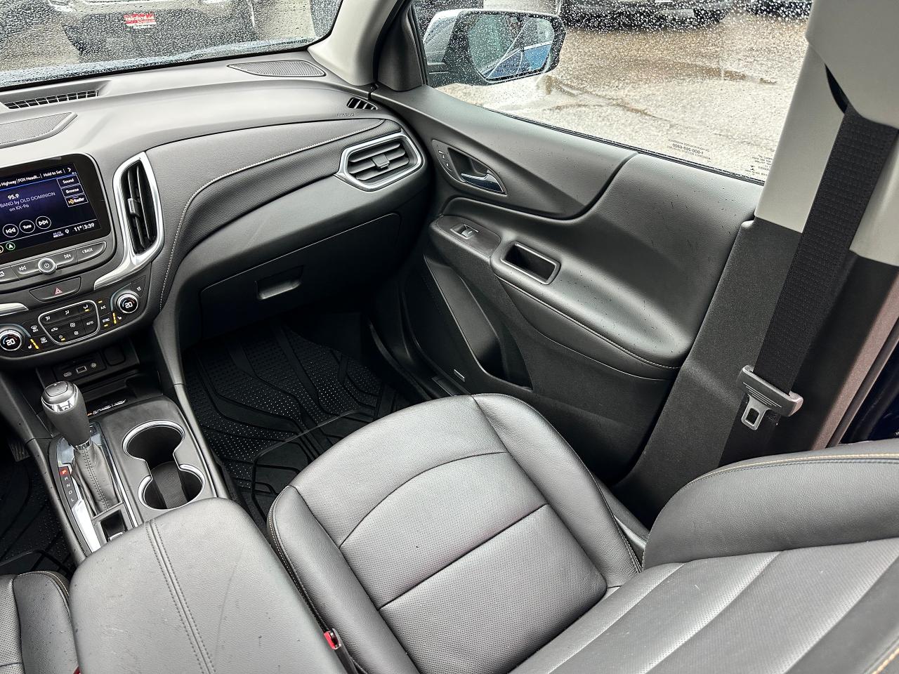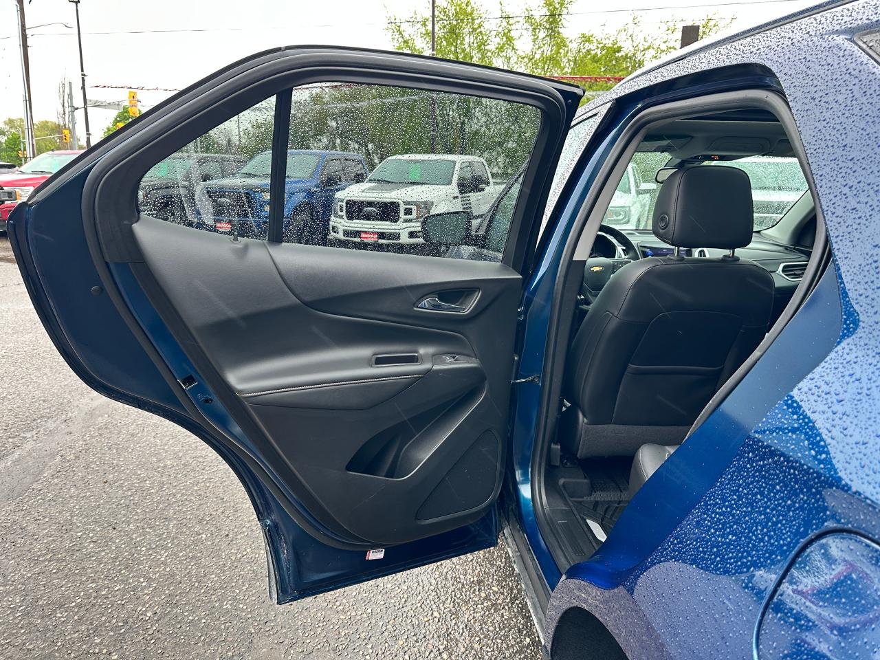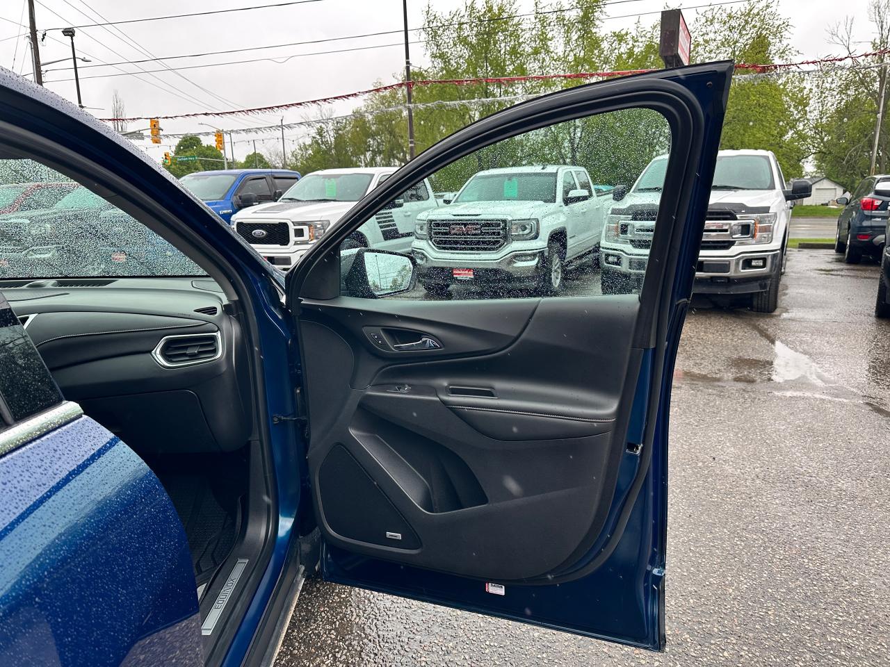 Super-Clean and well-optioned Chevrolet Equinox from Peterborough, ON! This Premier AWD model looks incredible in its Blue paint and factory alloy wheels, and is LOADED UP inside and out with amazing options! The exterior features keyless entry with remote start, proximity keys, remote power liftgate, automatic headlights and highbeams, foglights, a HUGE panoramic sunroof, roof rack rails, driver assists including forward collision warning, lane departure warning, adaptive cruise controls, skyview camera, parking sensors and blind spot monitor, gorgeous split spoke factory alloy wheels, tinted reat privacy glass, a sporty dual exhaust, trailer hitch, a peppy fuel efficient 2.0L 4-cylinder Turbocharged Engine and Automatic transmission powering the All-Wheel-Drive System! The interior is clean and comfortable with heated and cooled front leather seats and rear heated seats, power-adjustable front seats with lumbar controls and driver's memory settings, all-weather Chevrolet floor mats and cargo mats, power door locks, windows and mirrors, a heated leather wrapped steering wheel with audio and cruise controls, an easy to read and use gauge cluster, push button start, a large central touch screen AM/FM/XM Satellite HD Radio with BOSE Premium Audio, Bluetooth, Apple CarPlay, Android Auto, WiFi Settings, Navigation, Backup Camera and Park assist cameras, Dual-Zone A/C climate control with front and rear window defrost settings, USB/USB-C/AUX/12V accessory ports, wireless device charger, TOW/Haul Mode, Universal Garage door opener, and more!