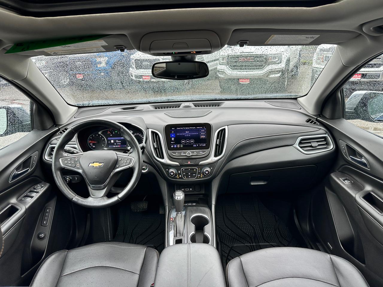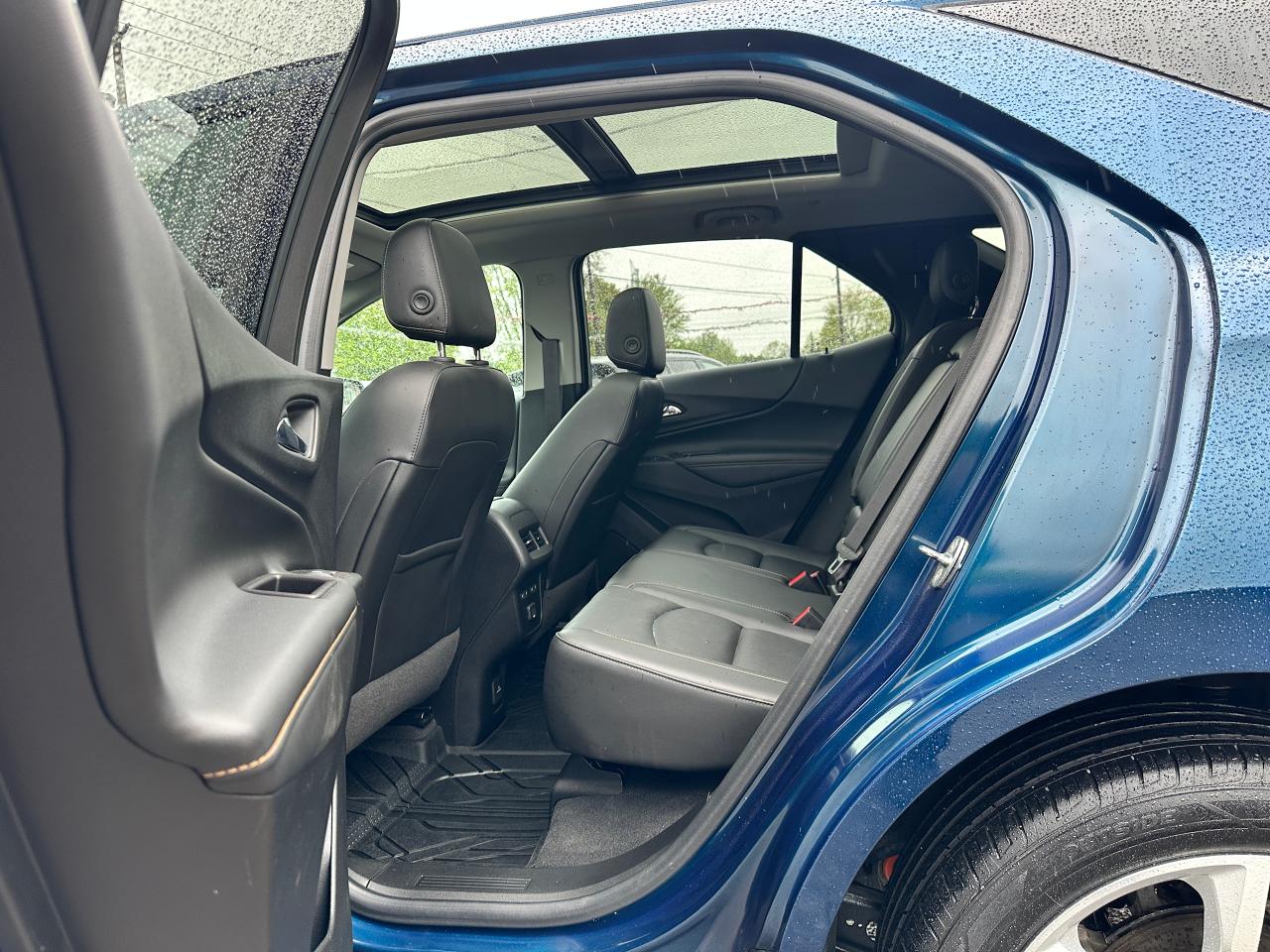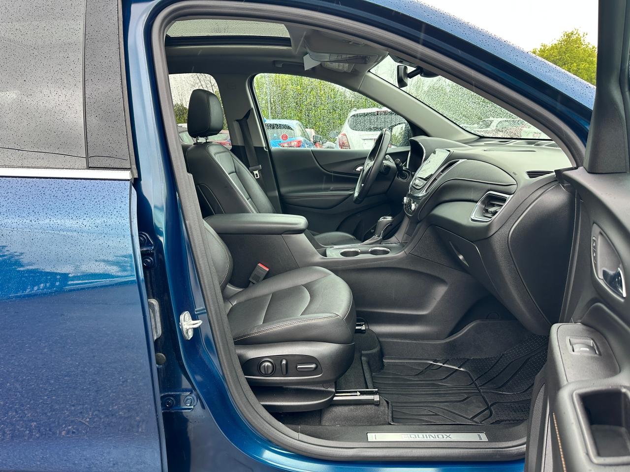 Super-Clean and well-optioned Chevrolet Equinox from Peterborough, ON! This Premier AWD model looks incredible in its Blue paint and factory alloy wheels, and is LOADED UP inside and out with amazing options! The exterior features keyless entry with remote start, proximity keys, remote power liftgate, automatic headlights and highbeams, foglights, a HUGE panoramic sunroof, roof rack rails, driver assists including forward collision warning, lane departure warning, adaptive cruise controls, skyview camera, parking sensors and blind spot monitor, gorgeous split spoke factory alloy wheels, tinted reat privacy glass, a sporty dual exhaust, trailer hitch, a peppy fuel efficient 2.0L 4-cylinder Turbocharged Engine and Automatic transmission powering the All-Wheel-Drive System! The interior is clean and comfortable with heated and cooled front leather seats and rear heated seats, power-adjustable front seats with lumbar controls and driver's memory settings, all-weather Chevrolet floor mats and cargo mats, power door locks, windows and mirrors, a heated leather wrapped steering wheel with audio and cruise controls, an easy to read and use gauge cluster, push button start, a large central touch screen AM/FM/XM Satellite HD Radio with BOSE Premium Audio, Bluetooth, Apple CarPlay, Android Auto, WiFi Settings, Navigation, Backup Camera and Park assist cameras, Dual-Zone A/C climate control with front and rear window defrost settings, USB/USB-C/AUX/12V accessory ports, wireless device charger, TOW/Haul Mode, Universal Garage door opener, and more!