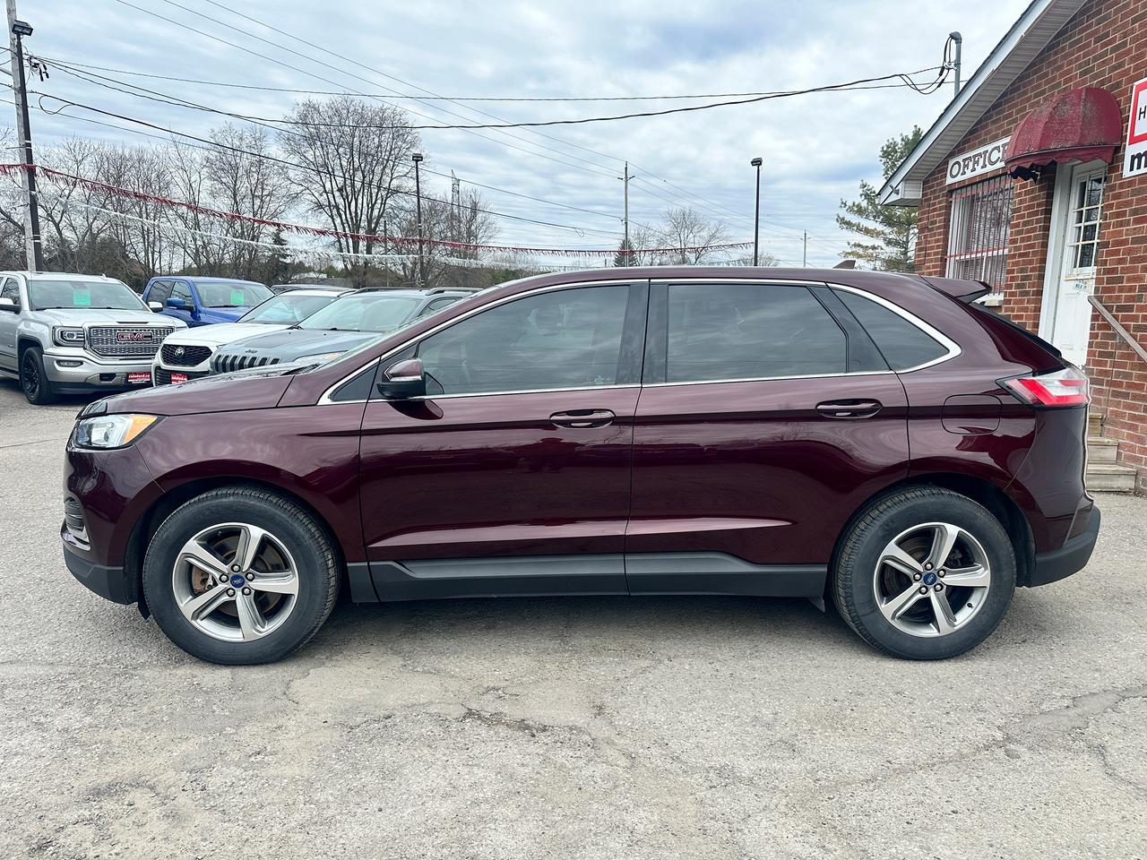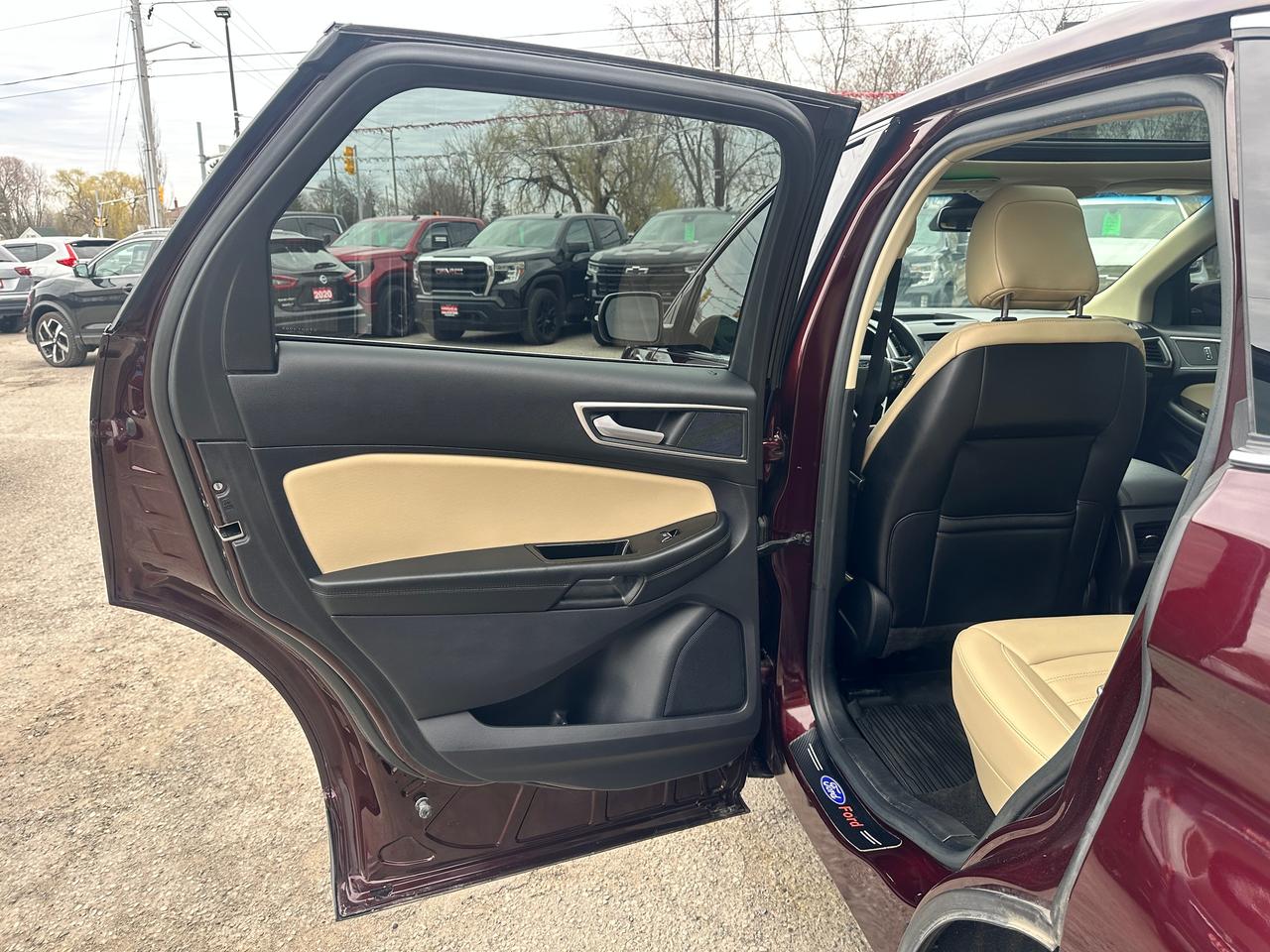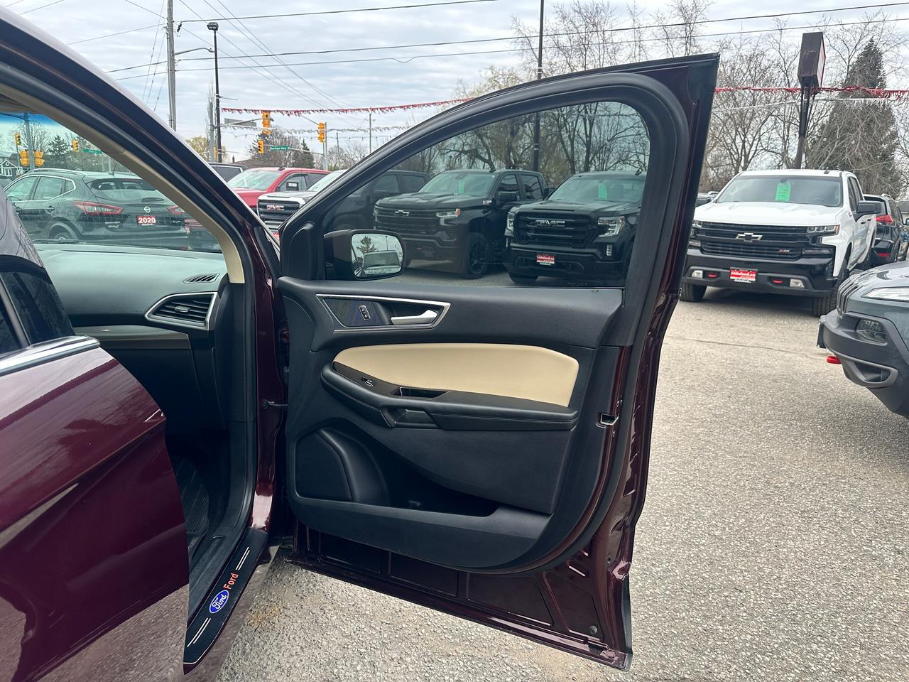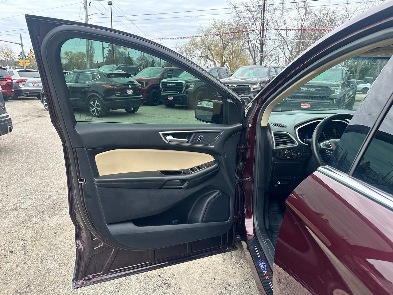 Super-Clean Ford Edge from Peterborough, ON! This SEL AWD model looks amazing in its Burgundy/Wine Paint and Factory alloy wheels, with great options inside and out! The exterior features keyless entry with remote start, proximity keys and remote power tailgate, a huge panoramic sunroof, automatic headlights, foglights, colour-matched side mirrors with integrated turn signals, forward collision warning, lane departure and adaptive cruise settings, rear parking sensors, tinted privacy glass, a sleek rear spoiler, sporty dual-rear exhaust, a trailer hitch, gorgeous factory alloy wheels, a peppy fuel efficient 2.0L 4-cylinder Engine and Automatic Transmission powering the All-Wheel-Drive system! The interior is clean and comfortable with heated leather front seats with power adjustment and driver's lumbar control, power door locks, windows and mirrors, all-weather floor mats, a heated leather wrapped steering wheel with Audio and Cruise controls, push button start, an easy-to-read and use gauge cluster, a large central touch screen AM/FM/XM Satellite Radio with Bluetooth, Navigation, Climate Settings, SmartPhone connectivity, and Backup Camera with Parking Sensor Display, Dual-Zone A/C climate controls with front and rear window defrost settings, Automatic Stop/Start-Overide button, Universal Garage Door openers, and more!