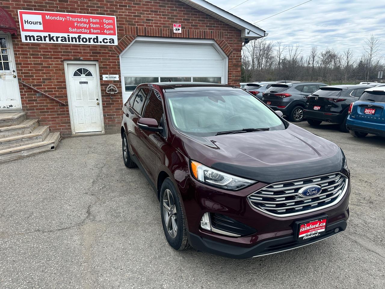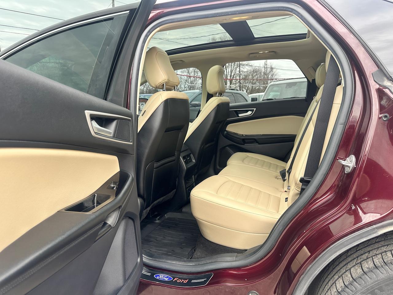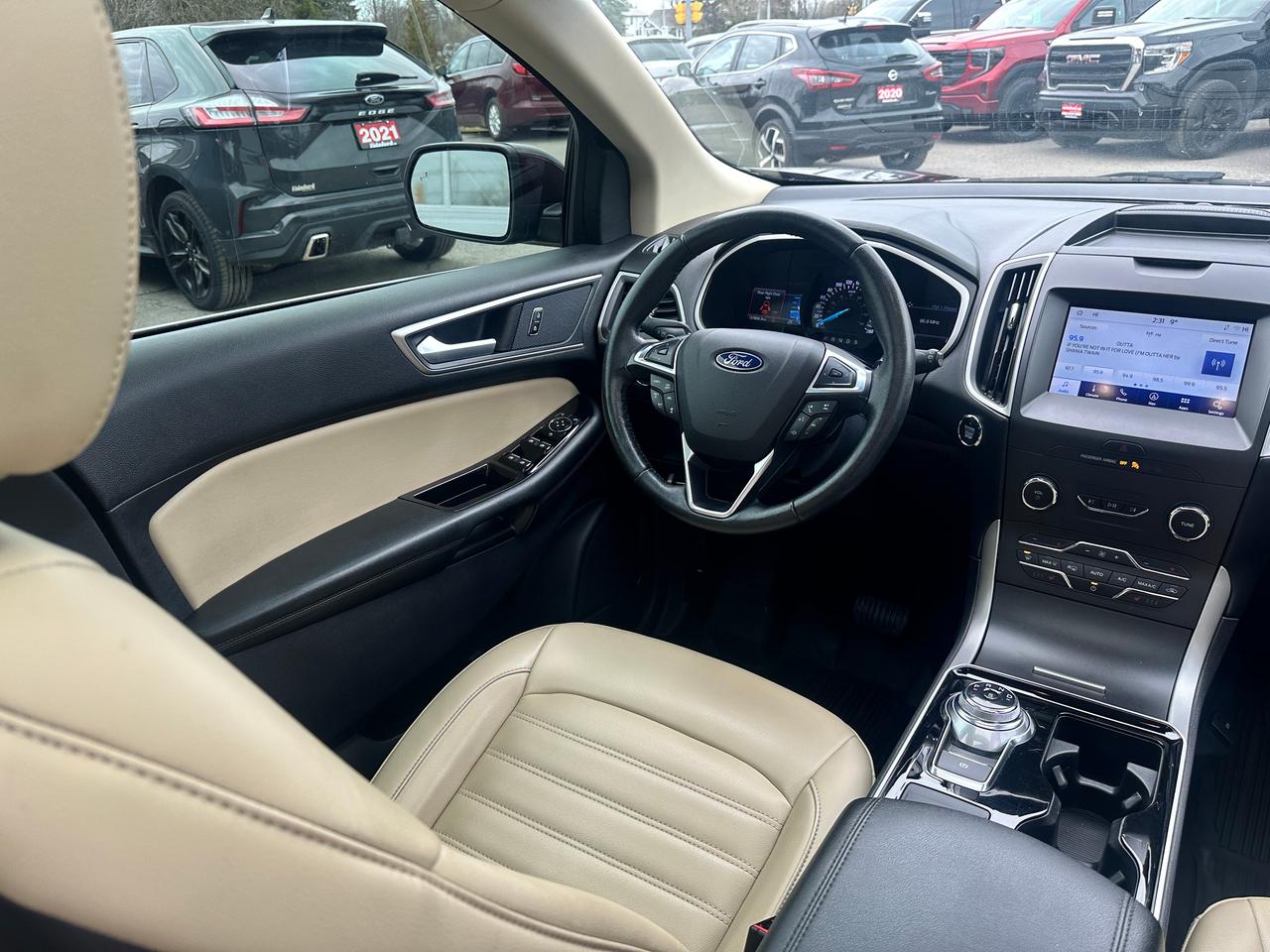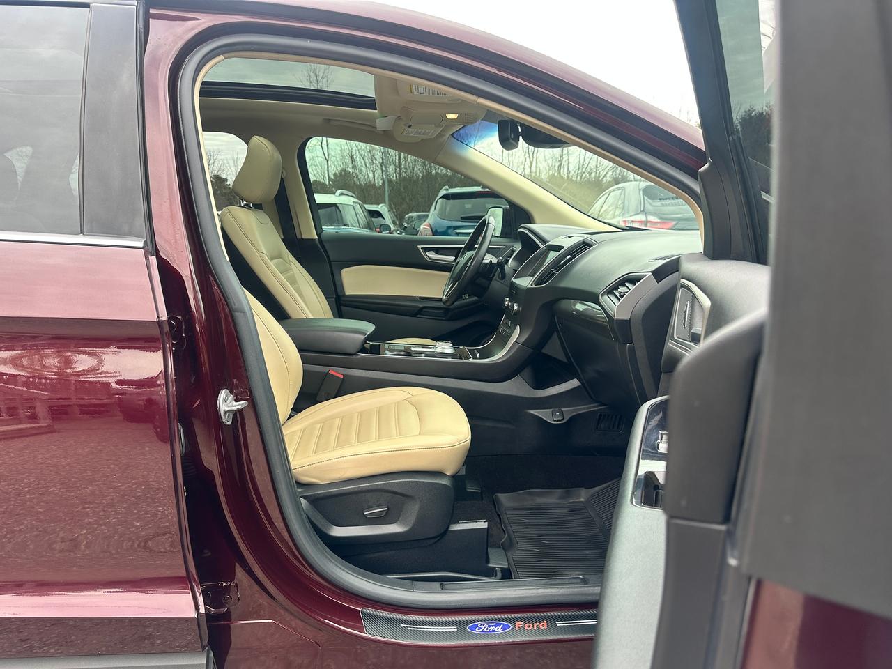 Super-Clean Ford Edge from Peterborough, ON! This SEL AWD model looks amazing in its Burgundy/Wine Paint and Factory alloy wheels, with great options inside and out! The exterior features keyless entry with remote start, proximity keys and remote power tailgate, a huge panoramic sunroof, automatic headlights, foglights, colour-matched side mirrors with integrated turn signals, forward collision warning, lane departure and adaptive cruise settings, rear parking sensors, tinted privacy glass, a sleek rear spoiler, sporty dual-rear exhaust, a trailer hitch, gorgeous factory alloy wheels, a peppy fuel efficient 2.0L 4-cylinder Engine and Automatic Transmission powering the All-Wheel-Drive system! The interior is clean and comfortable with heated leather front seats with power adjustment and driver's lumbar control, power door locks, windows and mirrors, all-weather floor mats, a heated leather wrapped steering wheel with Audio and Cruise controls, push button start, an easy-to-read and use gauge cluster, a large central touch screen AM/FM/XM Satellite Radio with Bluetooth, Navigation, Climate Settings, SmartPhone connectivity, and Backup Camera with Parking Sensor Display, Dual-Zone A/C climate controls with front and rear window defrost settings, Automatic Stop/Start-Overide button, Universal Garage Door openers, and more!