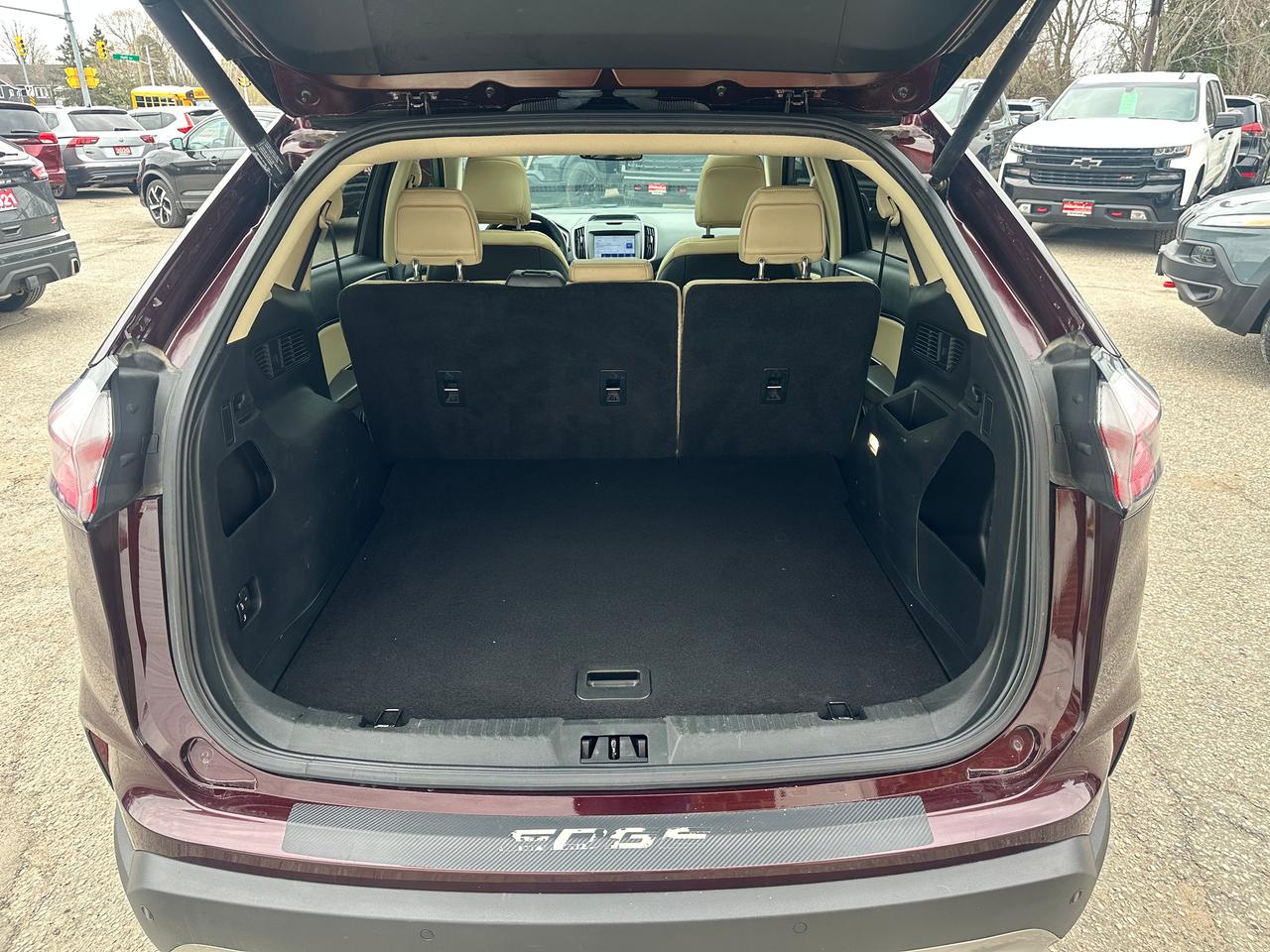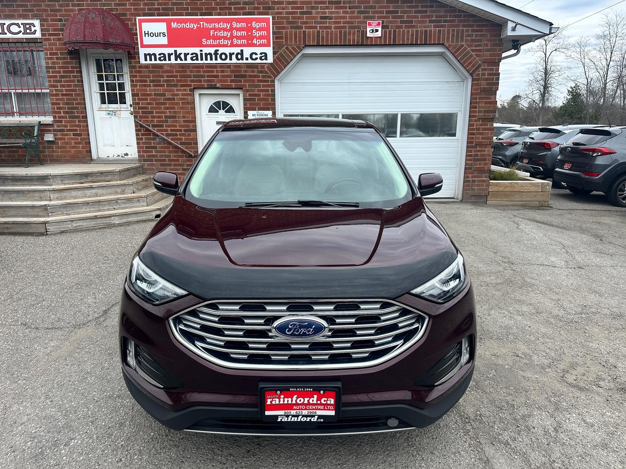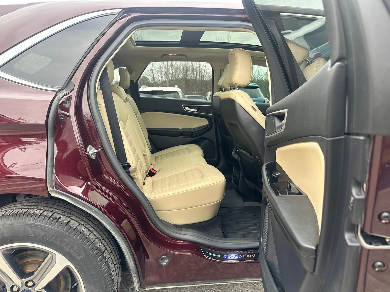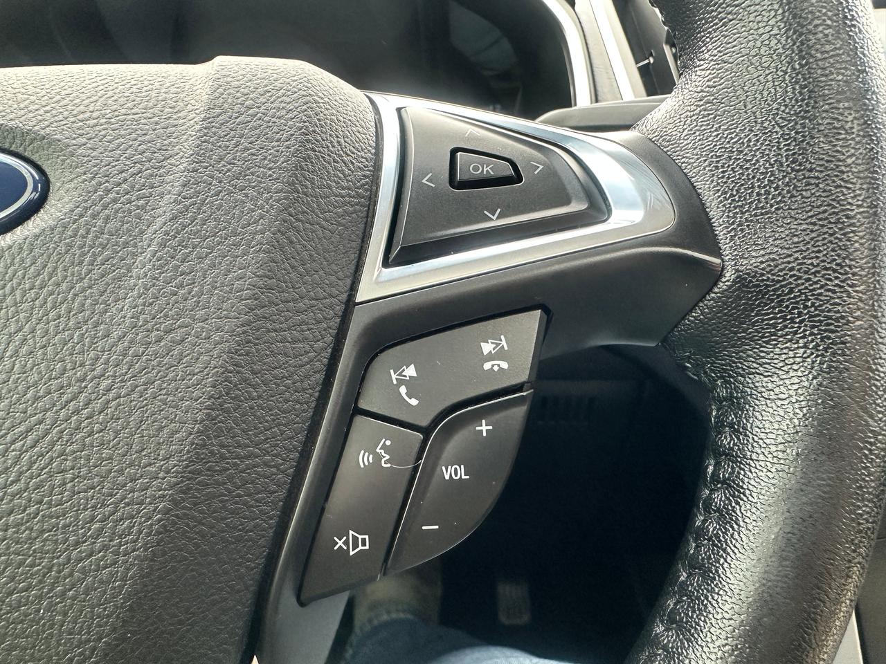 Super-Clean Ford Edge from Peterborough, ON! This SEL AWD model looks amazing in its Burgundy/Wine Paint and Factory alloy wheels, with great options inside and out! The exterior features keyless entry with remote start, proximity keys and remote power tailgate, a huge panoramic sunroof, automatic headlights, foglights, colour-matched side mirrors with integrated turn signals, forward collision warning, lane departure and adaptive cruise settings, rear parking sensors, tinted privacy glass, a sleek rear spoiler, sporty dual-rear exhaust, a trailer hitch, gorgeous factory alloy wheels, a peppy fuel efficient 2.0L 4-cylinder Engine and Automatic Transmission powering the All-Wheel-Drive system! The interior is clean and comfortable with heated leather front seats with power adjustment and driver's lumbar control, power door locks, windows and mirrors, all-weather floor mats, a heated leather wrapped steering wheel with Audio and Cruise controls, push button start, an easy-to-read and use gauge cluster, a large central touch screen AM/FM/XM Satellite Radio with Bluetooth, Navigation, Climate Settings, SmartPhone connectivity, and Backup Camera with Parking Sensor Display, Dual-Zone A/C climate controls with front and rear window defrost settings, Automatic Stop/Start-Overide button, Universal Garage Door openers, and more!