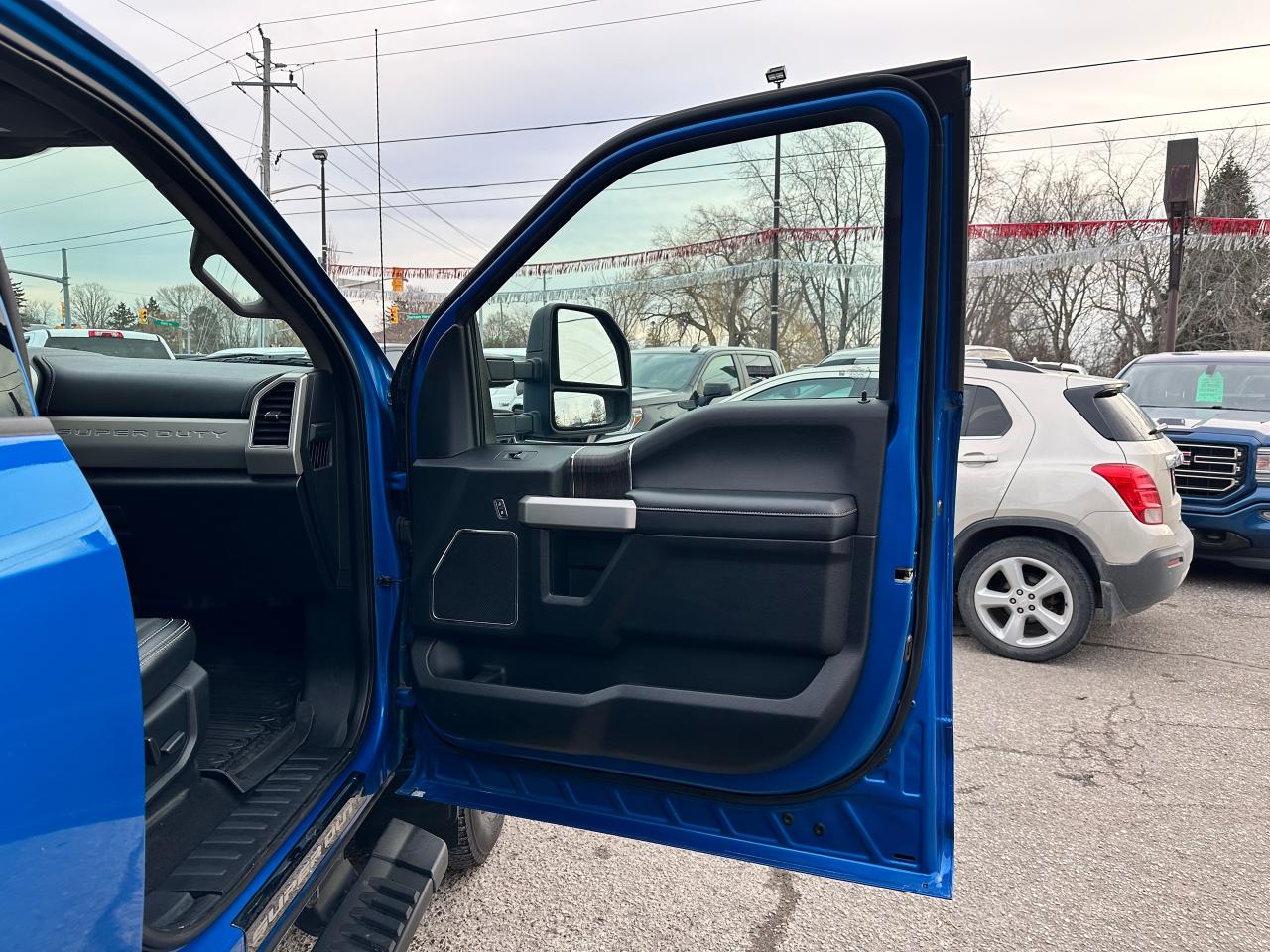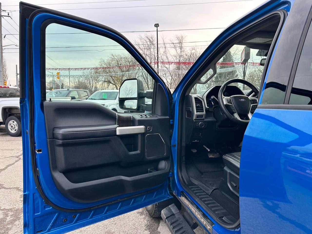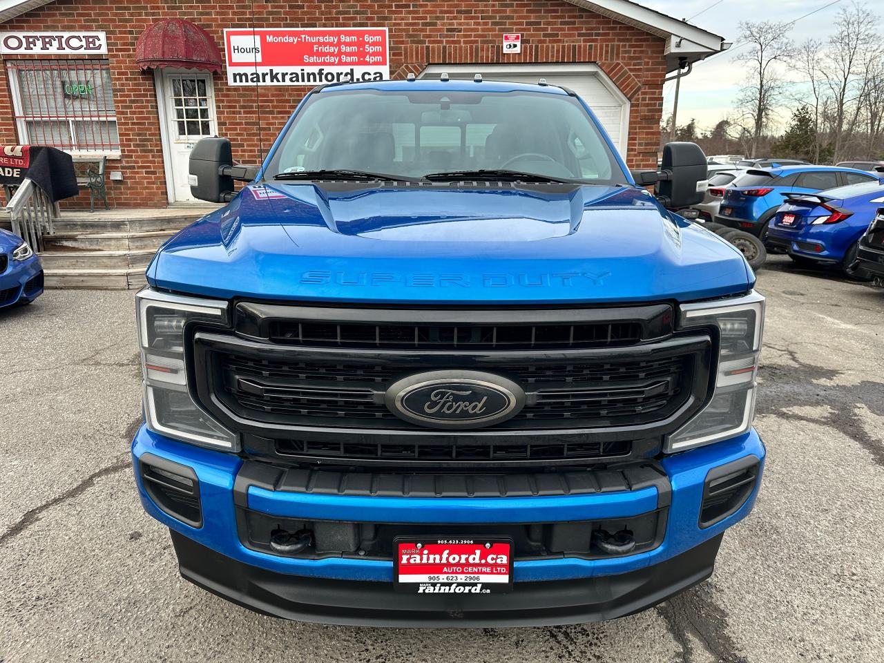 WOW! Showstopper of a Ford F250 from Kingston, ON! This LARIAT Crew Cab 4x4 model looks stunning in its beautiful Blue paint and Black Alloy wheels, with incredible power and options inside and out! The exterior features keyless entry with remote start, proximity keys and keycode entry, automatic headlights, foglights, enormous factory power sunroof, heated power folding side mirrors with integrated turn signals, front tow hooks, Black step sides, tinted privacy glass, power sliding rear window, roof line marker lights, a trailer hitch, 6.75ft Bed with spray-in FORD bedliner, integrated tailgate step, 5th Wheel reciever ready, auxillary bedside power outlets, Lariat badging, parking sensors, gorgoeus Black Alloy wheels, and a powerful 6.7L PowerStroke V8 Diesel Engine and Automatic transmission powering the 4x4 system! The interior is clean and comfortable with heated and cooled front leather seats with power adjustment, lumbar controls and drivers memory settings, heated rear leather seats, power door locks, windows and mirrors, power adjustable drivers pedals, power tailgate release, a leather wrapped steering wheel with Audio and Cruise controls, an easy-to-read and use guage cluster, push-button start, electronic 4x4 selection, integrated electronic trailer brake controller, a large central touch screen AM/FM/XM Satellite HD Radio with Premium Bang & Olufsen Audio, Navigation, Bluetooth, Backup Camera, Apple CarPlay, Android Auto and WiFi Settings, Dual Zone-A/C climate controls with front and rear window defrost settings, Wireless device charger, universal garage door opener, multiple Auxillary Switches, Sunshade controls, USB/USB-C/12V accessory ports and more!