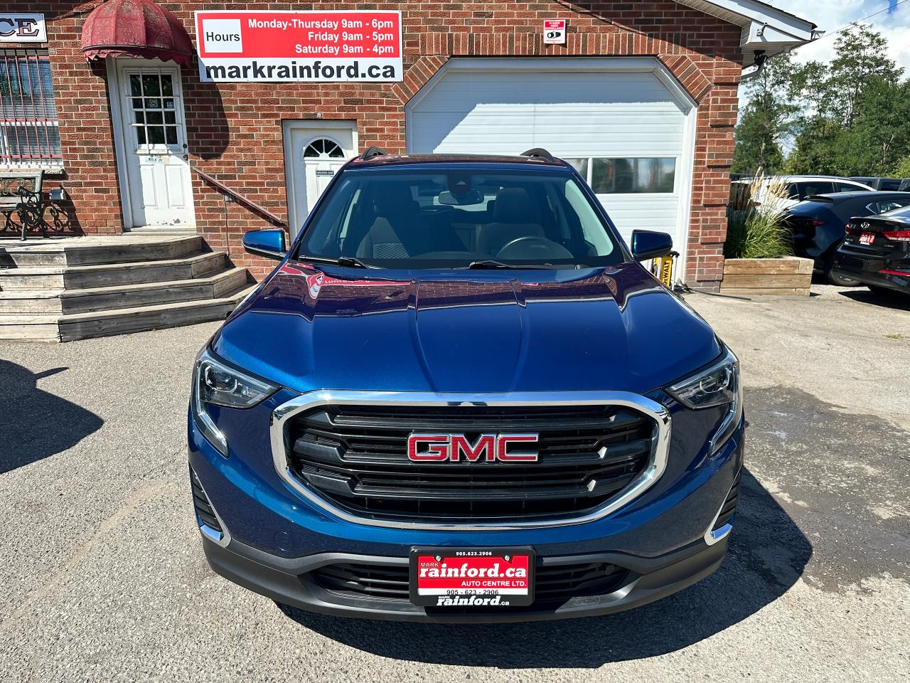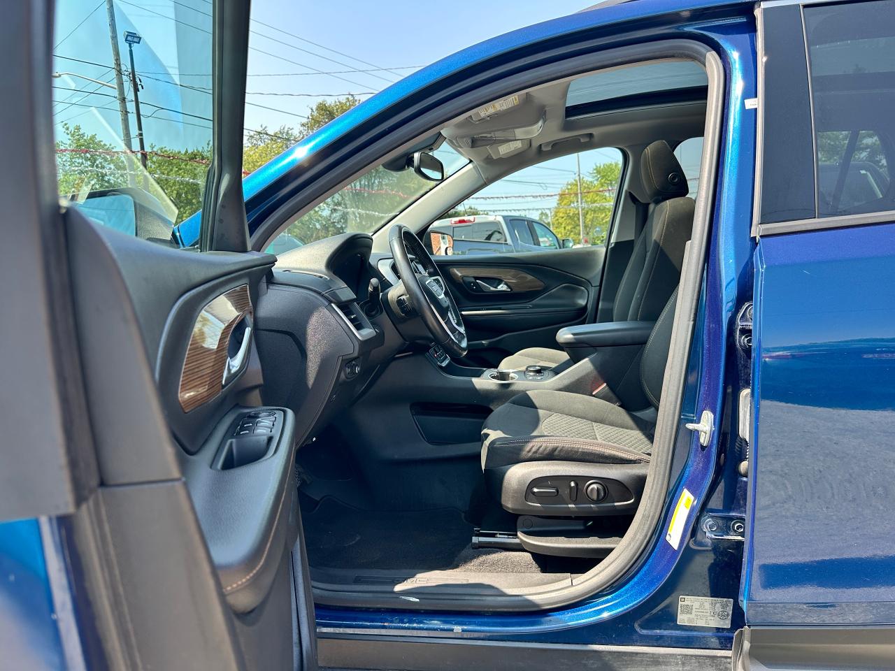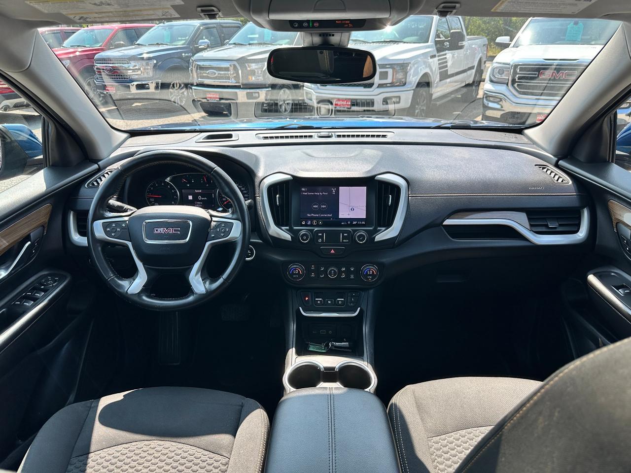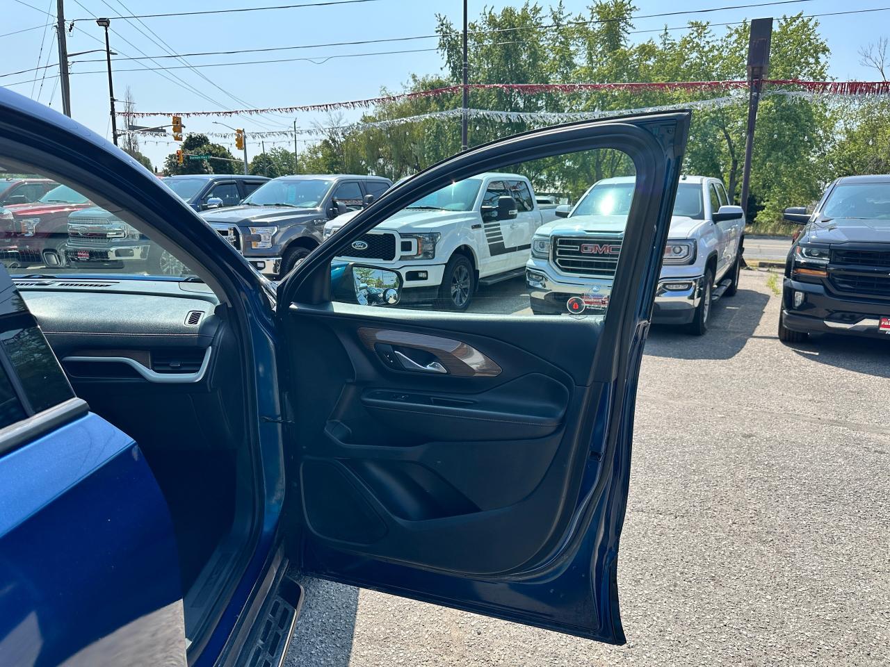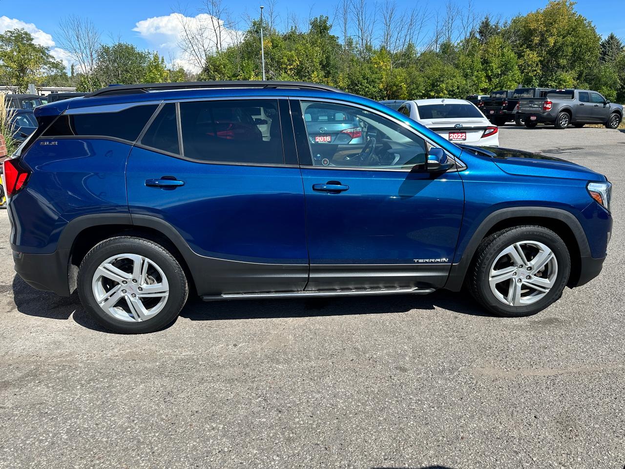 Super-Clean Local ONE-OWNER GMC Terrain from Bowmanville, ON! This SLE AWD model looks amazing in its beautiful Blue paint and factory alloy wheels, with great options inside and out! The exterior features keyless entry with remote start and proximity keys, automatic headlights, and automatic highbeams, colour-matched side mirrors with integrated turn signals, blind spot monitors, lande departure warning, a HUGE panoramic sunroof, roof rack rails, tinted privacy glass, forward collision warning, stepsides, trailer hitch, sporty dual rear exhaust, sleek rear spoiler, a peppy fuel efficient 2.0L 4-cylinder Engine and Automatic transmission powering the All-Wheel-Drive System! The interior is clean and comfortable with heated cloth seats with driver's power adjustment and lumbar controls, power door locks, windows and mirrors, a leather wrapped steering wheel with Audio and Cruise controls, push button start, an easy to read and use gauge cluster, a large central touch screen AM/FM/XM Satellite radio with Blueooth, Navigation, Apple CarPlay and Android Auto, and Backup Camera, Dual-Zone A/C climate control with front and rear window defrost settings, push button gear selection, USB/USB-C/AUX/12V/SD accessory ports and more!