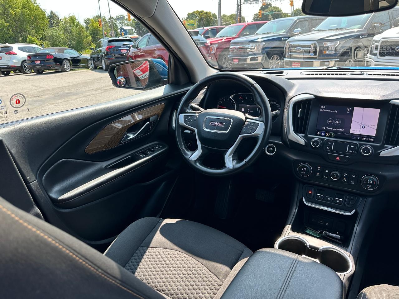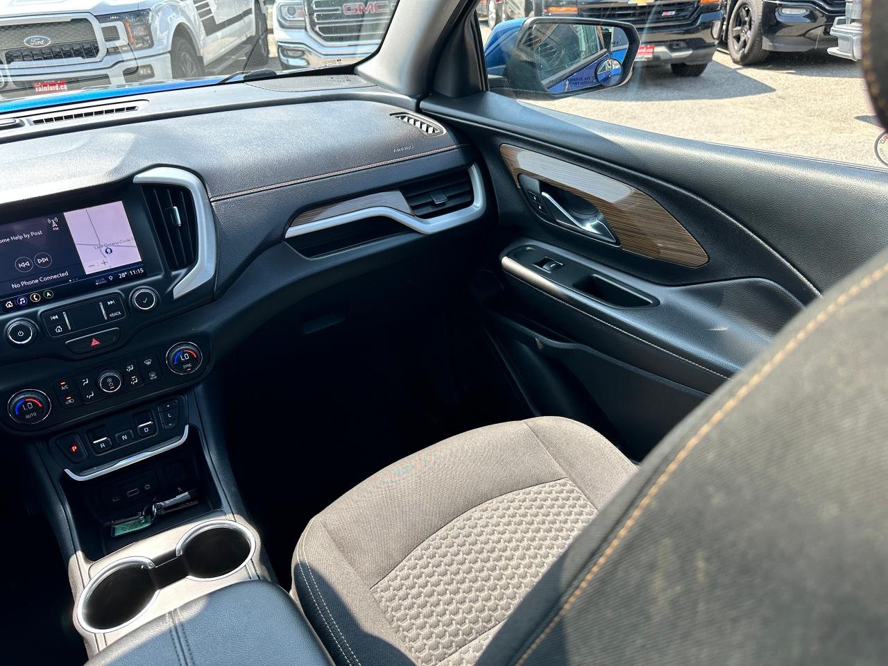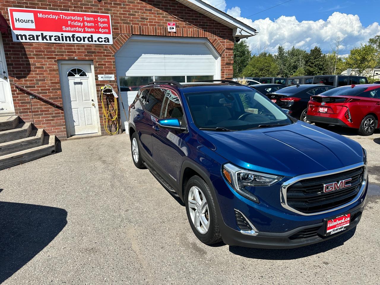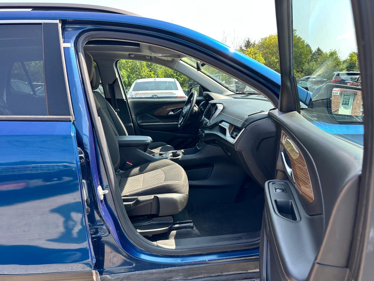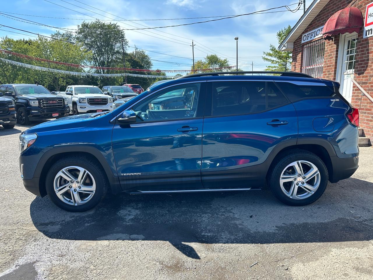 Super-Clean Local ONE-OWNER GMC Terrain from Bowmanville, ON! This SLE AWD model looks amazing in its beautiful Blue paint and factory alloy wheels, with great options inside and out! The exterior features keyless entry with remote start and proximity keys, automatic headlights, and automatic highbeams, colour-matched side mirrors with integrated turn signals, blind spot monitors, lande departure warning, a HUGE panoramic sunroof, roof rack rails, tinted privacy glass, forward collision warning, stepsides, trailer hitch, sporty dual rear exhaust, sleek rear spoiler, a peppy fuel efficient 2.0L 4-cylinder Engine and Automatic transmission powering the All-Wheel-Drive System! The interior is clean and comfortable with heated cloth seats with driver's power adjustment and lumbar controls, power door locks, windows and mirrors, a leather wrapped steering wheel with Audio and Cruise controls, push button start, an easy to read and use gauge cluster, a large central touch screen AM/FM/XM Satellite radio with Blueooth, Navigation, Apple CarPlay and Android Auto, and Backup Camera, Dual-Zone A/C climate control with front and rear window defrost settings, push button gear selection, USB/USB-C/AUX/12V/SD accessory ports and more!