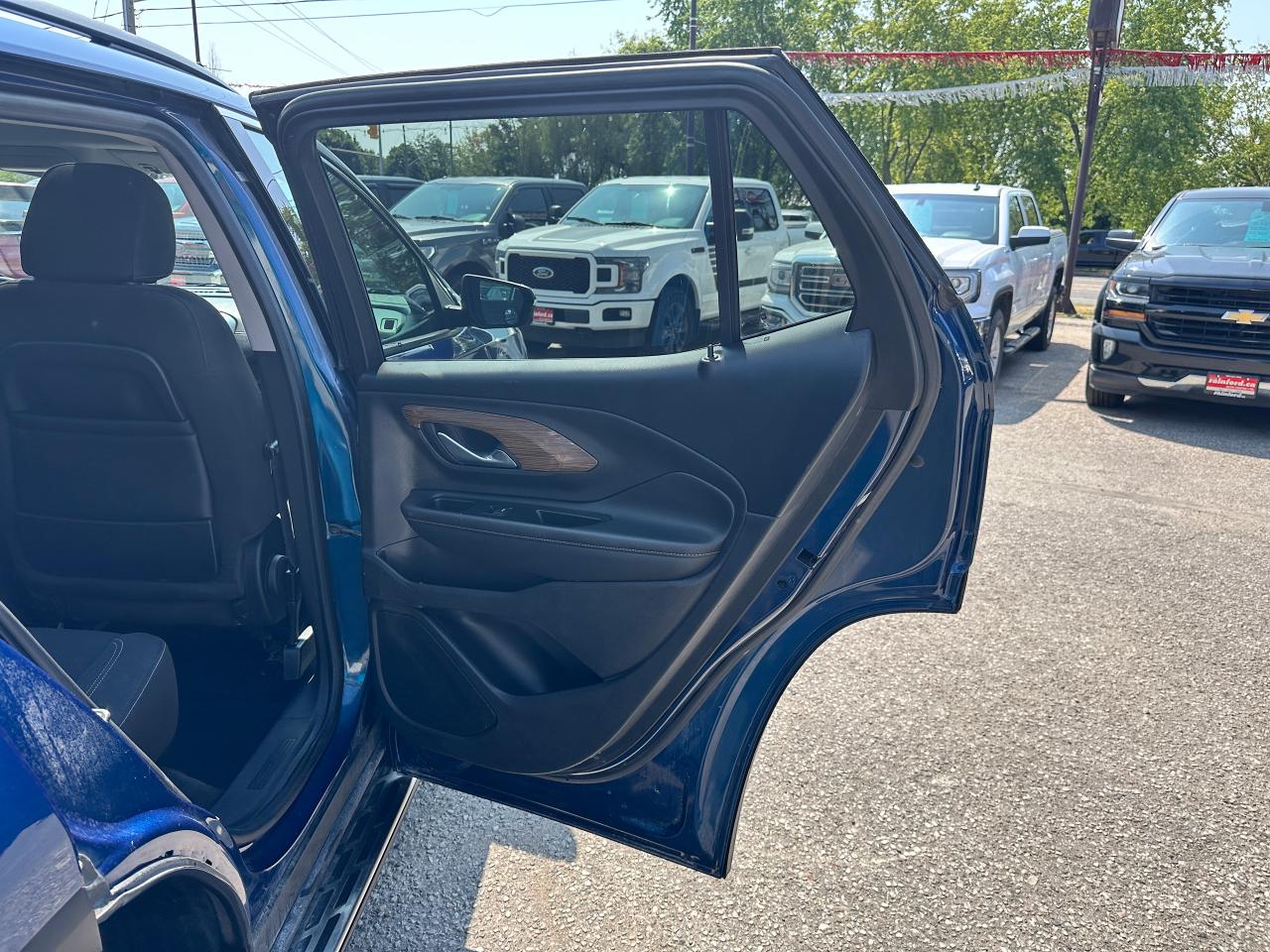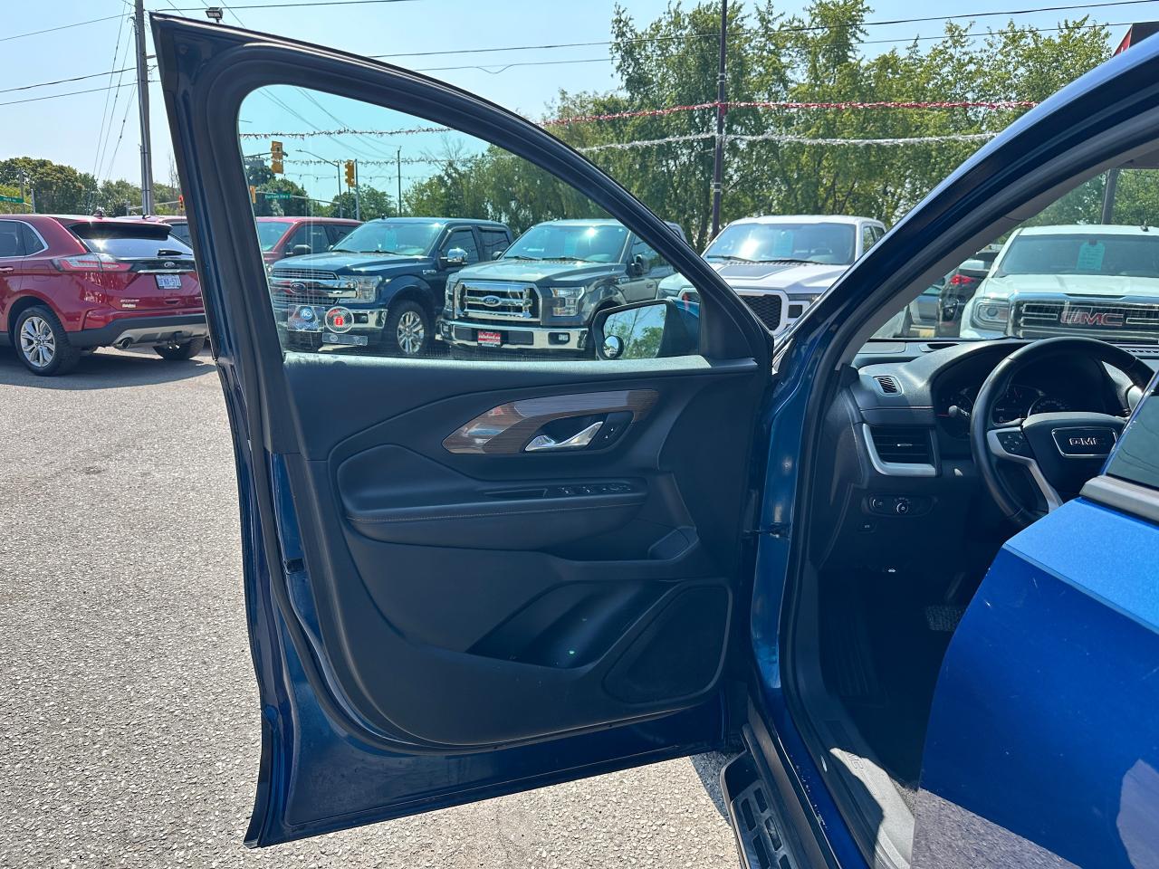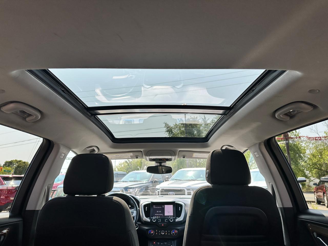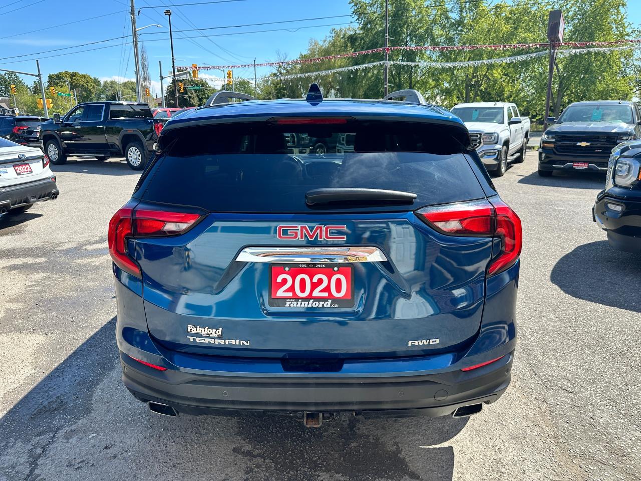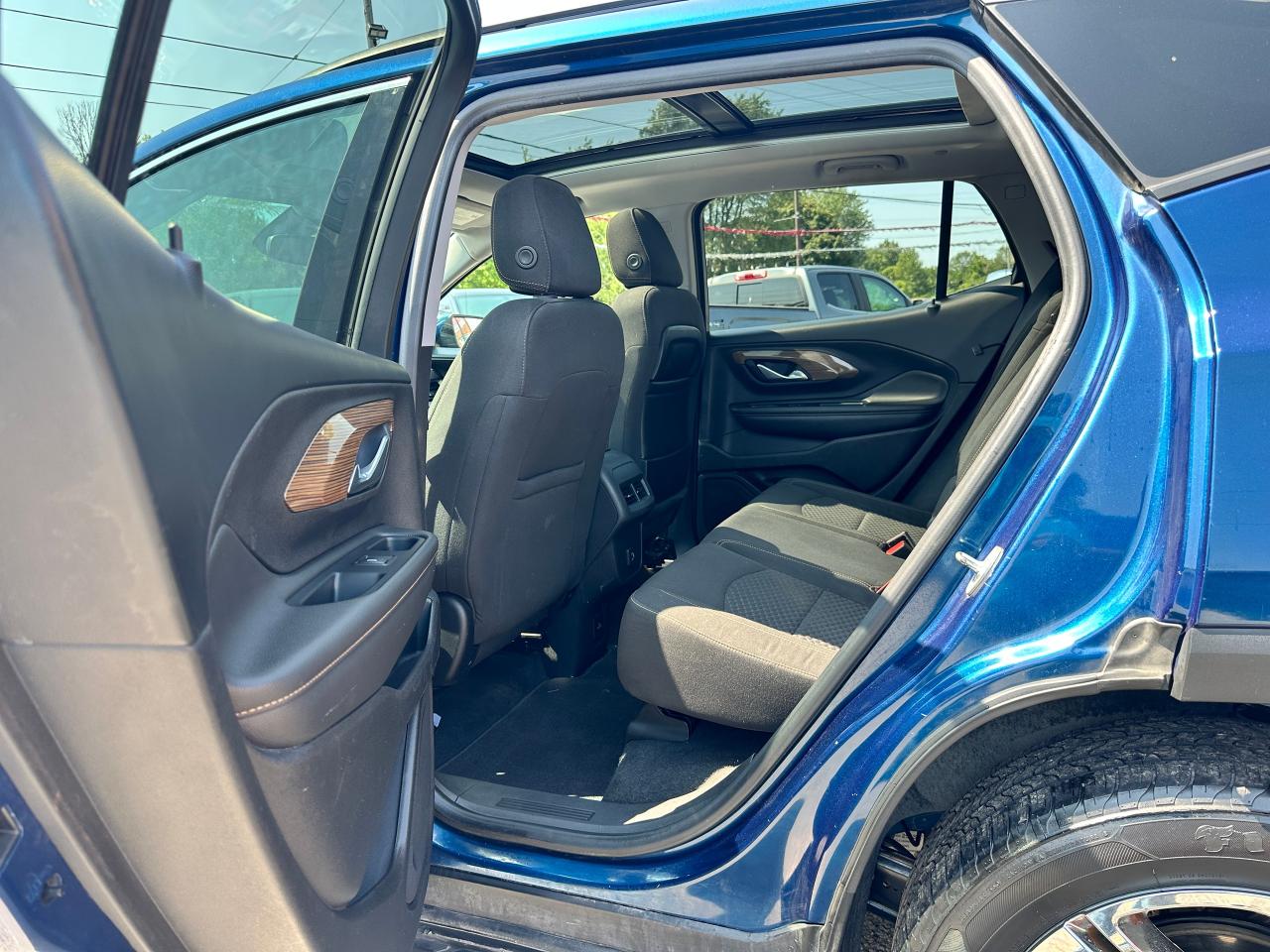 Super-Clean Local ONE-OWNER GMC Terrain from Bowmanville, ON! This SLE AWD model looks amazing in its beautiful Blue paint and factory alloy wheels, with great options inside and out! The exterior features keyless entry with remote start and proximity keys, automatic headlights, and automatic highbeams, colour-matched side mirrors with integrated turn signals, blind spot monitors, lande departure warning, a HUGE panoramic sunroof, roof rack rails, tinted privacy glass, forward collision warning, stepsides, trailer hitch, sporty dual rear exhaust, sleek rear spoiler, a peppy fuel efficient 2.0L 4-cylinder Engine and Automatic transmission powering the All-Wheel-Drive System! The interior is clean and comfortable with heated cloth seats with driver's power adjustment and lumbar controls, power door locks, windows and mirrors, a leather wrapped steering wheel with Audio and Cruise controls, push button start, an easy to read and use gauge cluster, a large central touch screen AM/FM/XM Satellite radio with Blueooth, Navigation, Apple CarPlay and Android Auto, and Backup Camera, Dual-Zone A/C climate control with front and rear window defrost settings, push button gear selection, USB/USB-C/AUX/12V/SD accessory ports and more!