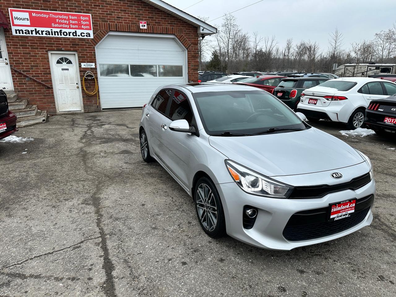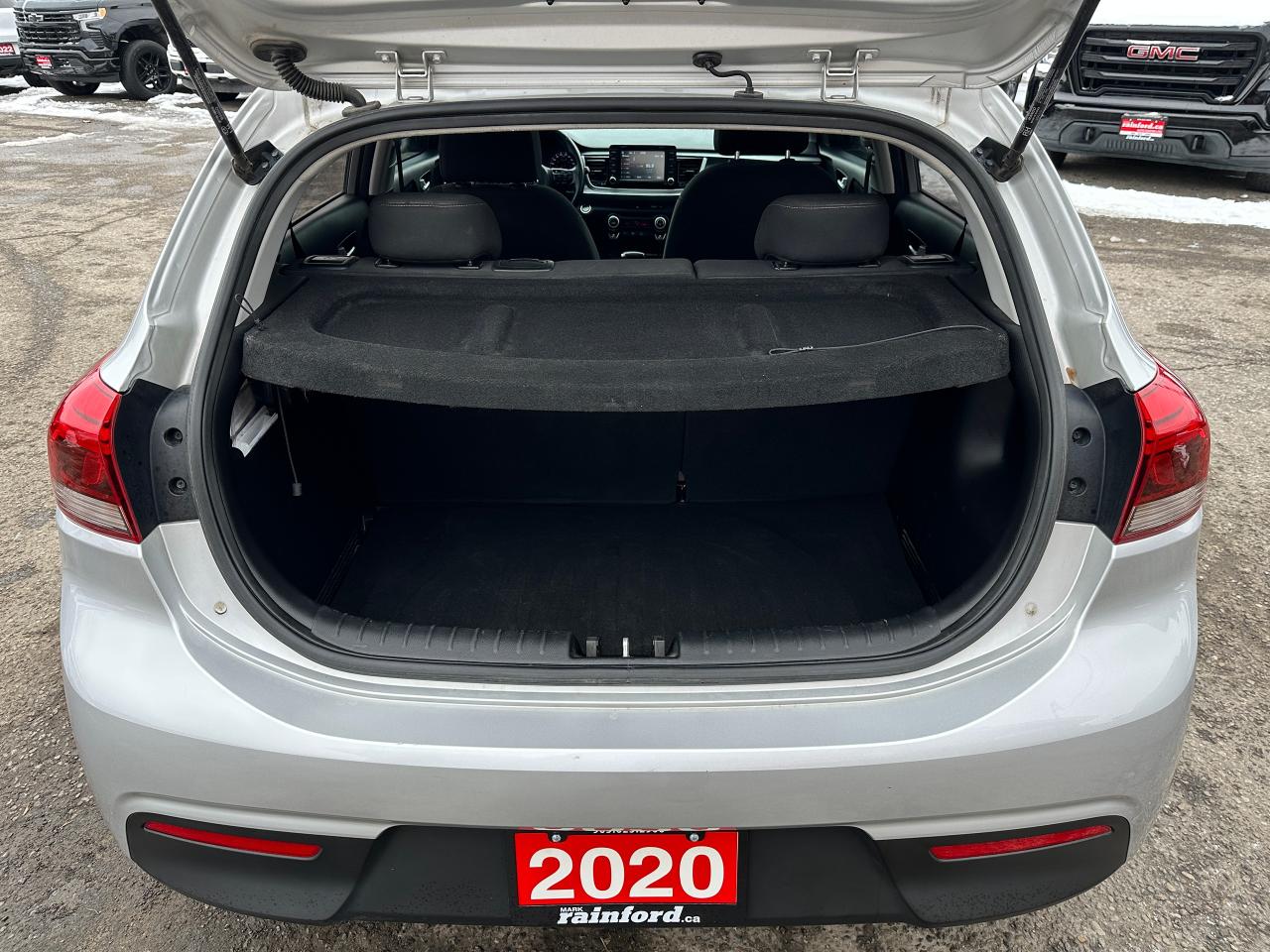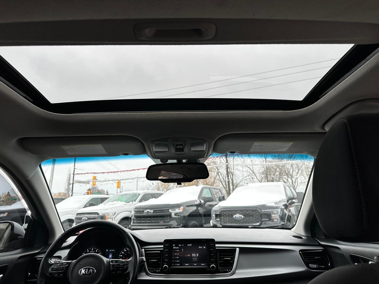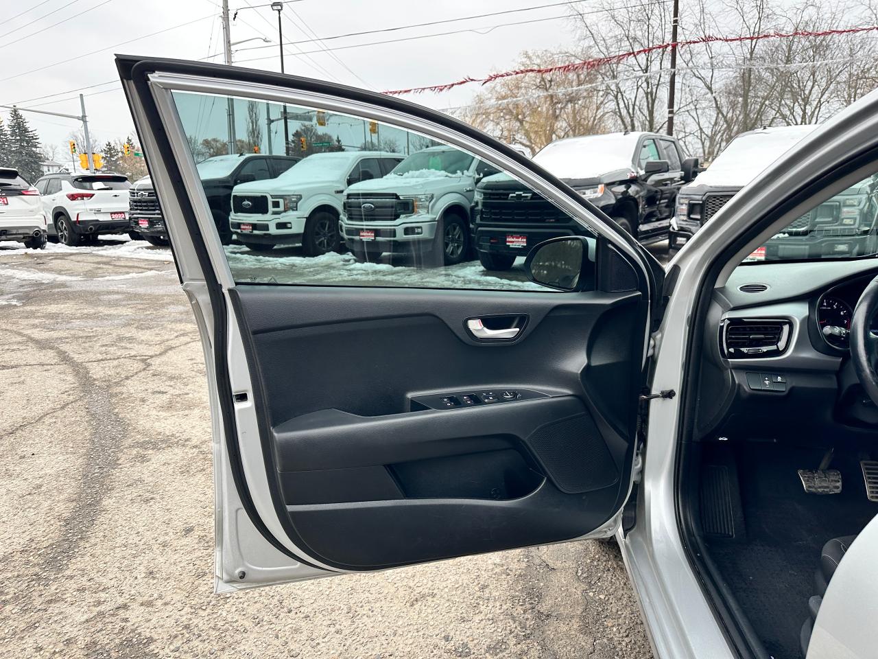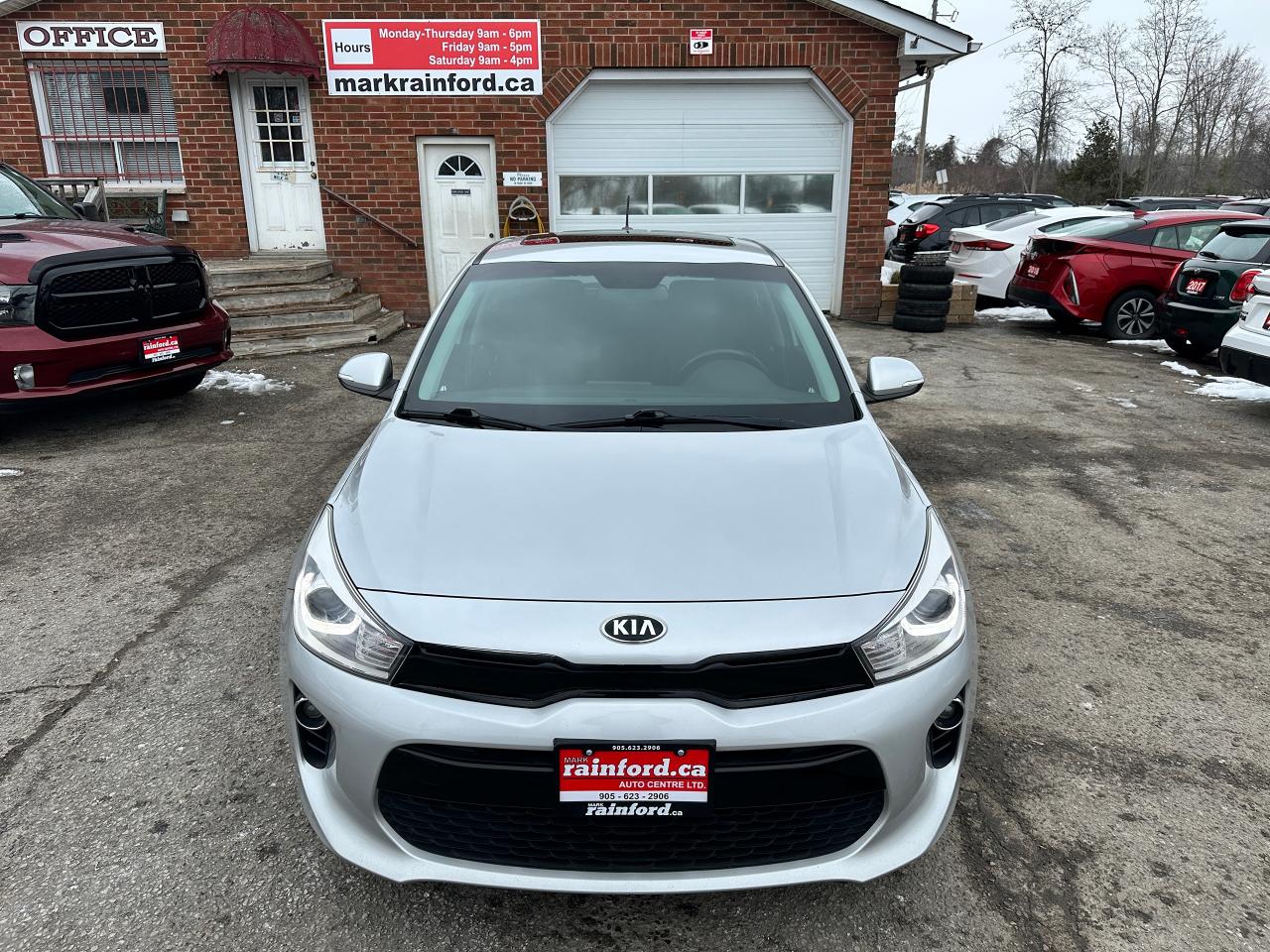 Super-Clean Kia Rio from Cambridge, ON! This EX Hatchback model looks fantastic in its Silver paint and factory alloy wheels, with nice options inside and out! The exterior features keyless entry with a proximity key, automatic headlights, foglights, a factory power sunroof, colour-matched side mirrors with integrated turn signals, tinted privacy glass, a sleek rear spoiler, gorgeous split spoke factory alloy wheels, a fuel-efficient 1.6L 4-cylinder Engine and CVT Auto Transmission! The interior is clean and comfortable with heated cloth front seats, comfortable rear seating and a fair-sized cargo area with a privacy cover, power door locks, windows and mirrors, a heated leather wrapped steering wheel with Audio and Cruise controls, push button start, an easy-to-read and use gauge cluster, a central touch screen AM/FM/XM Satellite Radio with Bluetooth, Apple CarPlay, Android Auto, MP3 Settings and a Backup Camera, A/C climate controls with front and rear window defrost settings, USB/AUX/12V accessory ports and more!