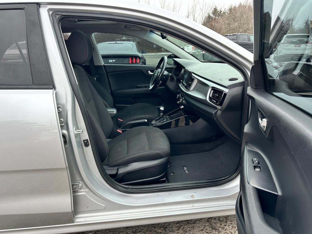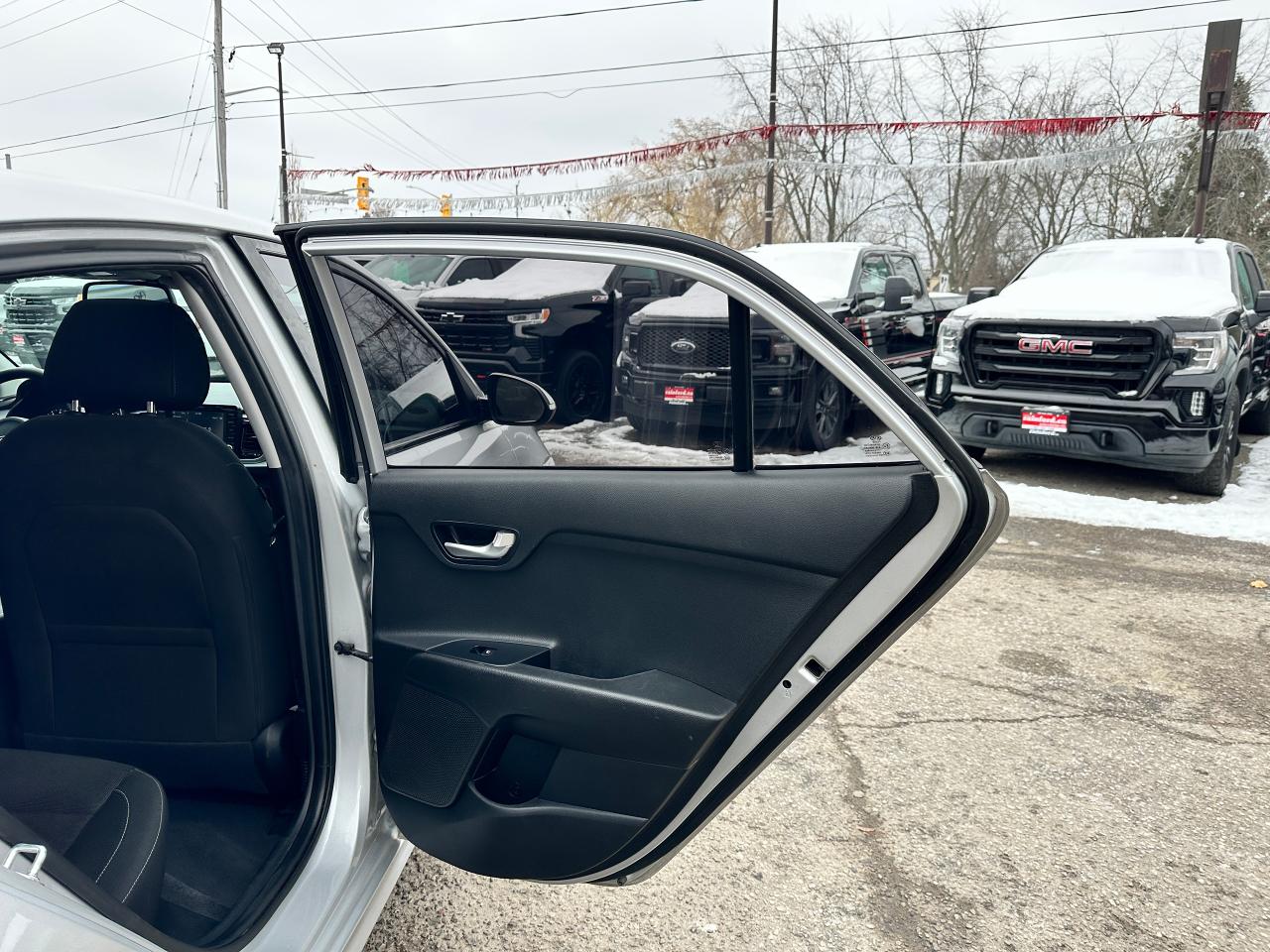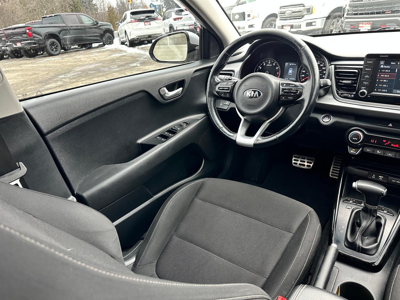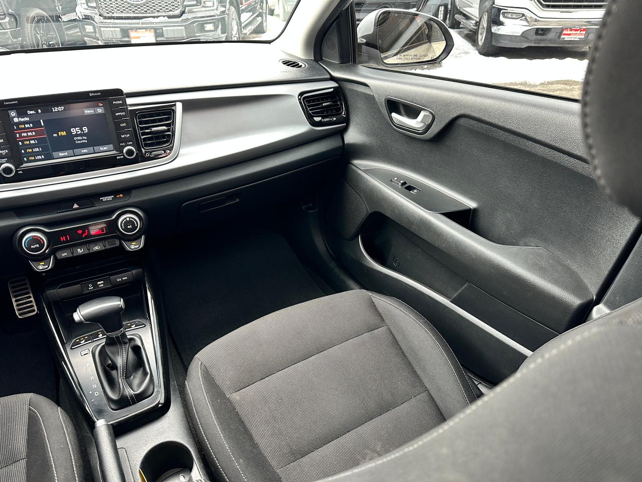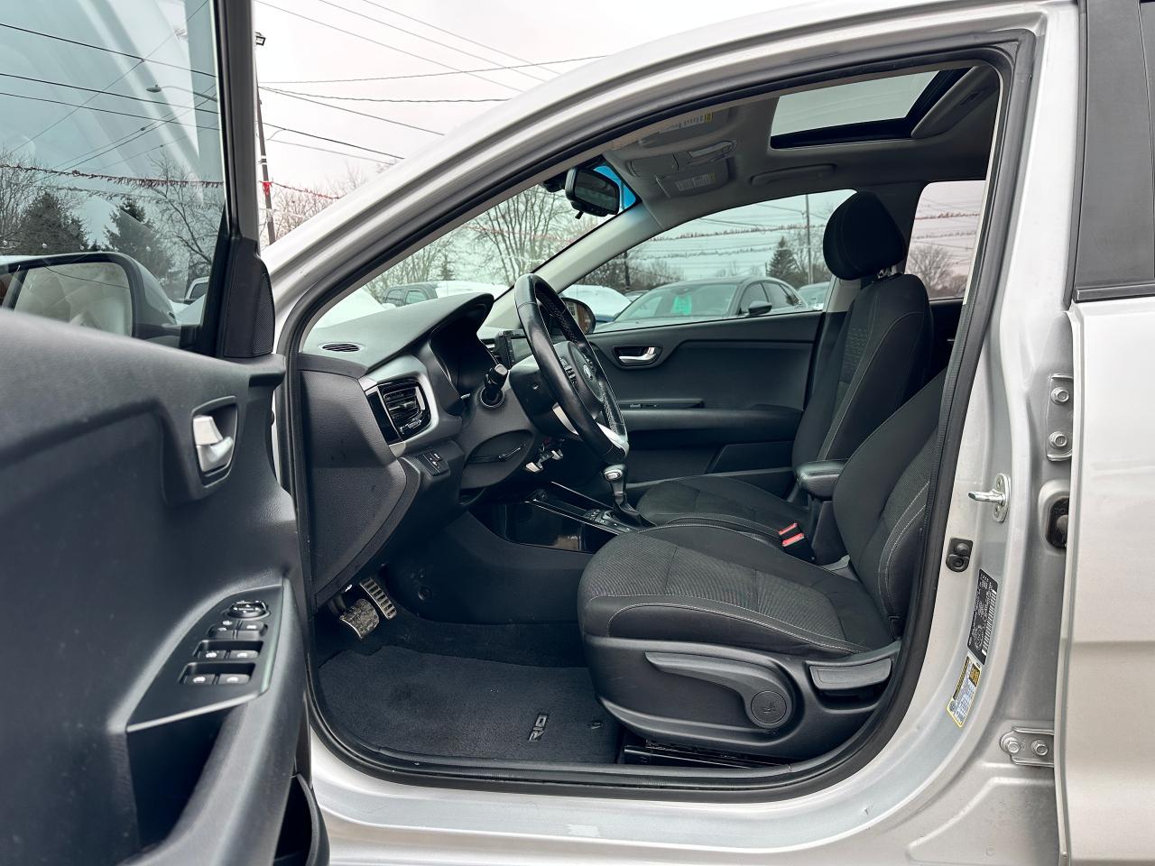 Super-Clean Kia Rio from Cambridge, ON! This EX Hatchback model looks fantastic in its Silver paint and factory alloy wheels, with nice options inside and out! The exterior features keyless entry with a proximity key, automatic headlights, foglights, a factory power sunroof, colour-matched side mirrors with integrated turn signals, tinted privacy glass, a sleek rear spoiler, gorgeous split spoke factory alloy wheels, a fuel-efficient 1.6L 4-cylinder Engine and CVT Auto Transmission! The interior is clean and comfortable with heated cloth front seats, comfortable rear seating and a fair-sized cargo area with a privacy cover, power door locks, windows and mirrors, a heated leather wrapped steering wheel with Audio and Cruise controls, push button start, an easy-to-read and use gauge cluster, a central touch screen AM/FM/XM Satellite Radio with Bluetooth, Apple CarPlay, Android Auto, MP3 Settings and a Backup Camera, A/C climate controls with front and rear window defrost settings, USB/AUX/12V accessory ports and more!