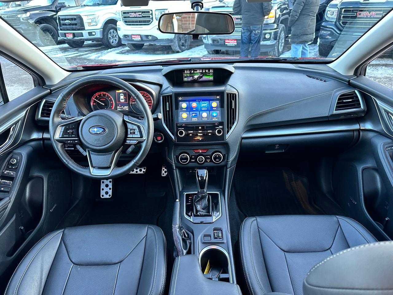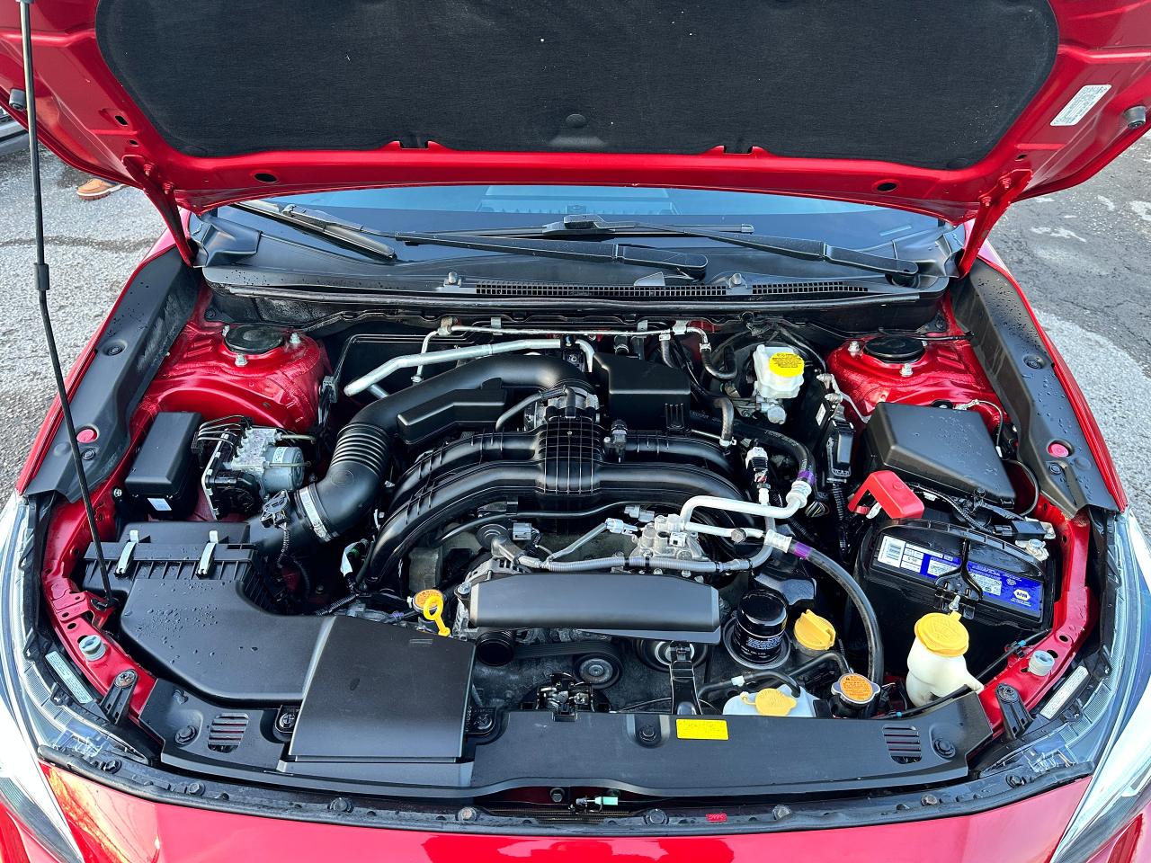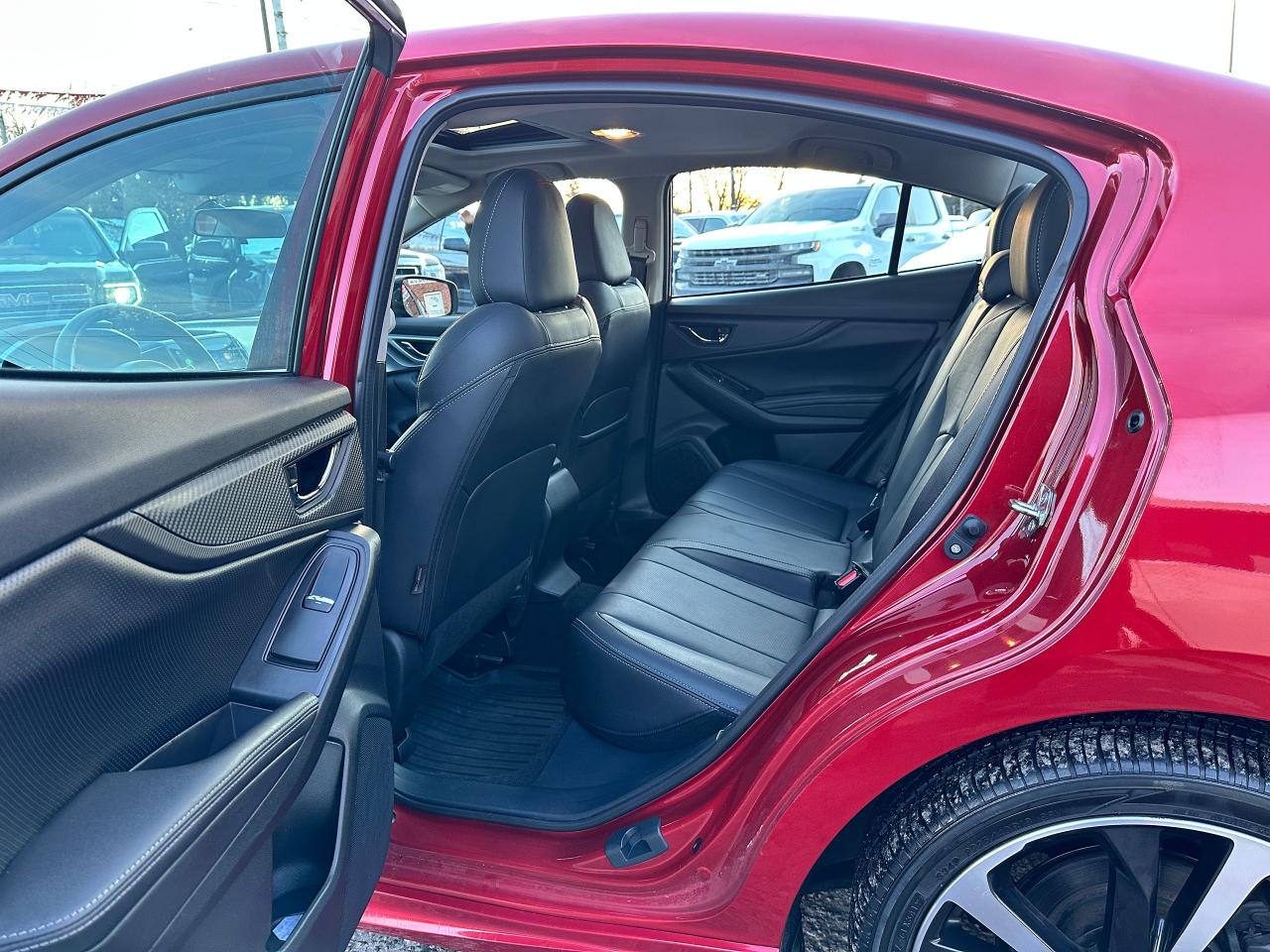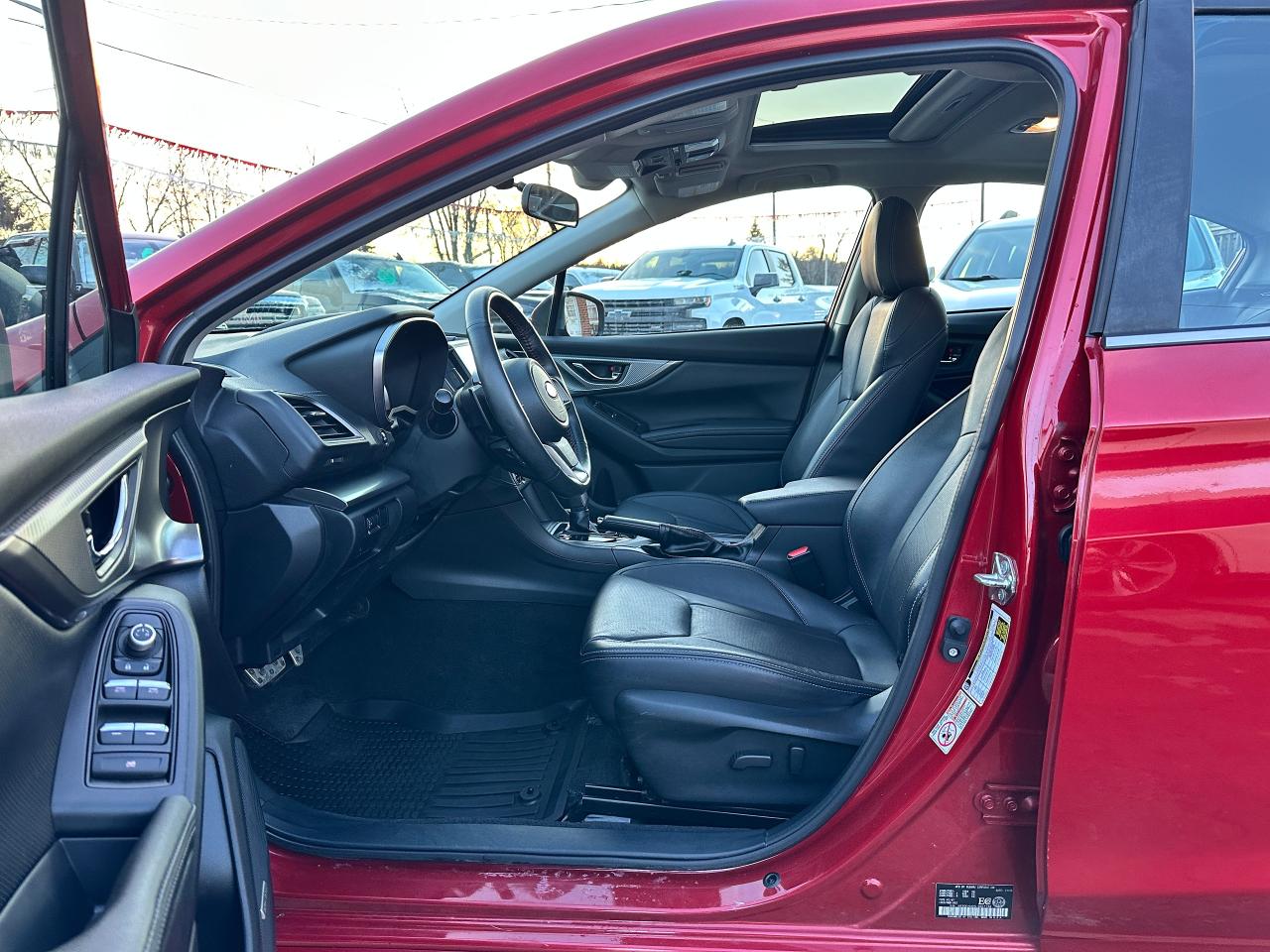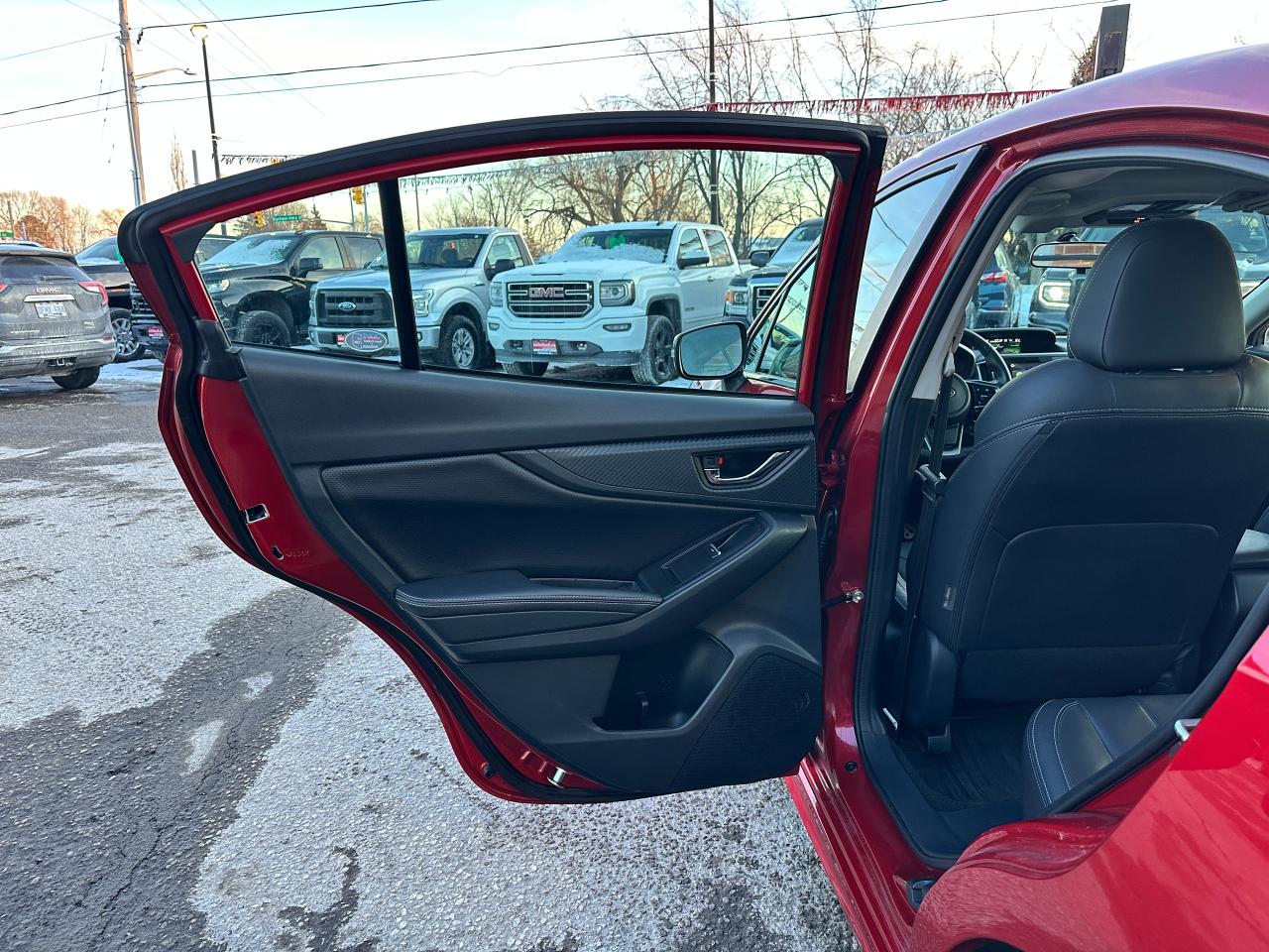 WOW! Super-Clean, Ultra-Low KM Subaru Impreza from Kingston, ON! This Sport-Tech AWD model looks incredible in its bright Red paint and factory alloy wheels, with fantastic options inside and out! The exterior features keyless entry with proximity key and remote trunk release, a large factory power sunroof, colour-matched heated side mirrors with integrated turn signals, automatic headlights, foglights, Steering Responsive Headlights, driver assist settings including lane departure warning, forward collision warning, blind spot warning and rear automatic braking/parking sensors, and adaptive cruise controls, a sleek rear spoiler, gorgeous factory machine finished alloy wheels, and a peppy fuel efficient 2.0L 4-Cylinder Boxer Engine and CVT auto transmission powering the All-Wheel-Drive system! The interior is clean and comfortable, with heated leather front seats with driver's power adjustment, power door locks, windows and mirrors, leather trimmings throughout, a heated leather wrapped steering wheel with red accent stitching, Audio and Cruise controls, an easy-to-read and use gauge cluster, push button start, a large central touch screen AM/FM/XM Satellite HD Radio with Harman Kardon Premium Audio System, Subaru Starlink, Apple CarPlay, Android Auto, Navigation, Backup Camera and CD Player, Dual-Zone A/C climate controls with front and rear window defrost settings, USB/AUX/12V accessory ports, and more!