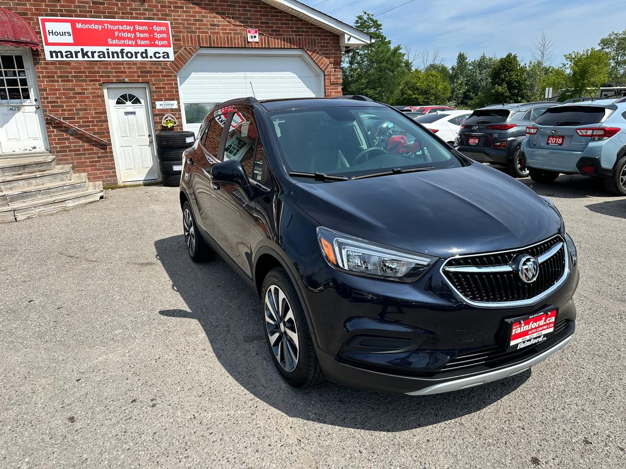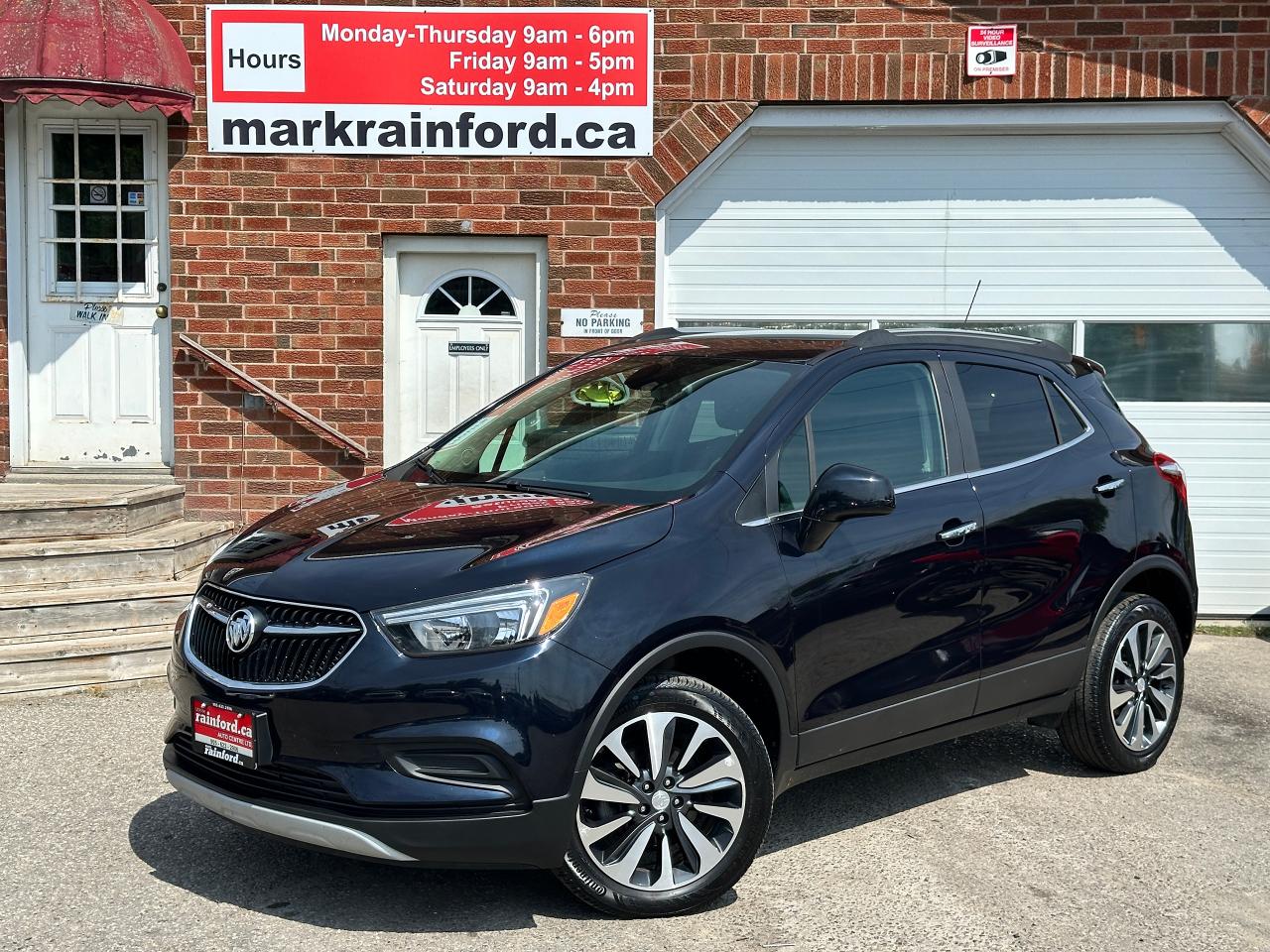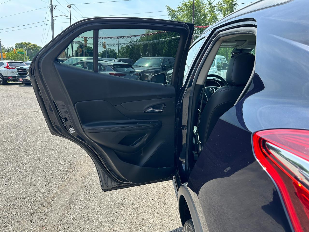 Stunning Super-Clean, LOW-KM Buick Encore from Kanata, ON! This Preferred AWD model looks amazing in its Dark Blue paint and factory alloy wheels, with convenient features inside and out! The exterior features keyless entry with remote start and proximity key, automatic headlights, roof rack rails, tinted privacy glass, blind spot monitor, a sleek rear spoiler, gorgeous machine-finished factory alloy wheels, a peppy fuel-efficient 1.4L 4-cylinder Turbocharged Engine and Automatic transmission power the All-Wheel-Drive system! The interior is clean and comfortable with cloth seating for all 5 occupants, driver's power adjustment with lumbar control, power door locks, windows and mirrors, comfortable rear seating and a spacious cargo area with privacy cover, a leather wrapped steering wheel with Audio and cruise controls, an easy to read and use guage cluster, push button start, a large central touch screen AM/FM/XM Satellite Radio with Bluetooth, Apple CarPlay, Android Auto, WiFi and OnStar Settings, along with a Backup Camera to make parking a breeze, A/C climate control with front and rear window defrost settings, USB/AUX/12V accessory ports, and more!