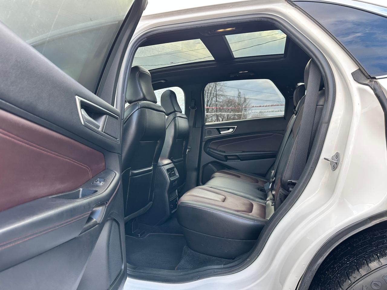 WOW! Super-Clean and well-optioned Ford Edge from Verona, ON! This Titanium AWD model looks incredible in its White paint and factory alloy wheels, with impressive options inside and out! The exterior features keyless entry with remote start and remote power liftgate, proximioty keys and coded entry, a HUGE panoramic sunroof, automatic headlights, foglights, colour-matched side mirrors with integrated turn signals, parking sensors front and rear, driver assists including lane keeping assist, adaptive cruise controls, forward collision warnings, blind spot monitors, and radar parking assists that can nearly park the vehicle for you, a sleek rear spoiler, sporty dual rear exhuast, tinted privacy glass, gorgeous 20" multi-spoke factory polish alloy wheels, a peppy fuel effient 2.0L 4-Cylinder Turbocharged Engine and Automatic transmission powering the All-Wheel-Drive system! The interior is very clean and comfortable with beautiful two-tone leather seating, heated and cooled power-adjustable front seats with lumbar controls and driver's memory settings, spacious and comfortable heated rear seats, power door locks, windows and mirrors, a heated leather-wrapped steering wheel with Audio and Cruise controls, push button start, an easy-to-read and use gauge cluster ENORMOUS central touch screen infotainment system with Premium Bang & Olufsen Audio, AM/FM/XM Satellite HD Radio with Bluetooth, Navigation, Apple CarPlay, Android Auto, Forward parking and Backup Camera, Passenger Games and Dual-Zone Climate controls with front and rear window defrost settings, Auto-Stop/Start override button, USB/12V accessory ports and more!