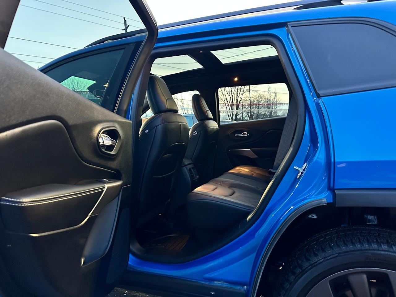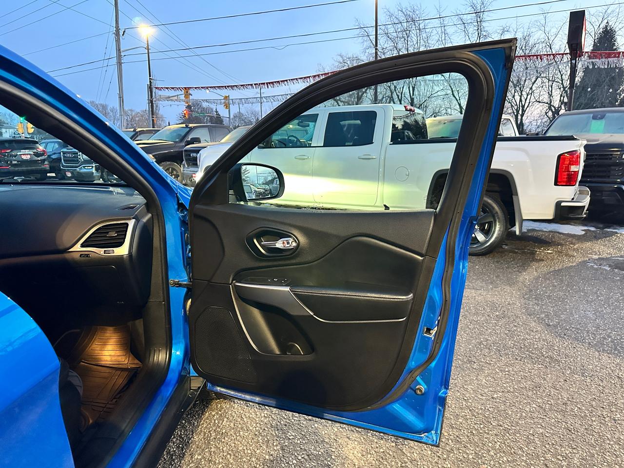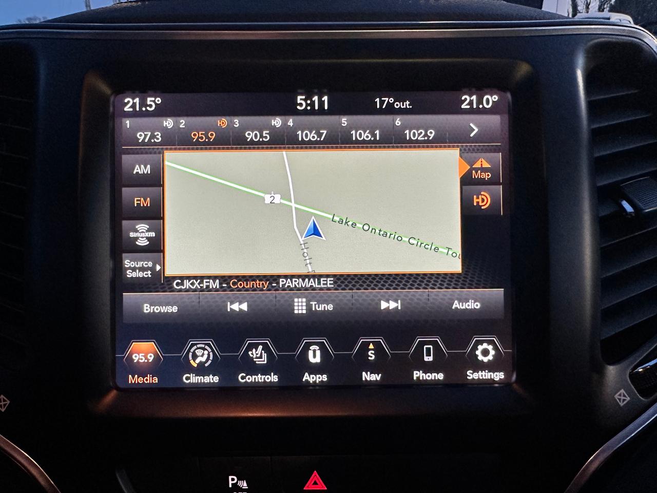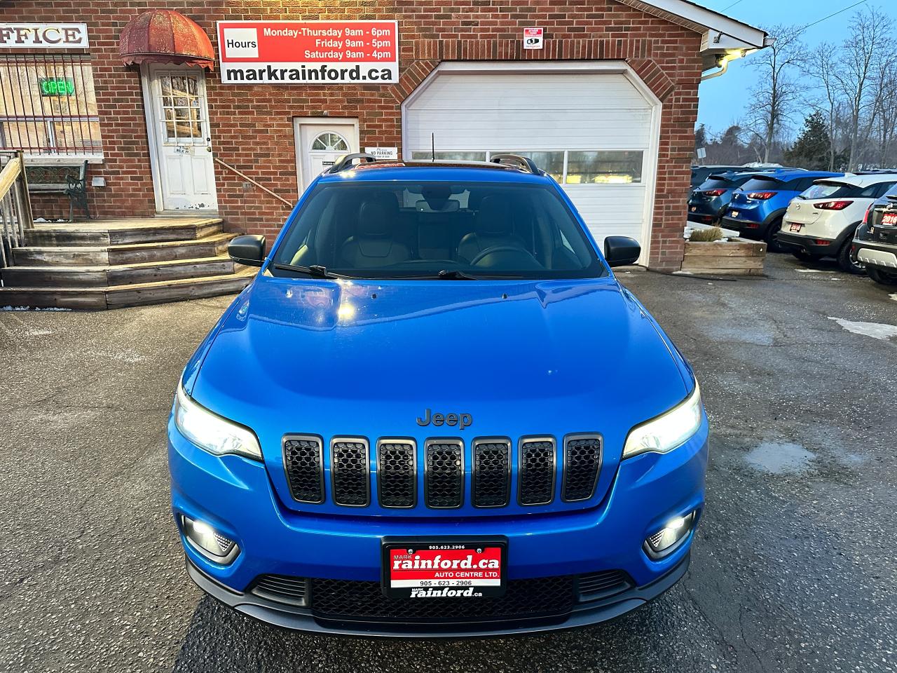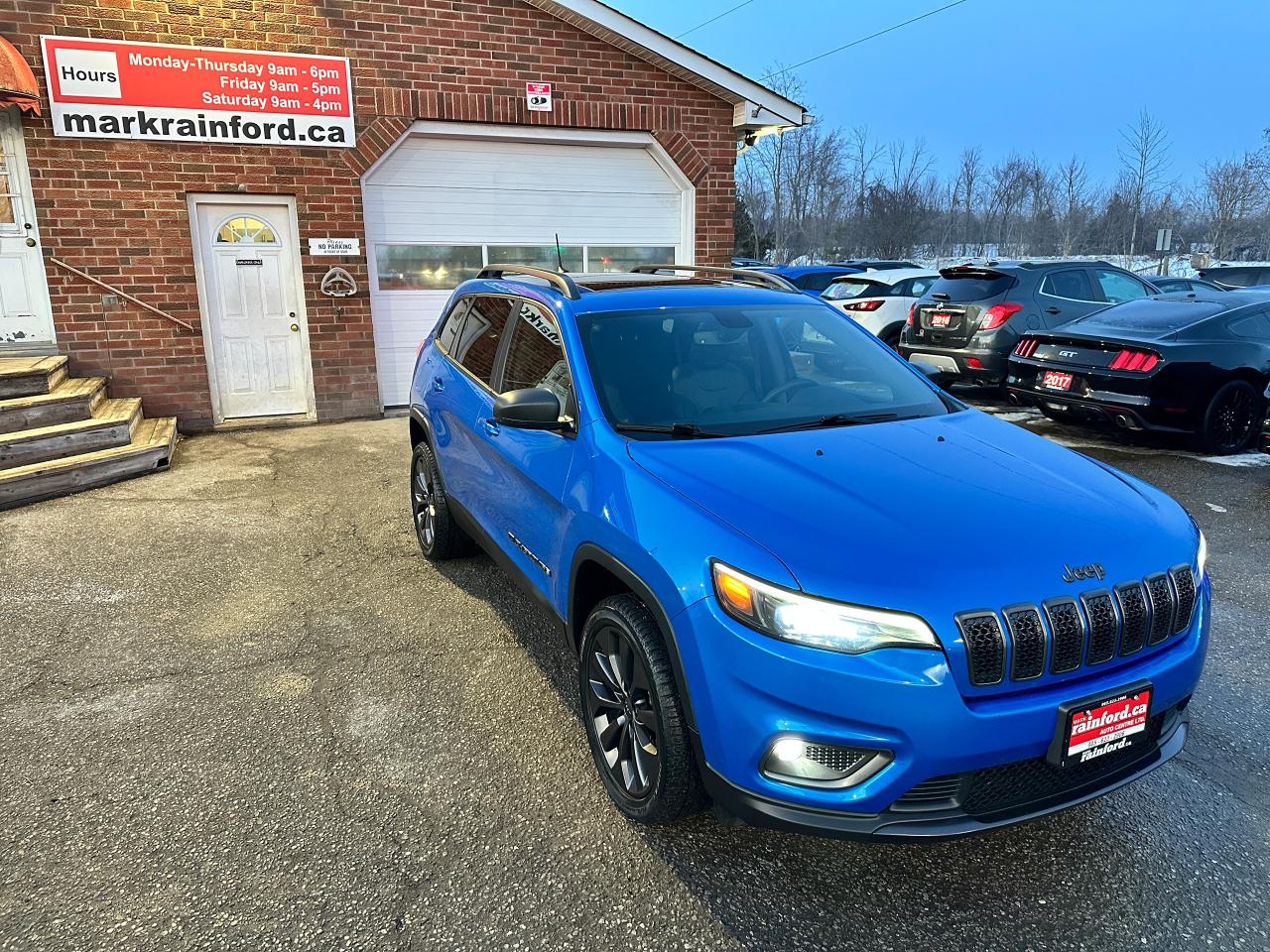 Super-Clean and well-equipped Jeep Cherokee from Paris, ON! This 80th Anniversary Edition 4x4 model looks incredible in its Blue paint and dark Factory Alloy wheels with nice options inside and out! The exterior features keyless entry with proximity keys, remote start and remote power rear liftgate, a huge Panoramic Sunroof, automatic headlights, foglights, roof rack rails, tinted privacy glass, a sleek rear spoiler, rear parking sensors, blind spot monitors, a trailer hitch, gorgeous dark factory split spoke alloy wheels, a powerful 3.2L V6 Engine and Automatic transmission driving the 4x4 system! The interior is clean and comfortable with heated leather front seats with power adjustment and lumbar controls, power door locks, windows and mirrors, a spacious cargo area and roomy rear seating, a heated leather wrapped steering wheel with Audio and Cruise controls, push button start, an easy to read and use gauge cluster, a large central touch screen AM/FM/XM Satellite HD Radio with Bluetooth, Navigation, Apple CarPlay, Android Auto, WiFi Settings, MP3 and Backup Camera, Dual-Zone A/C climate controls with front and rear window defrost settings, Auto-Stop/Start Override, Multiple Drive/Terrain modes, USB/AUX/12V accessory ports, universal garage door openers and more!\