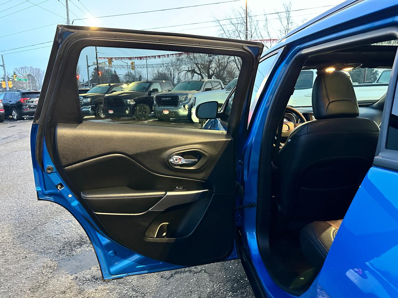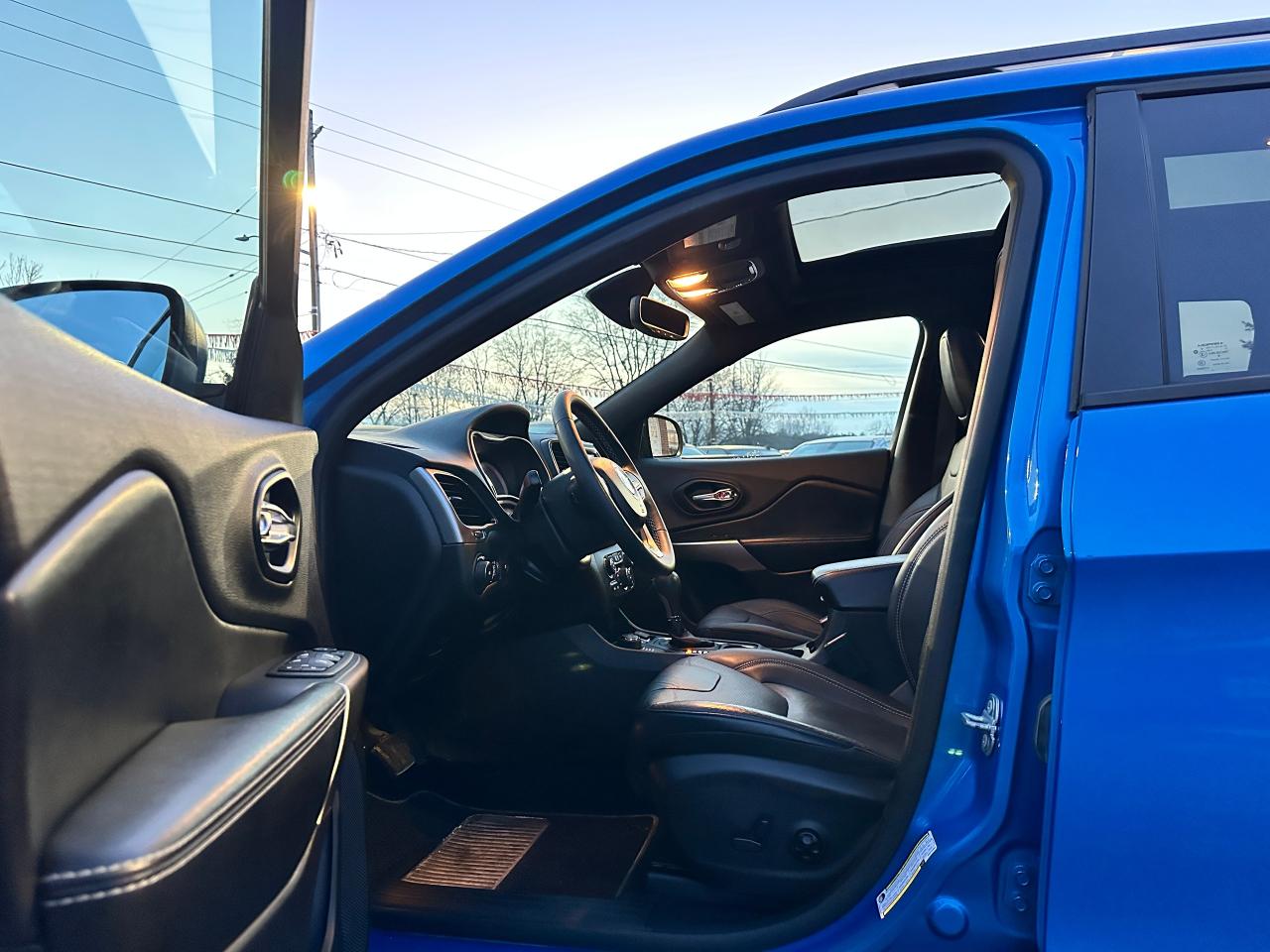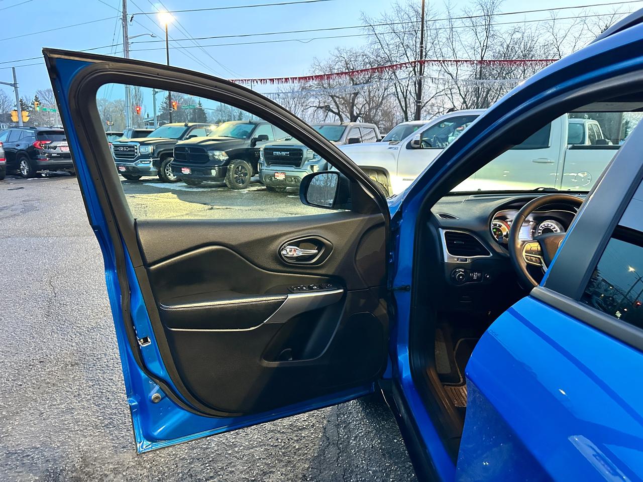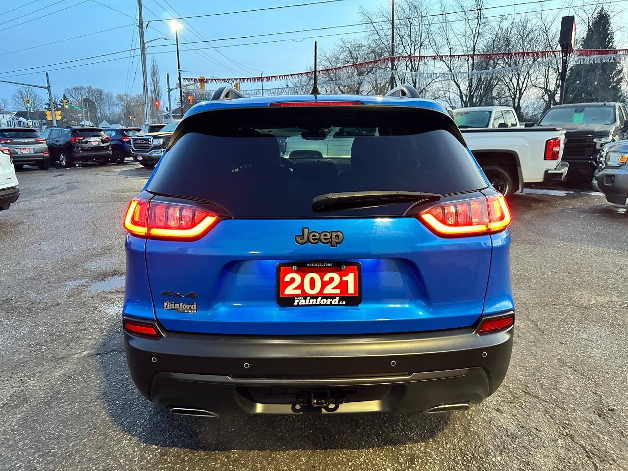 Super-Clean and well-equipped Jeep Cherokee from Paris, ON! This 80th Anniversary Edition 4x4 model looks incredible in its Blue paint and dark Factory Alloy wheels with nice options inside and out! The exterior features keyless entry with proximity keys, remote start and remote power rear liftgate, a huge Panoramic Sunroof, automatic headlights, foglights, roof rack rails, tinted privacy glass, a sleek rear spoiler, rear parking sensors, blind spot monitors, a trailer hitch, gorgeous dark factory split spoke alloy wheels, a powerful 3.2L V6 Engine and Automatic transmission driving the 4x4 system! The interior is clean and comfortable with heated leather front seats with power adjustment and lumbar controls, power door locks, windows and mirrors, a spacious cargo area and roomy rear seating, a heated leather wrapped steering wheel with Audio and Cruise controls, push button start, an easy to read and use gauge cluster, a large central touch screen AM/FM/XM Satellite HD Radio with Bluetooth, Navigation, Apple CarPlay, Android Auto, WiFi Settings, MP3 and Backup Camera, Dual-Zone A/C climate controls with front and rear window defrost settings, Auto-Stop/Start Override, Multiple Drive/Terrain modes, USB/AUX/12V accessory ports, universal garage door openers and more!\