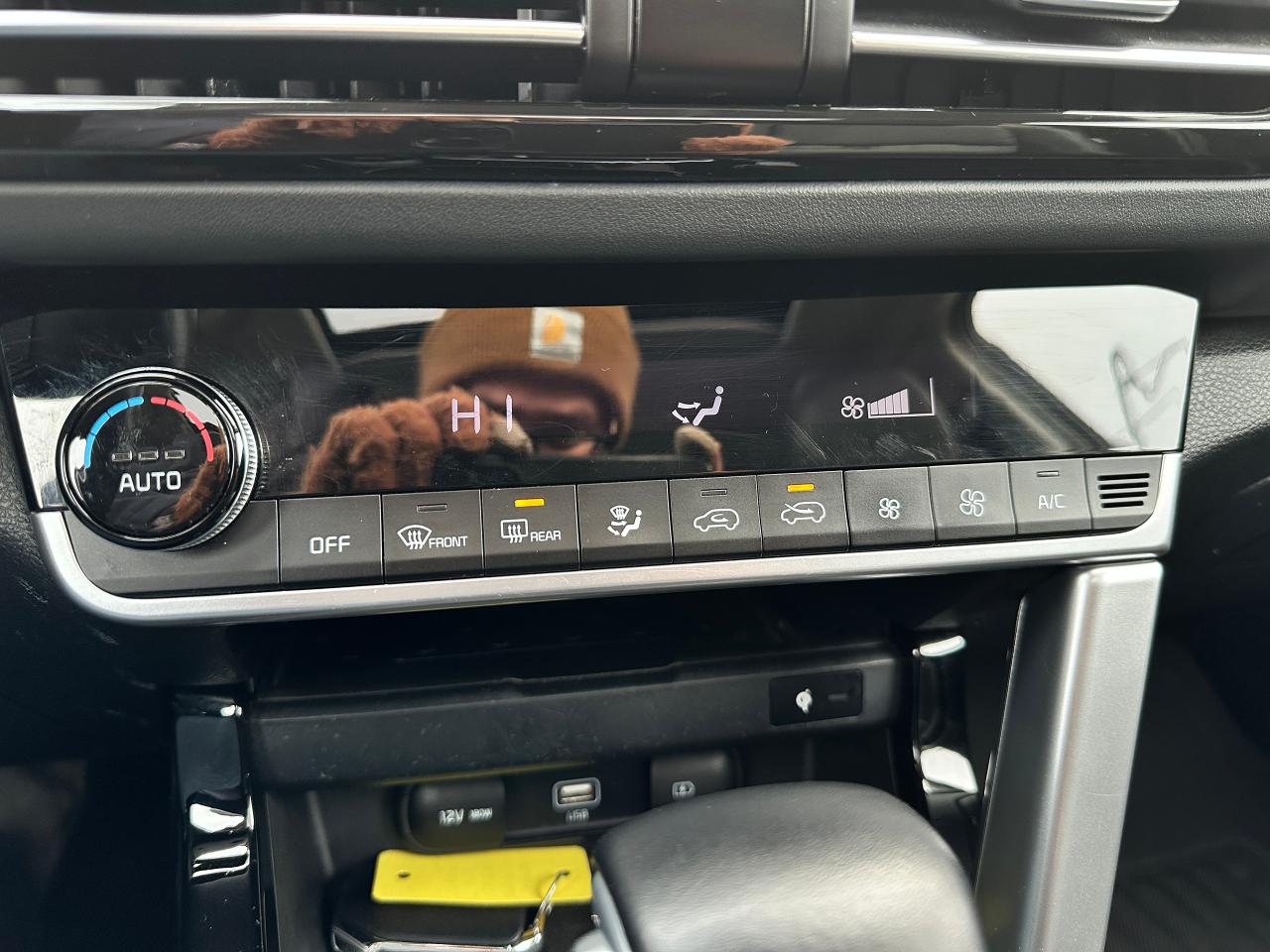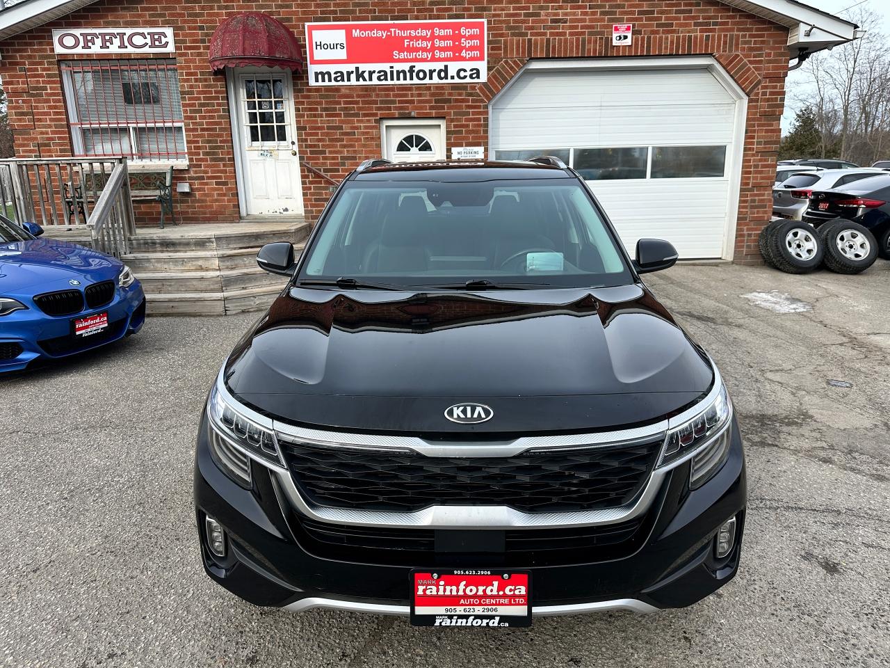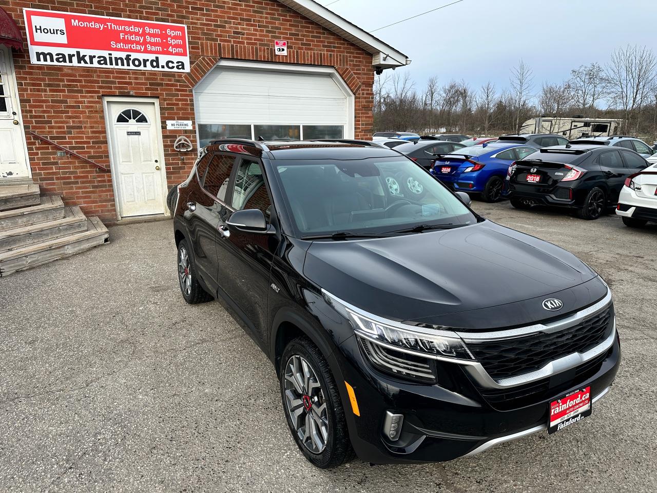 Ultra-Clean, One Owner Kia Seltos from Carleton Place, ON! This SX-Turbo AWD model looks incredible in its Black paint and factory alloy wheels with amazing options inside and out! The exterior features keyless entry with remote start and proximity key, automatic headlights, automatic highbeams, foglights, colour-matched side mirrors with integrated turn signals, tinted privacy glass, roof rack rails, lane keeping assist, adaptivecruise and forward warnings, blind spot monitors, a sleek rear spoiler, absolutely stunning machine-finished factory alloy wheels, a peppy fuel-efficient 1.6L Turbocharged 4-cylinder Engine and Automatic Transmission powering the All-Wheel-Drive system! The interior is clean and comfortable with heated and cooled front leather seats with power adjustment and drivers lumbar control, heated rear leather seats, all weather floor mats and a large rear cargo area with privacy shade, drivers heads up display, power door locks, mirrors and windows, a heated leather-wrapped steering wheel with Audio and Cruise controls, an easy to read and use guage cluster, showing multiple drive modes, a large central touch screen AM/FM/XM Satellite HD Radio with BOSE Premium Audio, Bluetooth, Navigation, Apple CarPlay, Android Auto, and Backup Camera, A/C climate controls with front and rear window defrost settings, hill descent assist, USB/12V accessory ports and more!
