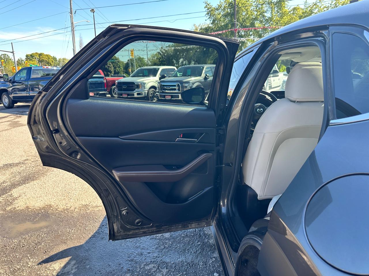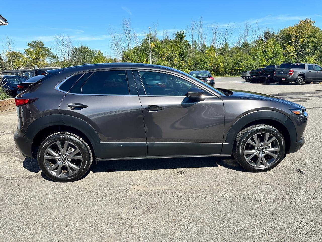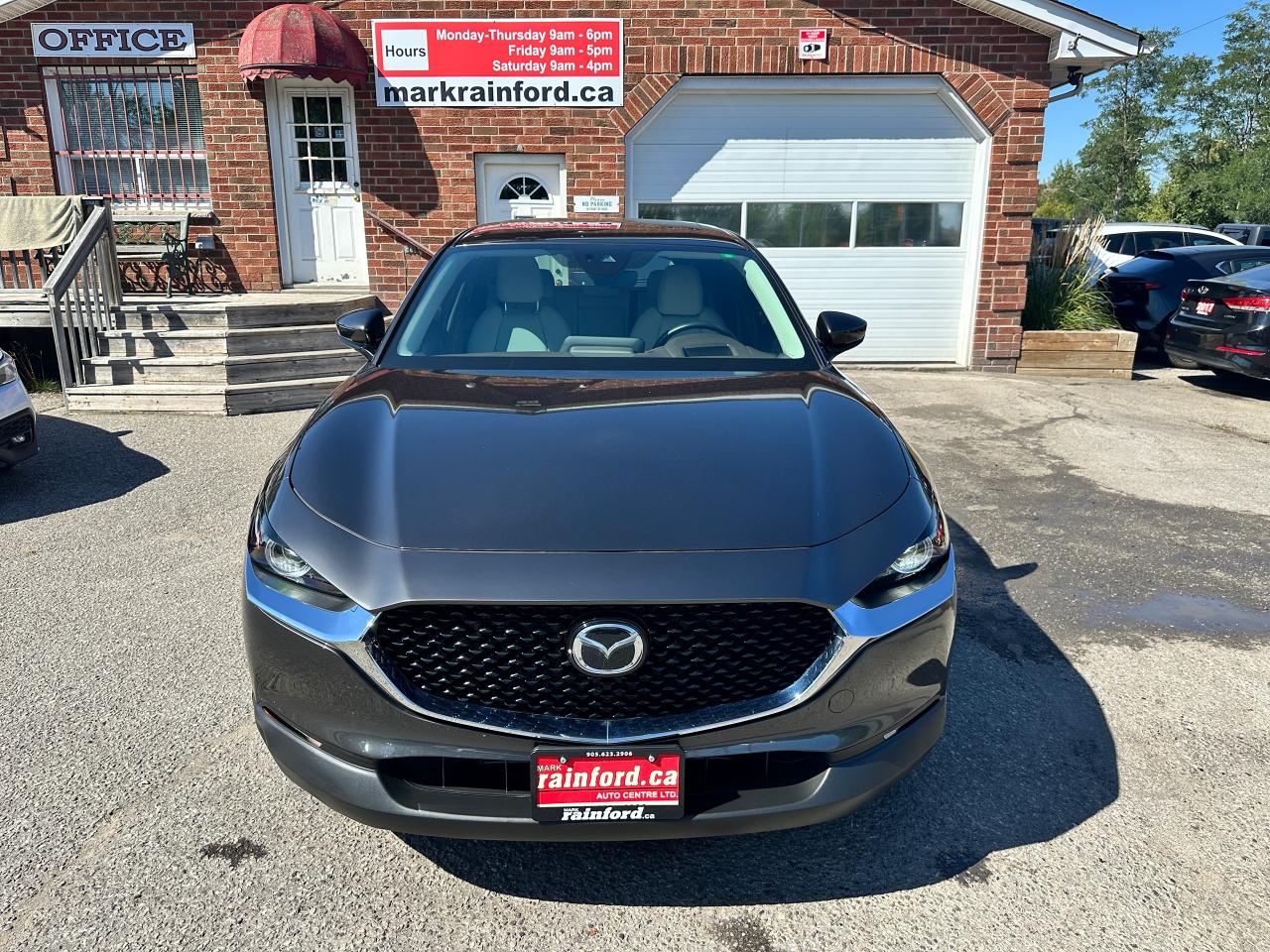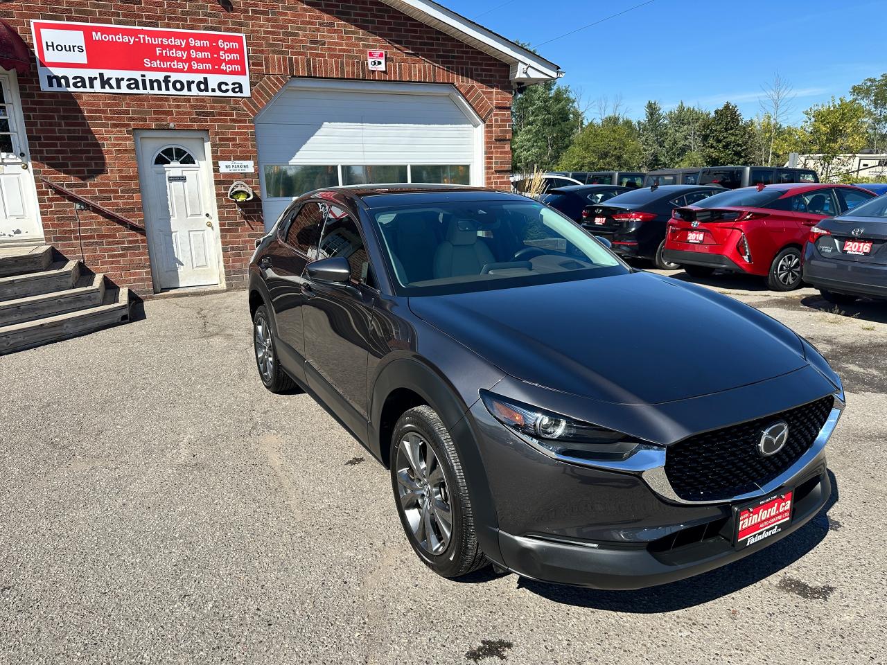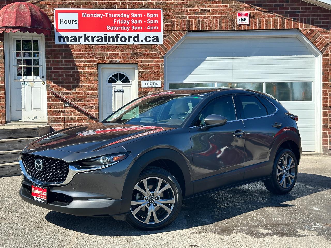 WOW! Super-Clean Mazda CX-30 from Kingston, ON! This GT AWD model looks absolutely stunning in its Grey paint and factory alloy wheels, with amazing options and styling! The exterior features keyless entry, automatic headlights and high beams, a factory power sunroof, colour-matched side mirrors with integrated turn signals, tinted privacy glass, a sporty dual rear exhaust, forward collision warning and adaptive cruise settings, lane departure warning, parking sensors, gorgeous factory split spoke dark alloy wheels, a peppy fuel-efficient 2.5L 4-cylinder Engine and Automatic transmission powering the All-Wheel-Drive system! The interior is clean and comfortable with heated leather front seats with driver's power adjustment, lumbar control and memory settings, power door locks, windows and mirrors, a heated leather wrapped steering wheel with Audio and Cruise controls, an easy to read and use gauge cluster, push button start, central AM/FM/XM Satellite HD Radio with Bluetooth, Navigation, Apple CarPlay, Android Auto, and Backup Camera, Dual-Zone A/C climate control with front and rear window defrosts settings, USB/12V accessory ports, Terrain assist, SPORT Driving mode, and more!