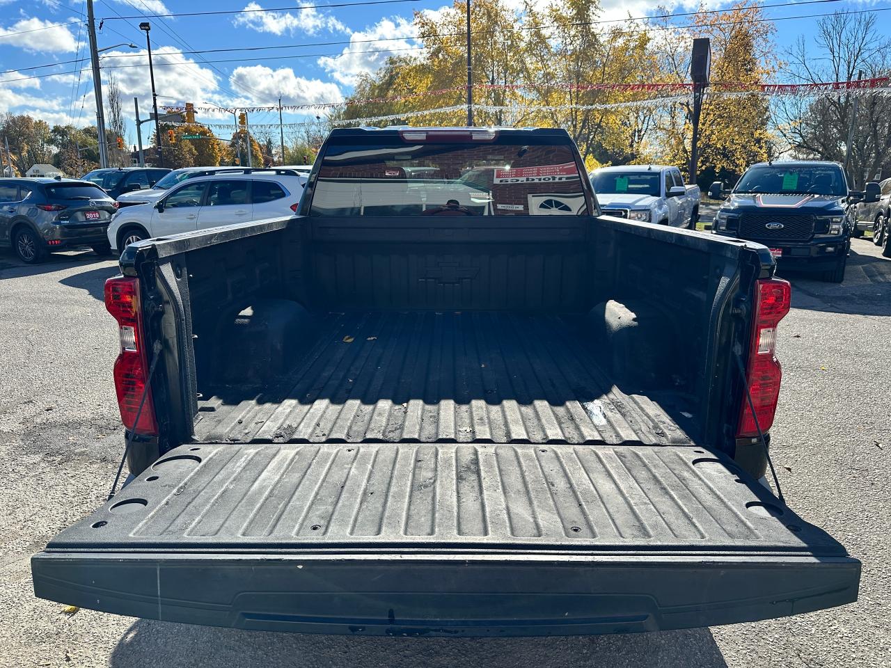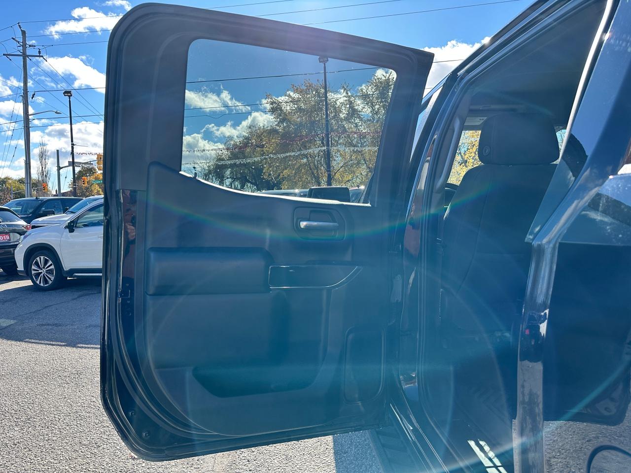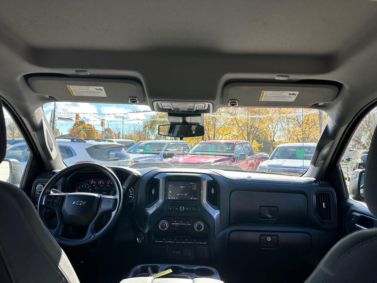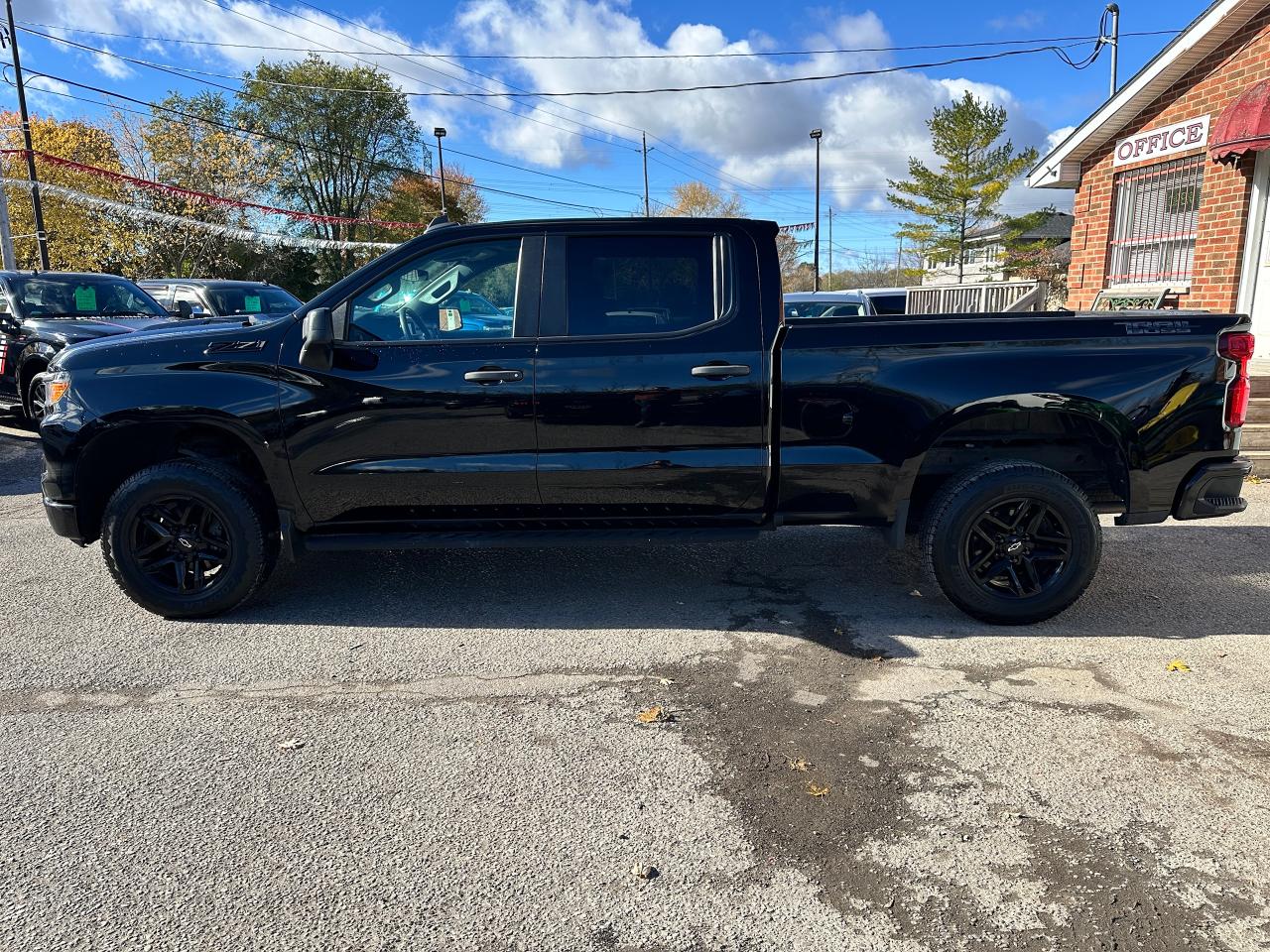 Super-Clean, sharp-looking Chevrolet Silverado from Kingston, ON! This Trail-Boss Custom 4x4 Crew Cab looks clean and mean in its classic Black-on-Black colour scheme, with convenient options inside and out! The exterior features keyless entry with a remote start and remote power tailgate release, automatic headlights, automatic highbeams, front tow hooks, a trailer hitch, tinted privacy glass, rear bumper steps, spray in bedliner, a sporty dual-rear exhaust, black step sides, Trail Boss and Z71 Badges/Decals, forward collision warning, lane departure warning, gorgeous Black factory Alloy wheels with NEW All-Season Tires freshly installed, a powerful 5.3L V8 Engine and Automatic transmission powering the 4x4 system! The interior is clean and comfortable with cloth seating for all 6 occupants through its fold-up centre console, power driver adjustments with lumbar control, power door locks, mirrors and windows, all-weather floor mats, electronic 4x4 selection, trailer assist knob, steering wheel-mounted Cruise controls, an easy-to-read and use gauge cluster, push button start, a large central touch screen AM/FM/XM Satellite Radio with Bluetooth, Apple CarPlay, Android Auto, OnStar Turn by Turn Capability, and Backup Camera, A/C Climate controls with front and rear window defrost settings, Auto-Stop/Start override, tailgate release button, Hill descent assist, USB/USB-C/12V accessory ports, and more!