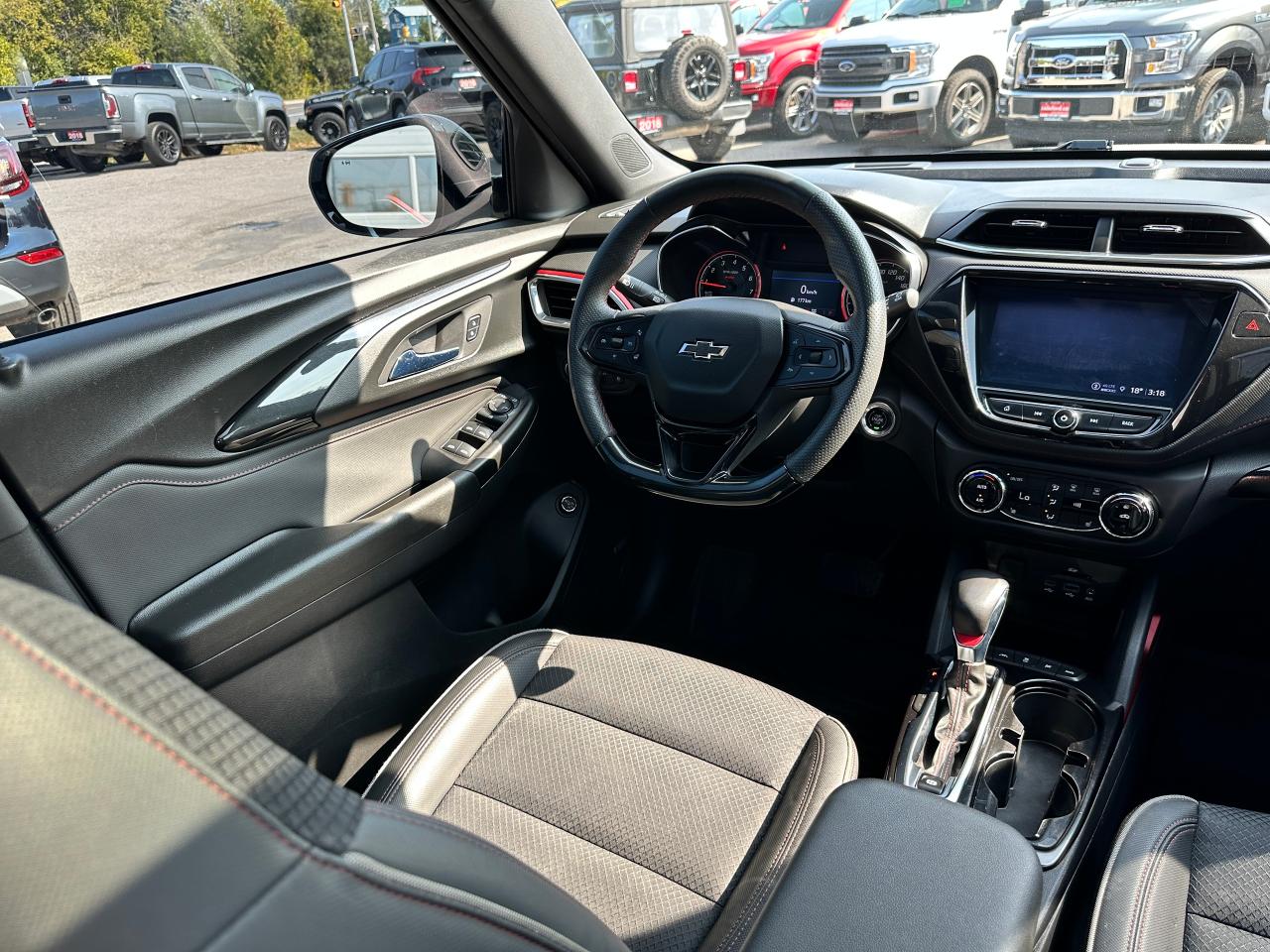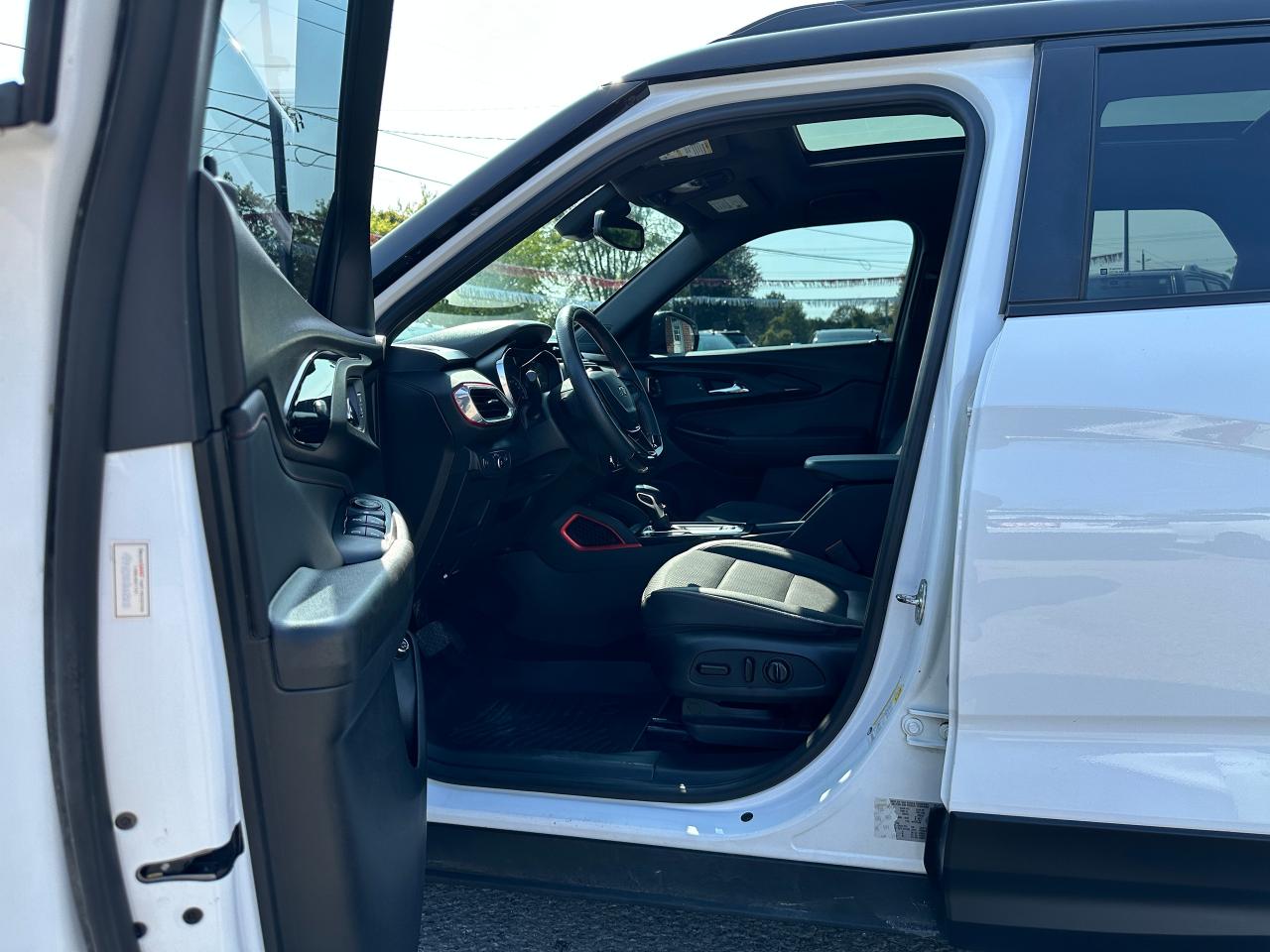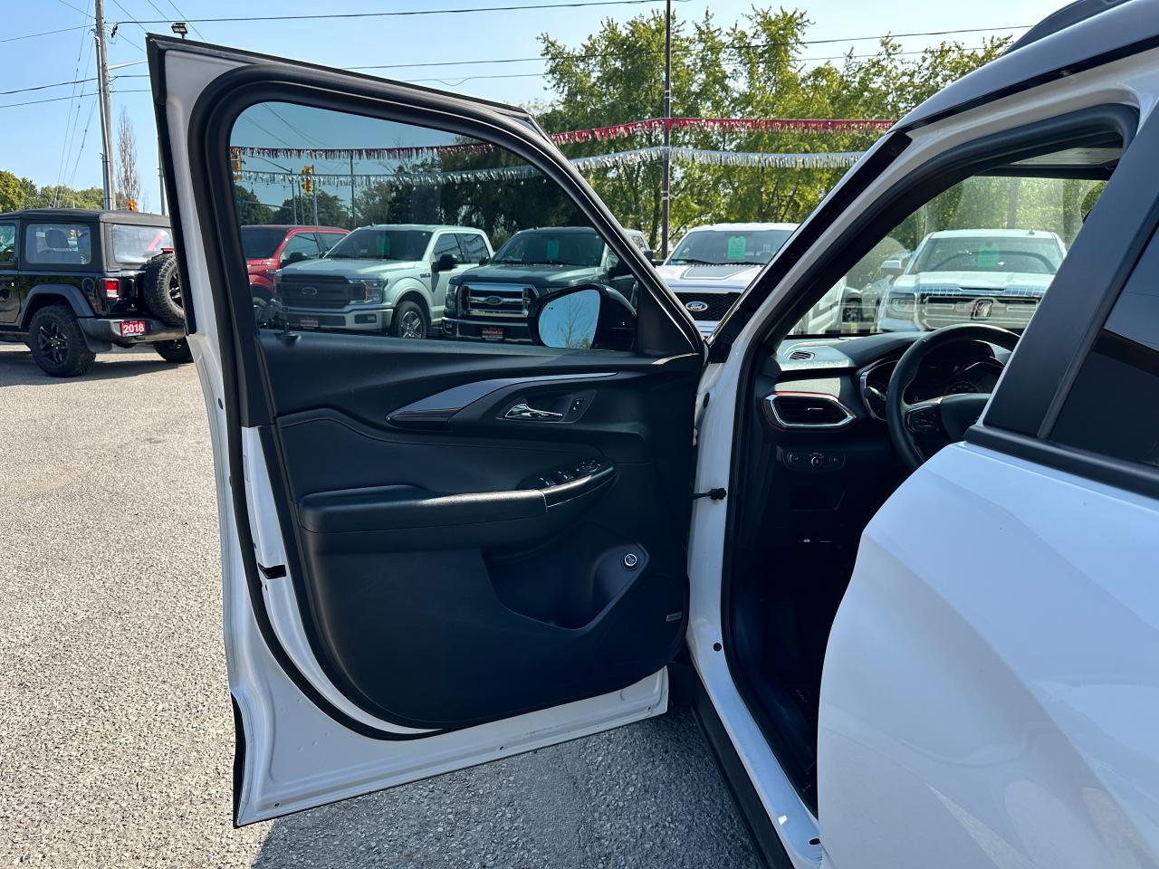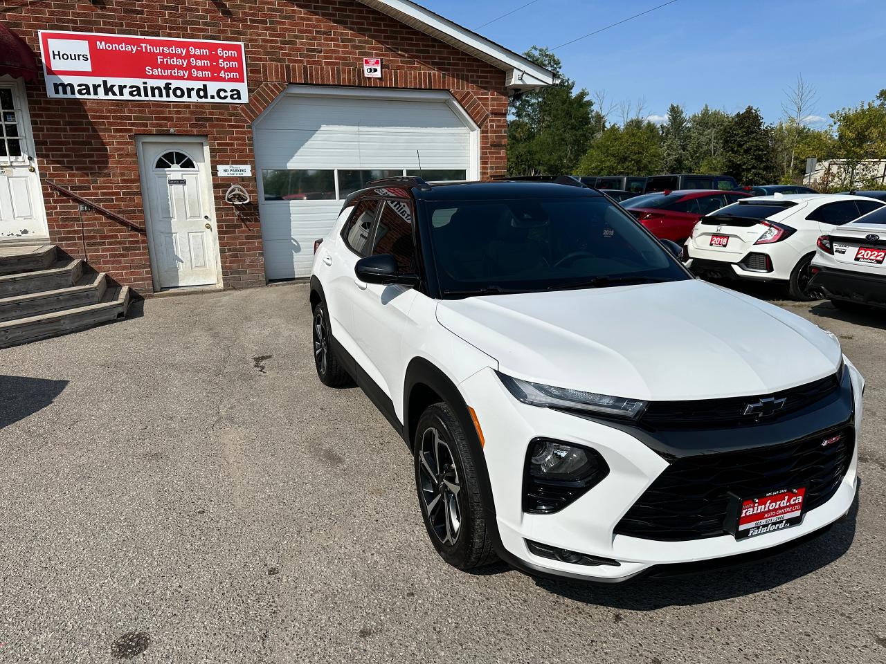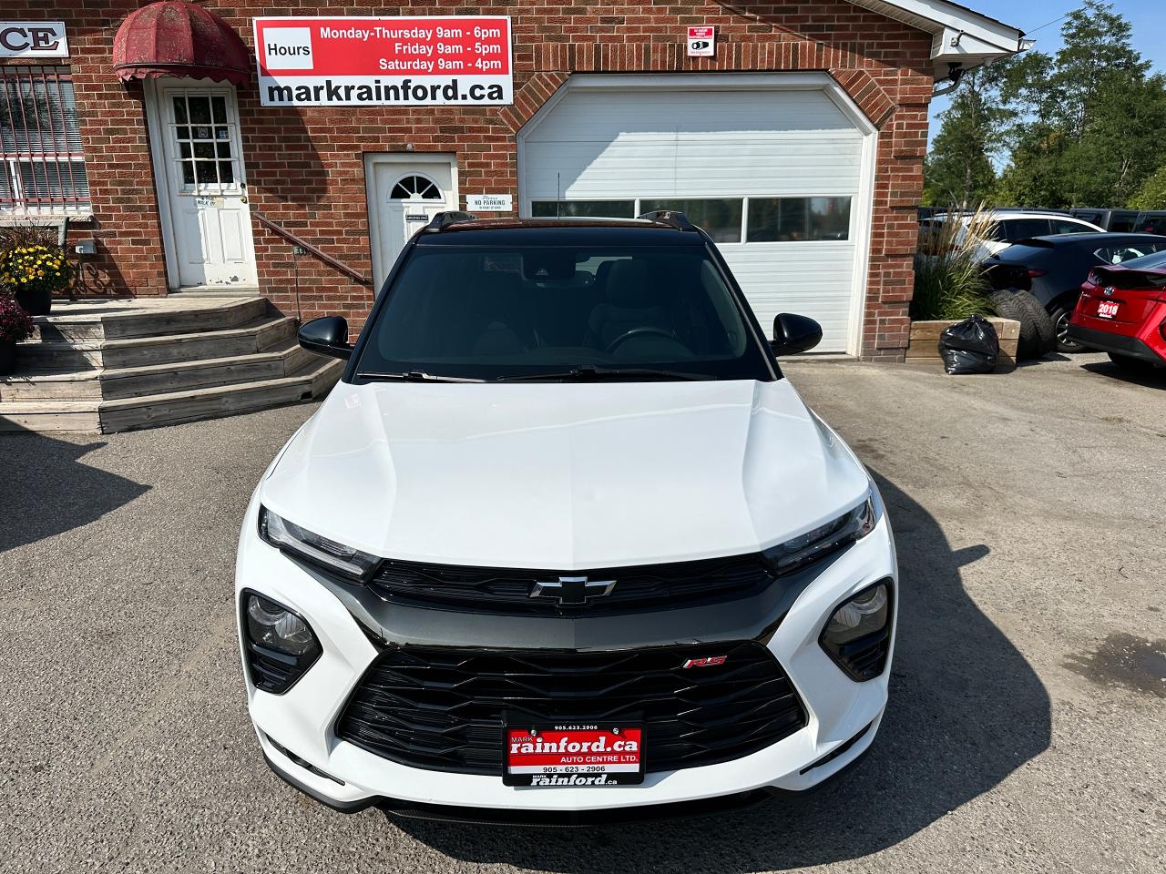 WOW! Super-Clean and exceptionally well optioned Chevrolet TrailBlazer from Brockville, ON! This RS AWD model looks awesome in its White paint and factory machine-finished alloy wheels with fantastic options inside and out! The exterior features keyless entry with remote start and proximity keys, a large Panoramic Sunroof, automatic headlights, foglights, automatic high beams, tinted privacy glass, blind spot monitors, forward collision warning, parking sensors, lane departure warning, roof rack rails, RS badging, and gorgeous factory split spoke alloy wheels, power rear liftgate, a peppy fuel efficient 1.3L 3-Cylinder Turbocharged Engine and Automatic transmission powering the All-Wheel-Drive system! The interior is clean and comfortable with heated cloth front seats with driver's power adjustment and lumbar controls, stylish interior accenting, power door locks, windows and mirrors, customizable rear gate opening height, a heated leather wrapped steering wheel with red accent stitching, Audio and Cruise controls, push button start, an easy to read and use gauge cluster, a large central touch screen AM/FM/XM Satellite HD Radio with BOSE Premium Audio, Bluetooth, Apple CarPlay, Android Auto, WiFi Settings, Backup Camera and OnStar Turn-By-Turn, A/C Climate control with front and rear window defrost settings, Auto-Stop/Start Override, Sport/AWD selection modes, Multiple USB/AUX/12V accessory ports, wireless device charger and more!