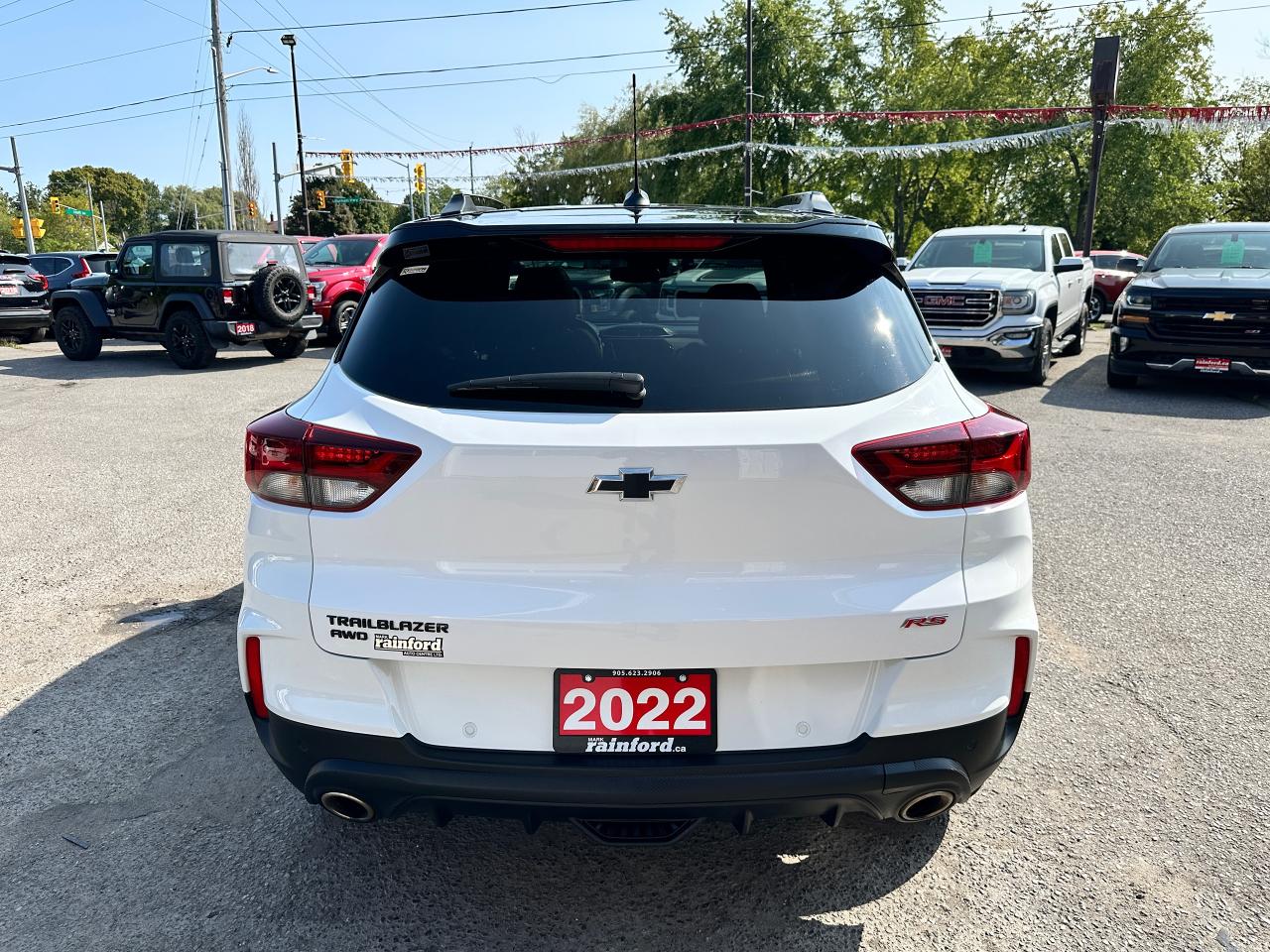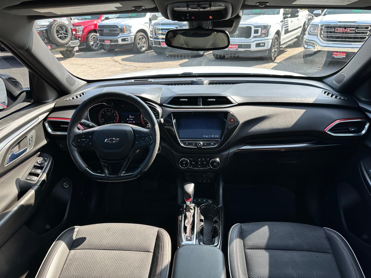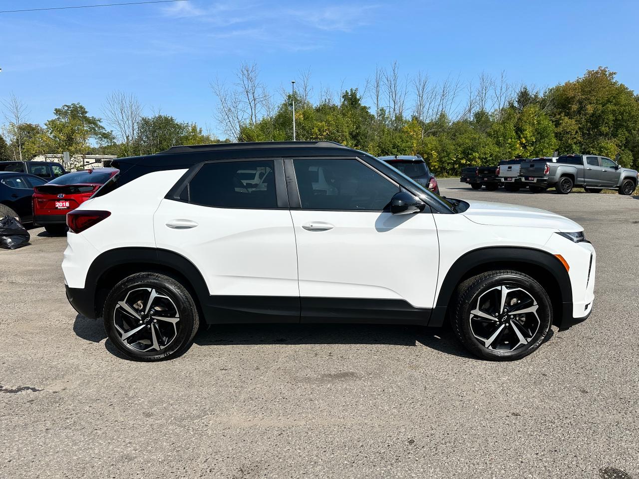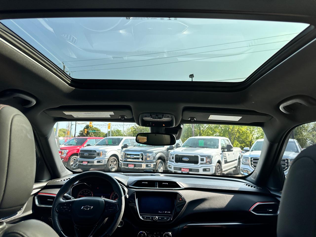 WOW! Super-Clean and exceptionally well optioned Chevrolet TrailBlazer from Brockville, ON! This RS AWD model looks awesome in its White paint and factory machine-finished alloy wheels with fantastic options inside and out! The exterior features keyless entry with remote start and proximity keys, a large Panoramic Sunroof, automatic headlights, foglights, automatic high beams, tinted privacy glass, blind spot monitors, forward collision warning, parking sensors, lane departure warning, roof rack rails, RS badging, and gorgeous factory split spoke alloy wheels, power rear liftgate, a peppy fuel efficient 1.3L 3-Cylinder Turbocharged Engine and Automatic transmission powering the All-Wheel-Drive system! The interior is clean and comfortable with heated cloth front seats with driver's power adjustment and lumbar controls, stylish interior accenting, power door locks, windows and mirrors, customizable rear gate opening height, a heated leather wrapped steering wheel with red accent stitching, Audio and Cruise controls, push button start, an easy to read and use gauge cluster, a large central touch screen AM/FM/XM Satellite HD Radio with BOSE Premium Audio, Bluetooth, Apple CarPlay, Android Auto, WiFi Settings, Backup Camera and OnStar Turn-By-Turn, A/C Climate control with front and rear window defrost settings, Auto-Stop/Start Override, Sport/AWD selection modes, Multiple USB/AUX/12V accessory ports, wireless device charger and more!
