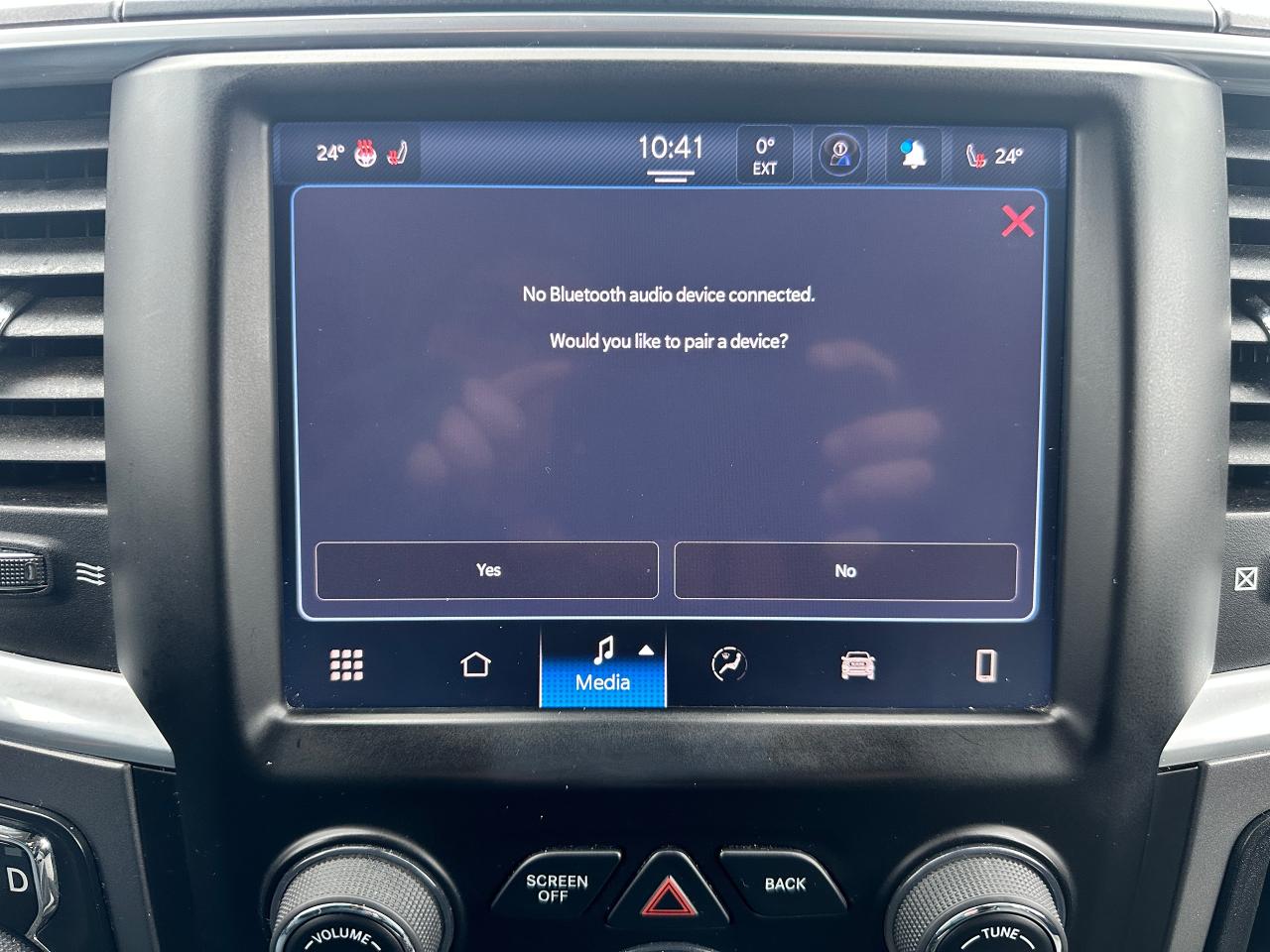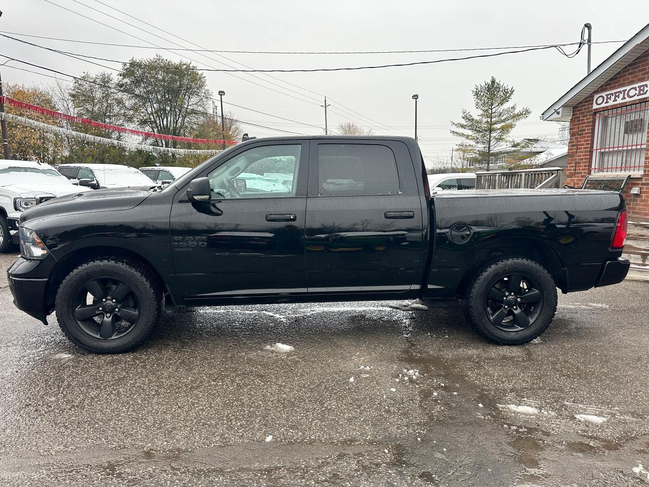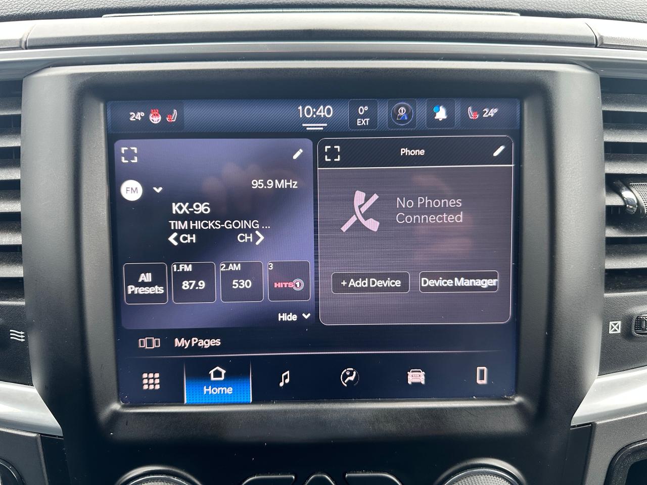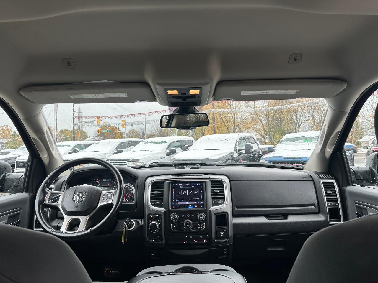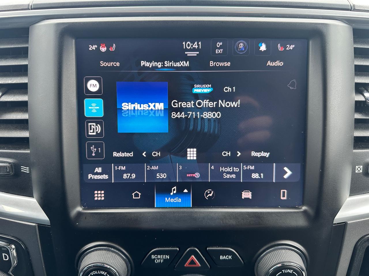 Super-Clean, One-Owner RAM 1500 from North York, ON! This Classic SLT 4x4 Crew Cab looks sharp in its timeless Black/Black colour scheme, with great convenience options inside and out! The exterior features keyless entry with remote start, automatic headlights, foglights, power folding heated side mirrors with integrated turn signals, tinted rear privacy glass and a power sliding rear window, a trailer hitch, parking sensors, a hard folding tonneau cover, gorgeous Black factory alloy wheels, a powerful 3.6L V6 Engine and an Automatic transmission driving the 4x4 system! The interior is clean and comfortable with seating for 6 through its heated front seats with driver's power adjustment and lumbar controls, fold-up centre console, and comfortable and spacious rear seating, all-weather floor mats front and rear, power door locks, mirrors and windows, a heated leather wrapped steering wheel with Audio and Cruise controls, an easy to read and use gauge cluster, gear selection knob and electronic 4x4 selection buttons, a large central touch screen AM/FM/XM Satellite Radio with Bluetooth, Apple CarPlay, Android Auto, Climate Creen and Backup Camera, Dual-Zone A/C climate controls with front and rear window defrost settings, Tow/Haul mode, USB/AUX/12V accessory ports, Universal Garage Door openers, and more!