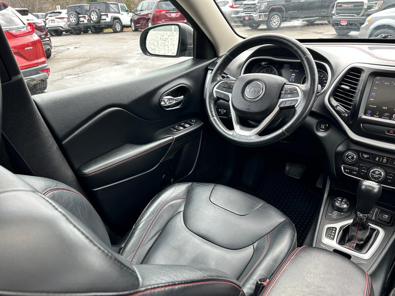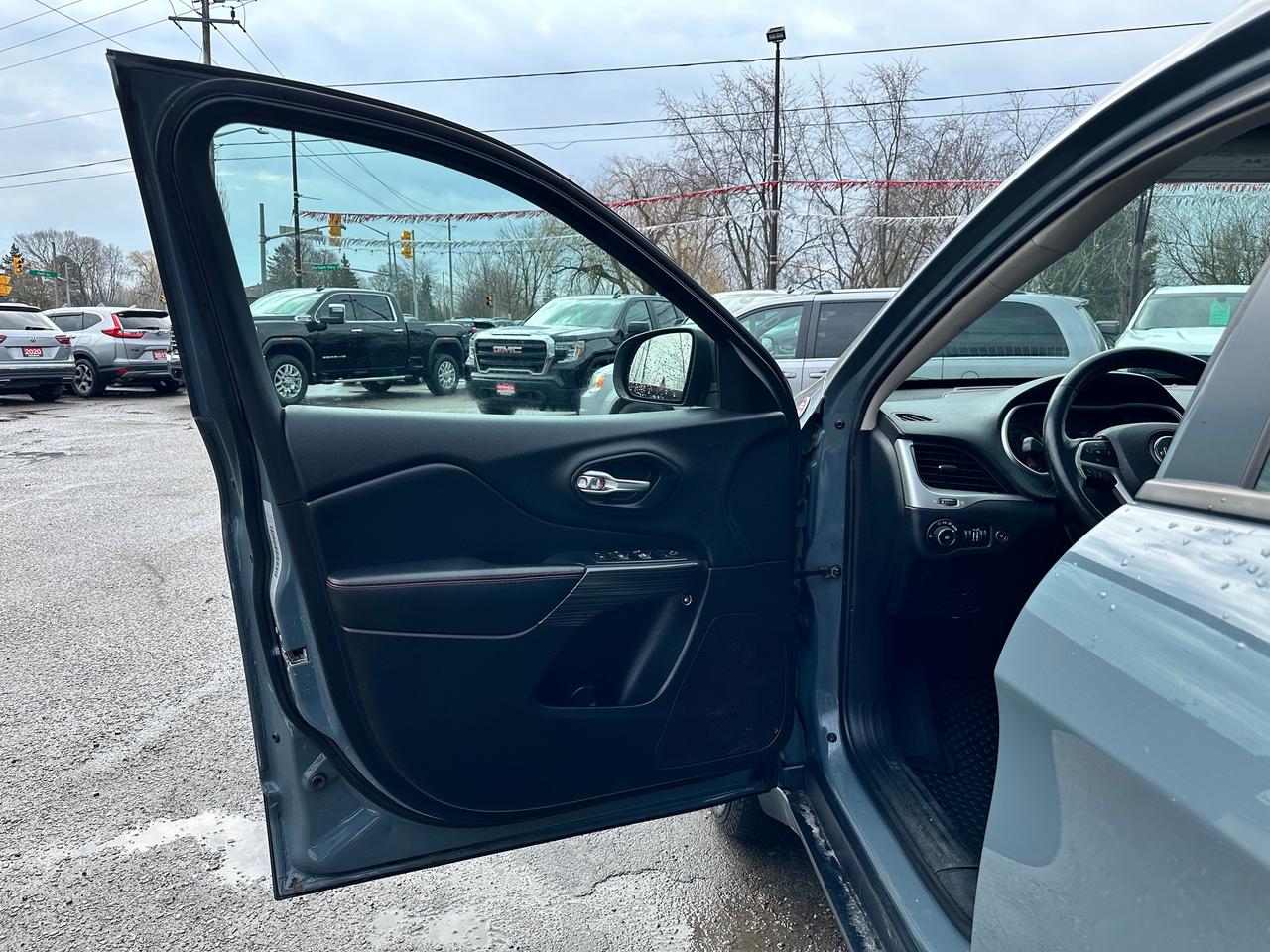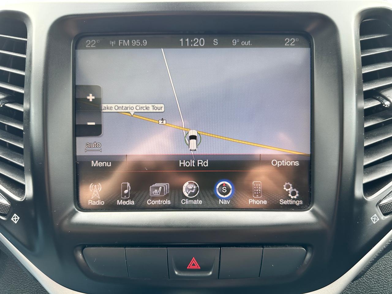 WOW! Super-Clean and well-maintained Jeep Cherokee from Kingston, ON! This Trailhawk 4x4 model looks awesome in its Grey paint and factory alloy wheels, with nice options inside and out! The exterior features keyless entry with remote start and proximity keys, a large factory power sunroof, remote power tailgate, automatic headlights, foglights, roof rack rails, heated side mirrors, front and rear tow hooks in bright red, a trailer hitch, tinted privacy glass, factory machine-finished alloy wheels, a powerful 3.2L V6 Engine and Automatic transmission driving the 4x4 system! The interior is clean and comfortable, featuring heated leather front seats with driver's power adjustment and lumbar control, red accent stitching, power door locks, mirrors and windows, a heated leather wrapped steering wheel with Audio and Cruise controls, an easy to read and use gauge cluster, push button start, a large central touch screen AM/FM/XM Satellite Radio with Bluetooth, Navigation, and Backup Camera, Dual-Zone A/C climate controls with front and rear window defrost settings, comfortable and spacious rear seating, all-weahter floor mats, electronic 4x4 selection knob with multiple terrain modes, universal garage door openers, USB/AUX/12V/SD accessory ports, and more!