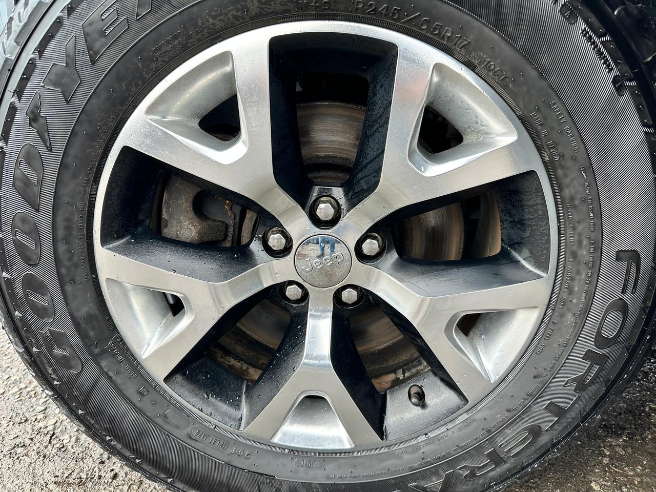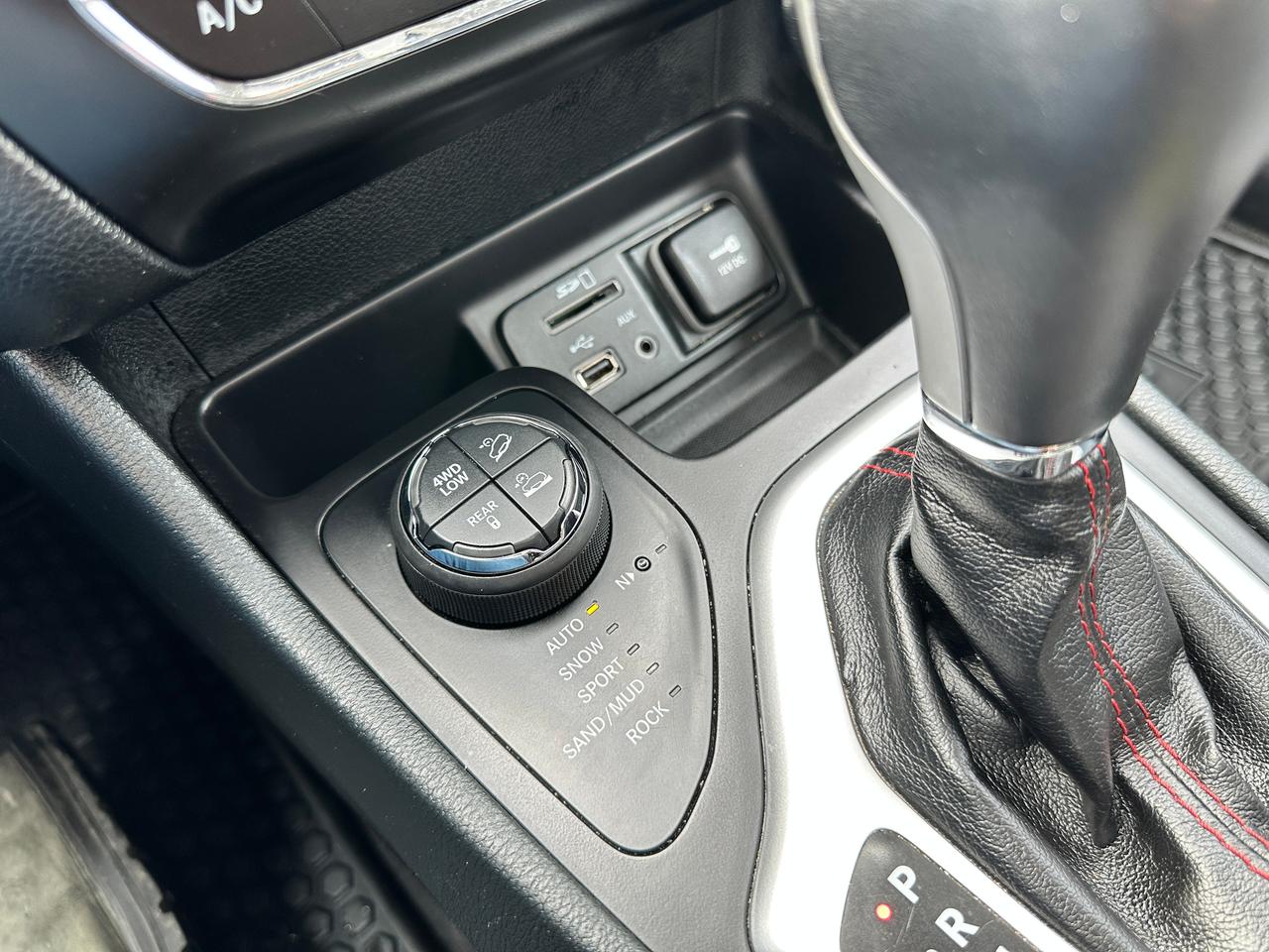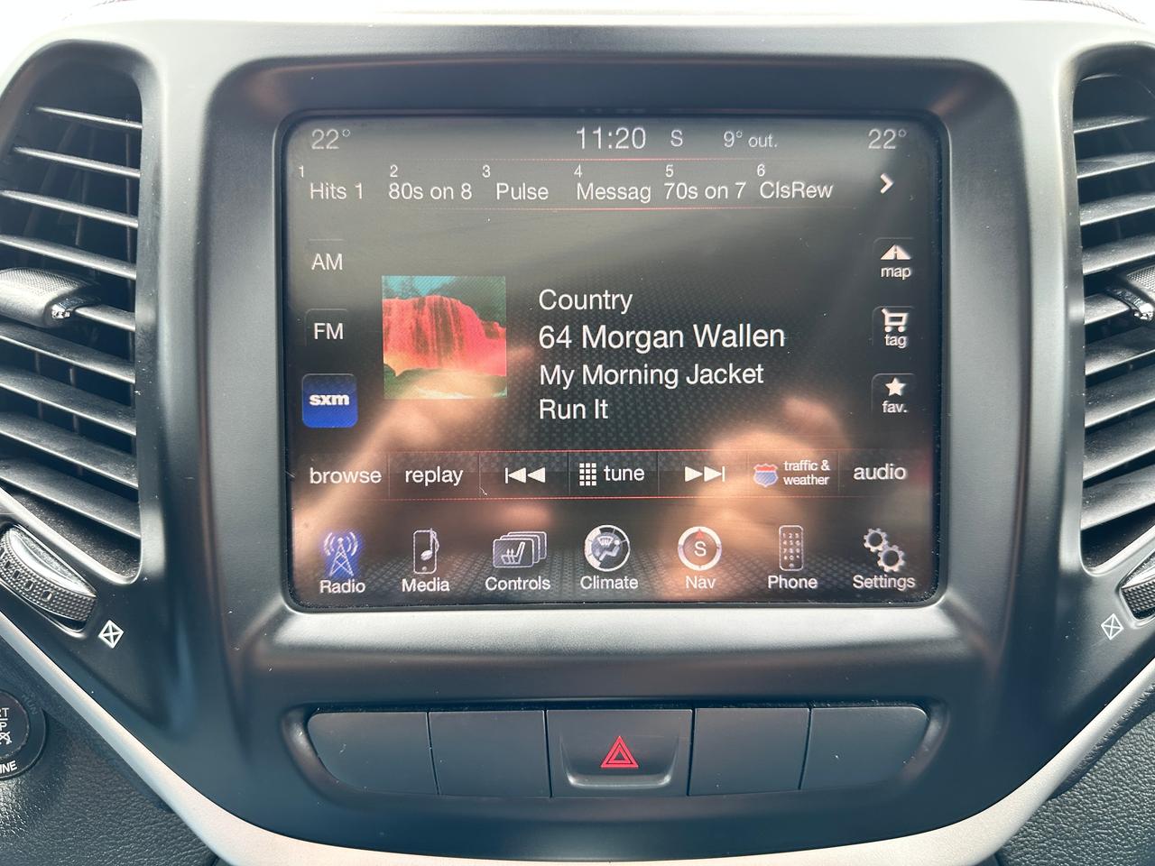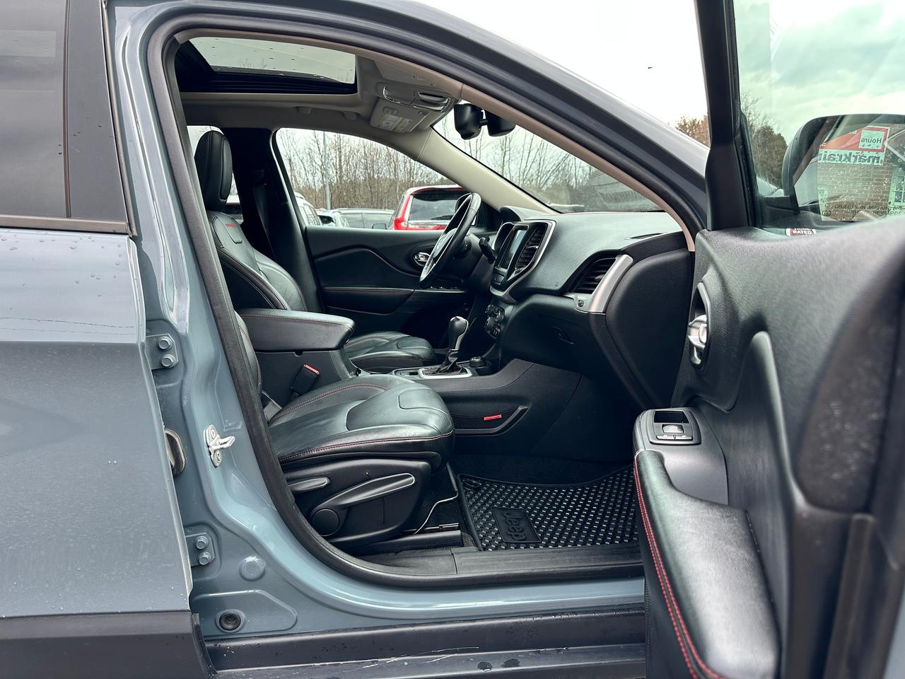 WOW! Super-Clean and well-maintained Jeep Cherokee from Kingston, ON! This Trailhawk 4x4 model looks awesome in its Grey paint and factory alloy wheels, with nice options inside and out! The exterior features keyless entry with remote start and proximity keys, a large factory power sunroof, remote power tailgate, automatic headlights, foglights, roof rack rails, heated side mirrors, front and rear tow hooks in bright red, a trailer hitch, tinted privacy glass, factory machine-finished alloy wheels, a powerful 3.2L V6 Engine and Automatic transmission driving the 4x4 system! The interior is clean and comfortable, featuring heated leather front seats with driver's power adjustment and lumbar control, red accent stitching, power door locks, mirrors and windows, a heated leather wrapped steering wheel with Audio and Cruise controls, an easy to read and use gauge cluster, push button start, a large central touch screen AM/FM/XM Satellite Radio with Bluetooth, Navigation, and Backup Camera, Dual-Zone A/C climate controls with front and rear window defrost settings, comfortable and spacious rear seating, all-weahter floor mats, electronic 4x4 selection knob with multiple terrain modes, universal garage door openers, USB/AUX/12V/SD accessory ports, and more!