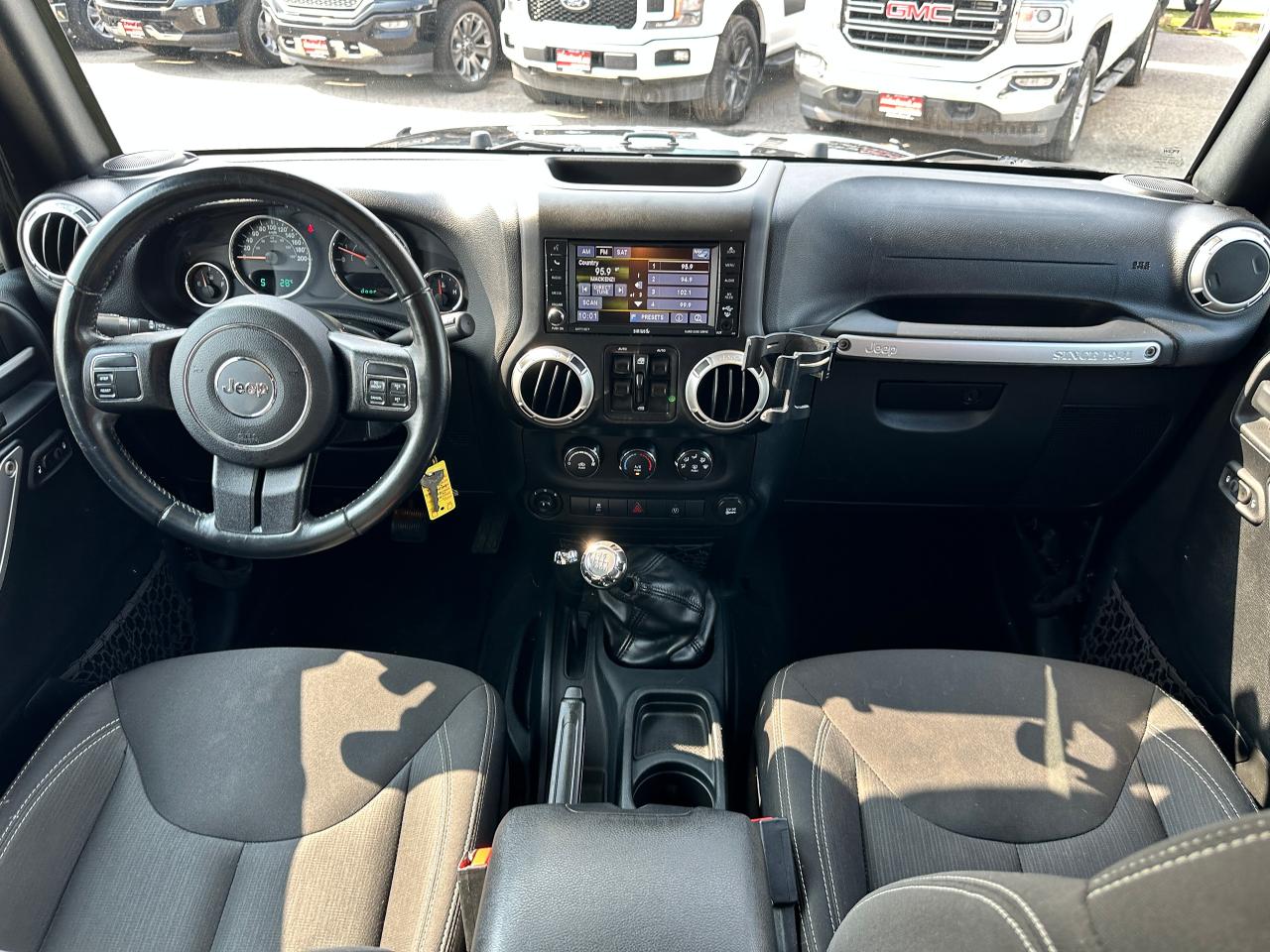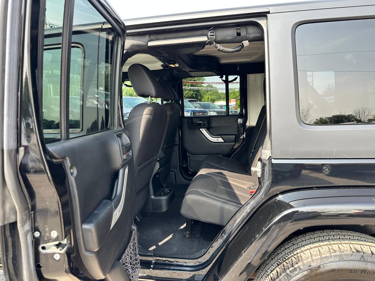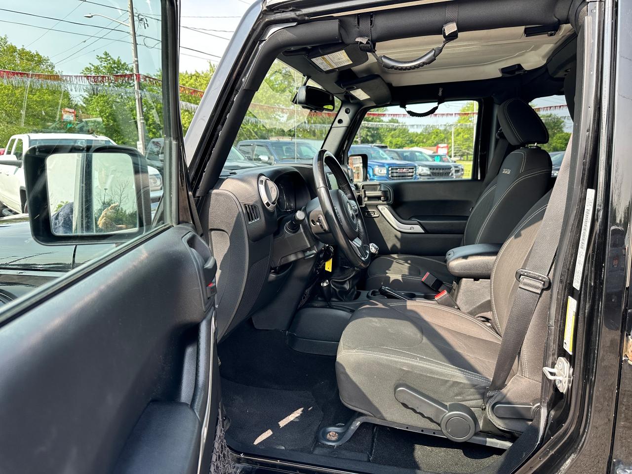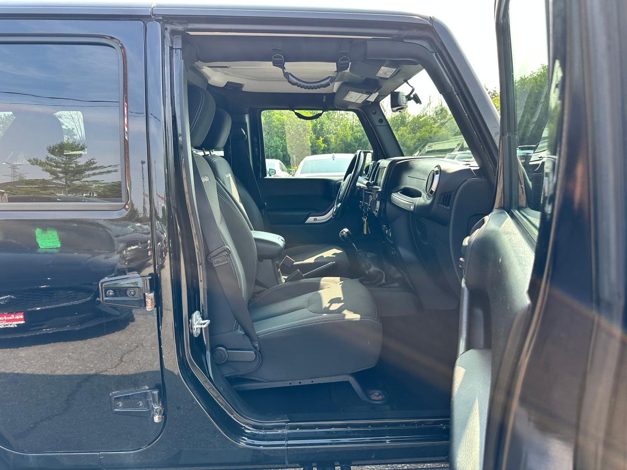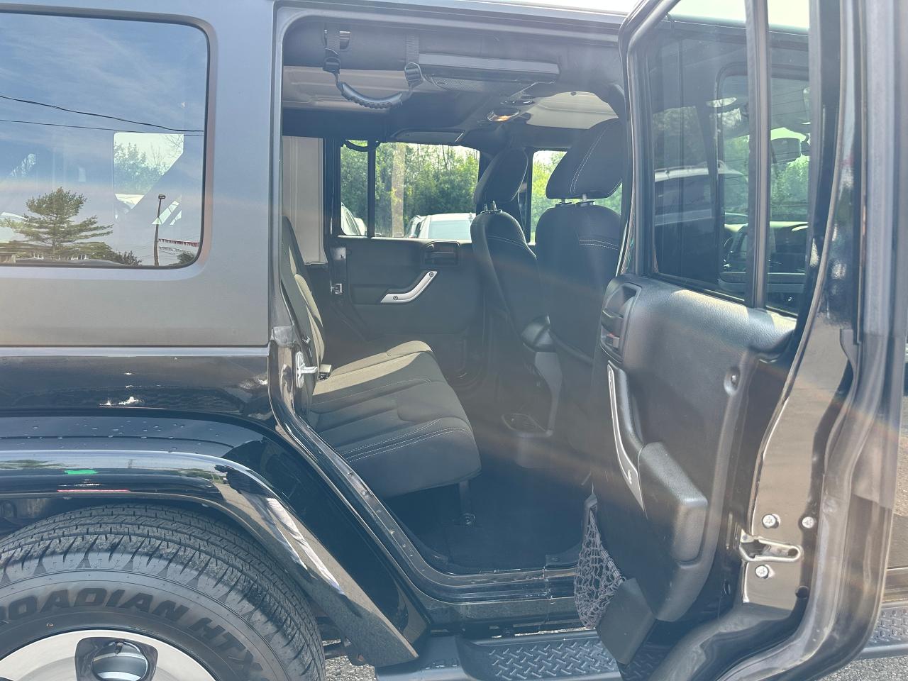 Super-Clean, Local Jeep Wrangler Unlimited from Bowmanville, ON! This Sahara 4x4 model looks great in its Black paint and factory alloy wheels, and is ready to take you to your next adventure! The exterior features keyless entry, automatic headlights, foglights, tinted privacy glass, front and rear tow hooks, a trailer hitch, a removable factory hard-top and removable passenger doors, colour-matched fenders, gorgeous factory alloy wheels, a powerful 3.6L V6 Engine and a 6-Speed manual transmission drive the 4x4 system! The interior is clean and comfortable with cloth seating for all 5 occupants, power door locks, windows and mirrors, a leather wrapped steering wheel with Audio and Cruise controls, an easy to read and use gauge cluster, a large central touch screen AM/FM/XM Satellite Radio with Navigation, MP3 Capabilities and CD Player, A/C climate control with front and rear window defrost settings, USB/AUX/12V acessory ports and more!