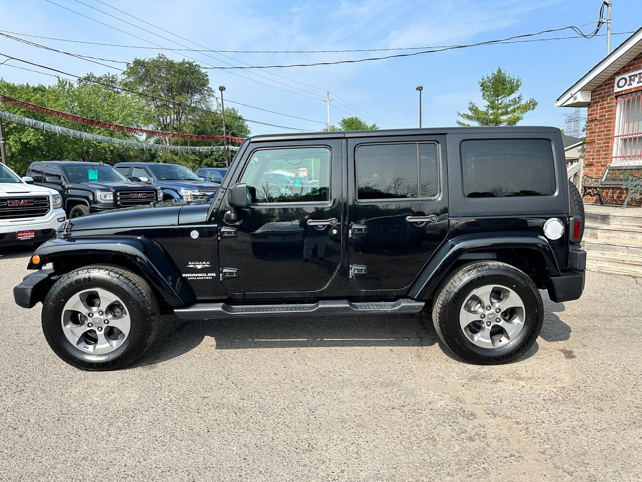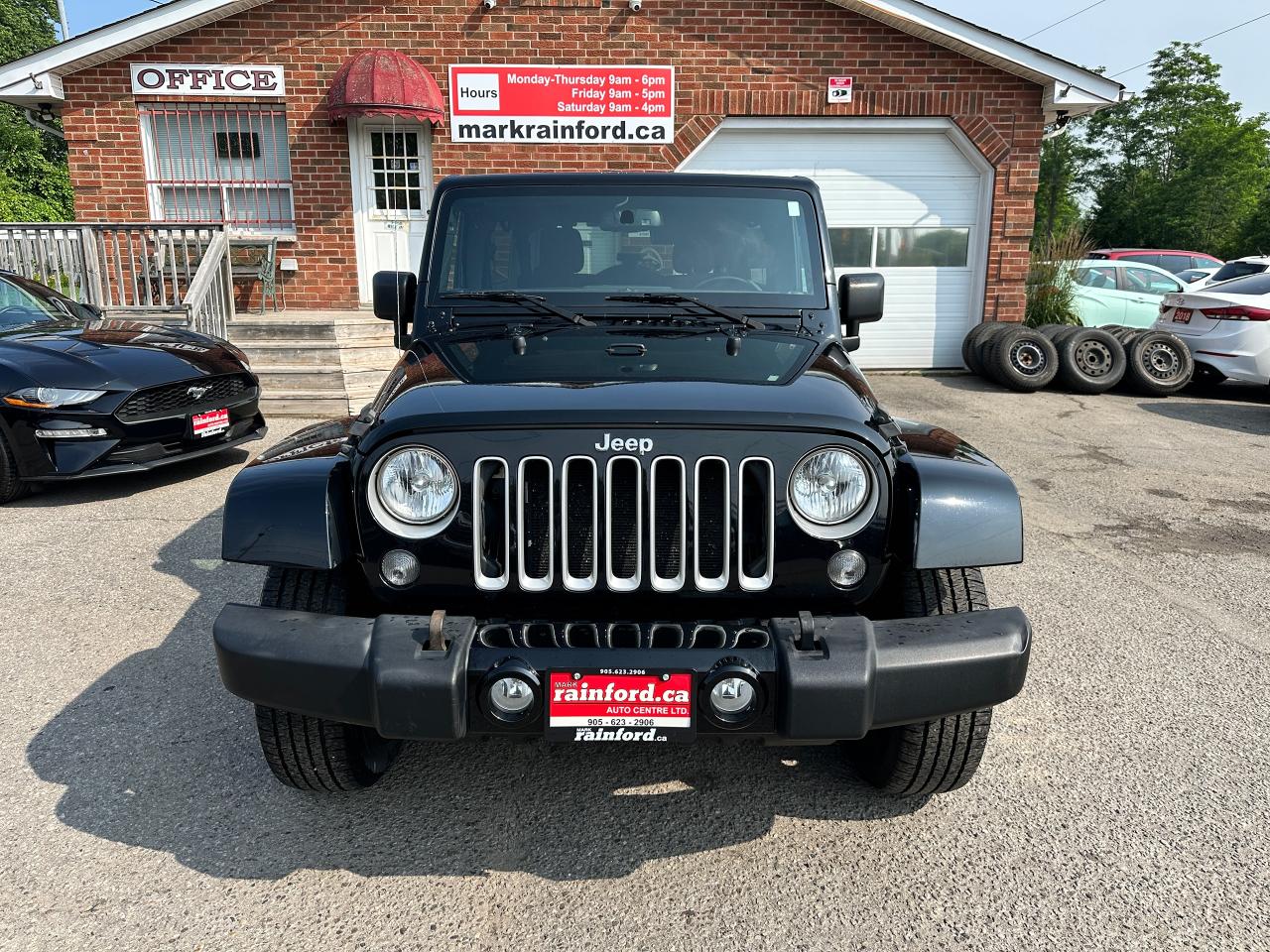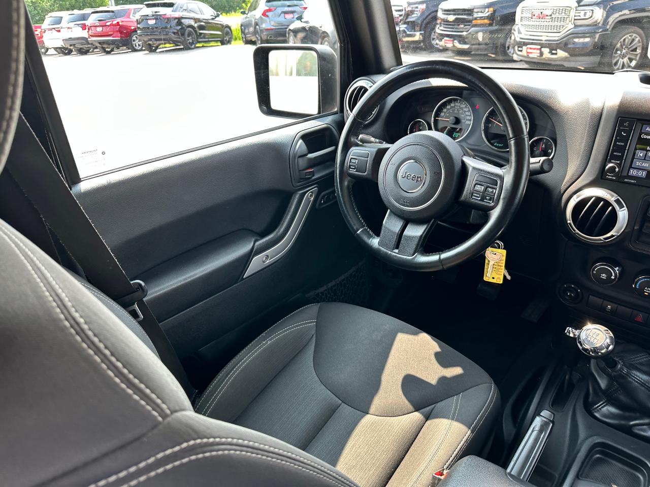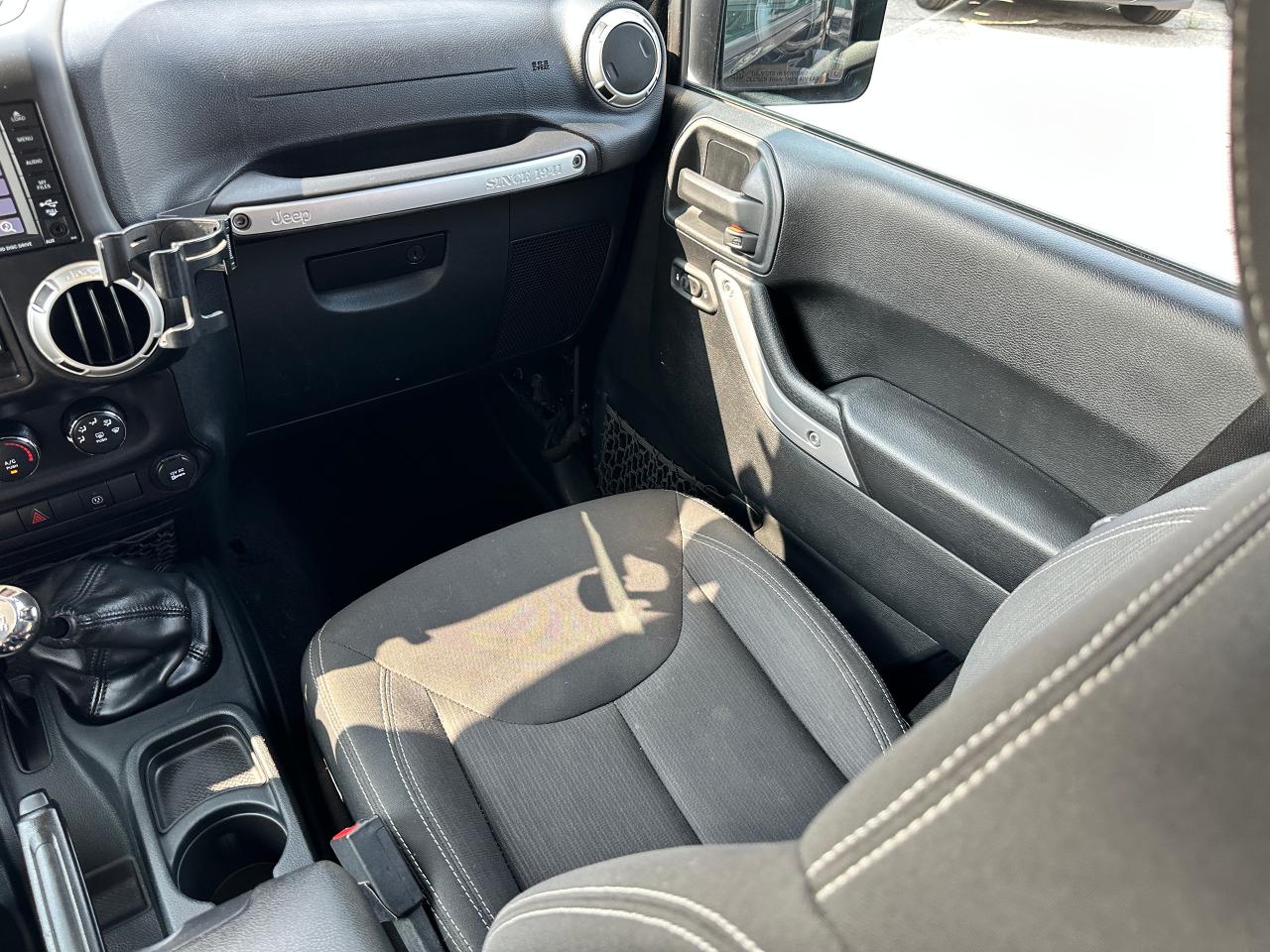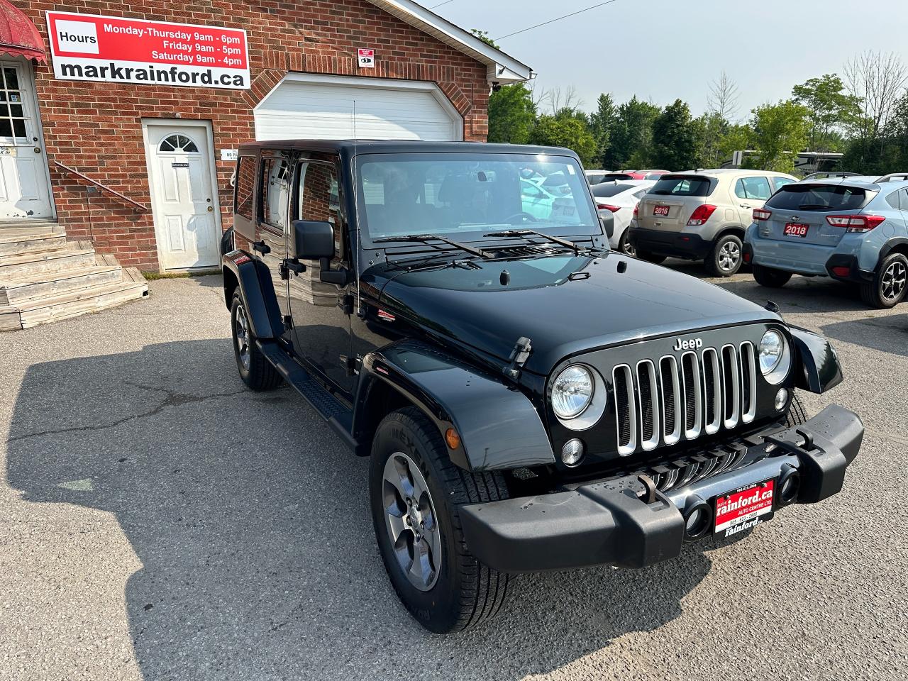 Super-Clean, Local Jeep Wrangler Unlimited from Bowmanville, ON! This Sahara 4x4 model looks great in its Black paint and factory alloy wheels, and is ready to take you to your next adventure! The exterior features keyless entry, automatic headlights, foglights, tinted privacy glass, front and rear tow hooks, a trailer hitch, a removable factory hard-top and removable passenger doors, colour-matched fenders, gorgeous factory alloy wheels, a powerful 3.6L V6 Engine and a 6-Speed manual transmission drive the 4x4 system! The interior is clean and comfortable with cloth seating for all 5 occupants, power door locks, windows and mirrors, a leather wrapped steering wheel with Audio and Cruise controls, an easy to read and use gauge cluster, a large central touch screen AM/FM/XM Satellite Radio with Navigation, MP3 Capabilities and CD Player, A/C climate control with front and rear window defrost settings, USB/AUX/12V acessory ports and more!
