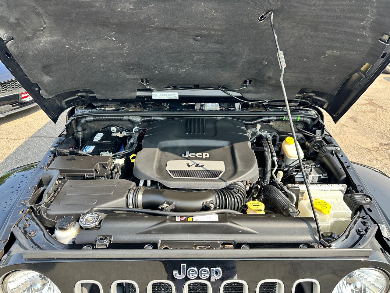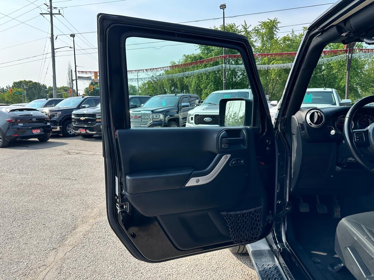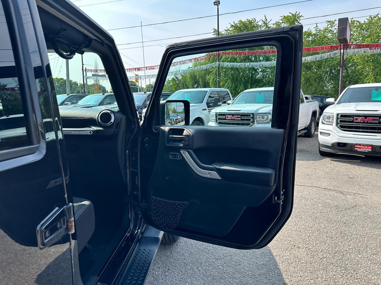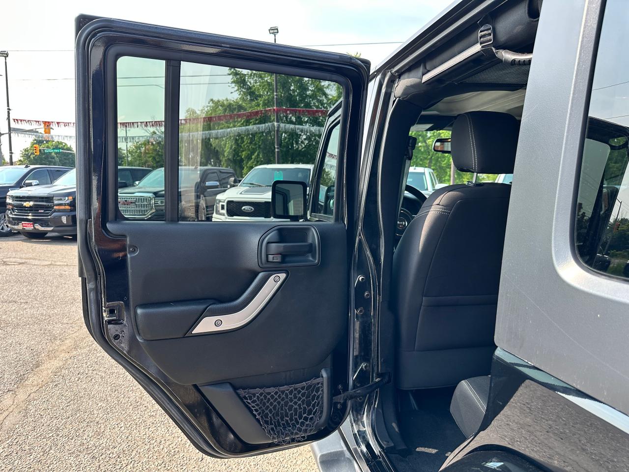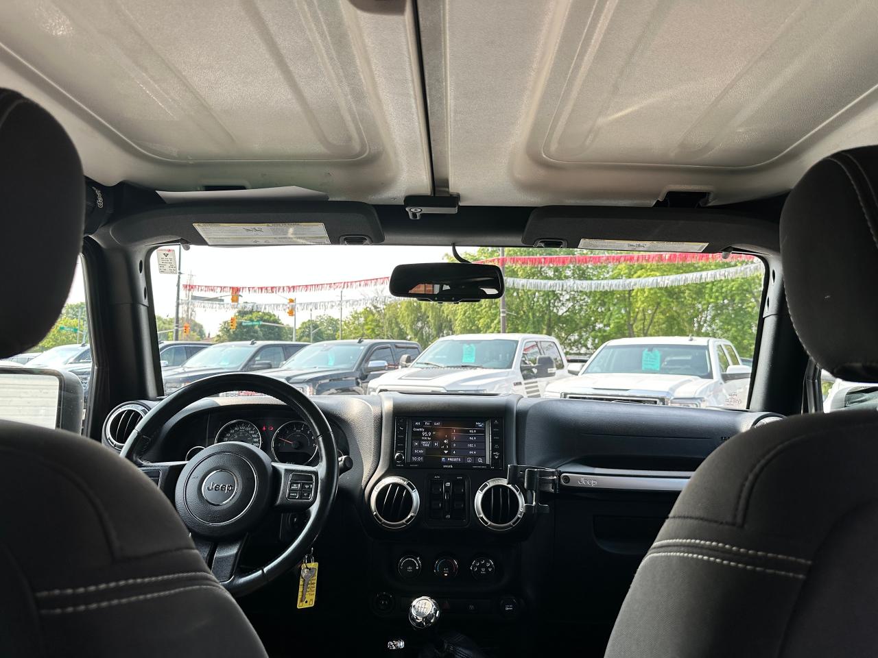 Super-Clean, Local Jeep Wrangler Unlimited from Bowmanville, ON! This Sahara 4x4 model looks great in its Black paint and factory alloy wheels, and is ready to take you to your next adventure! The exterior features keyless entry, automatic headlights, foglights, tinted privacy glass, front and rear tow hooks, a trailer hitch, a removable factory hard-top and removable passenger doors, colour-matched fenders, gorgeous factory alloy wheels, a powerful 3.6L V6 Engine and a 6-Speed manual transmission drive the 4x4 system! The interior is clean and comfortable with cloth seating for all 5 occupants, power door locks, windows and mirrors, a leather wrapped steering wheel with Audio and Cruise controls, an easy to read and use gauge cluster, a large central touch screen AM/FM/XM Satellite Radio with Navigation, MP3 Capabilities and CD Player, A/C climate control with front and rear window defrost settings, USB/AUX/12V acessory ports and more!