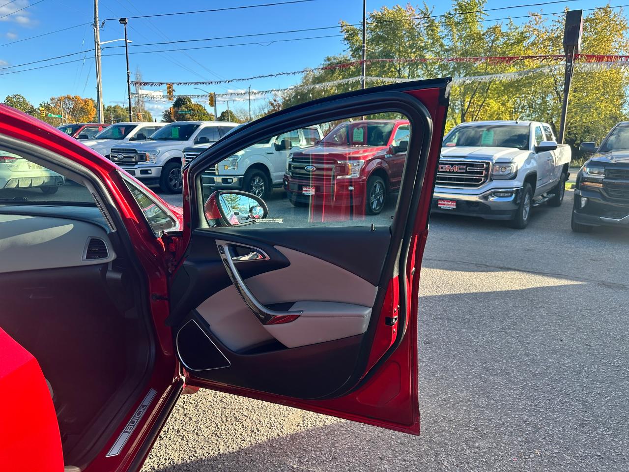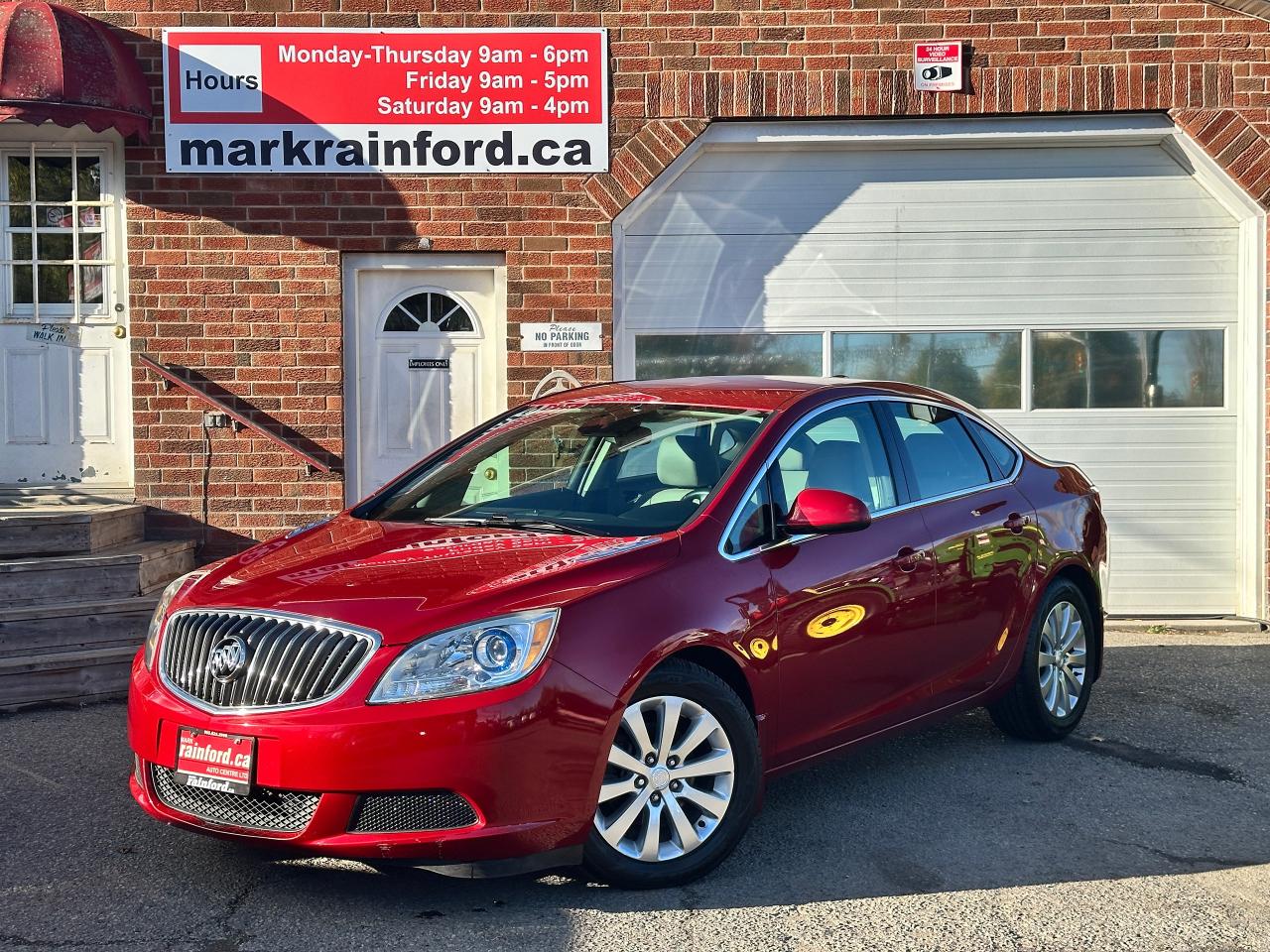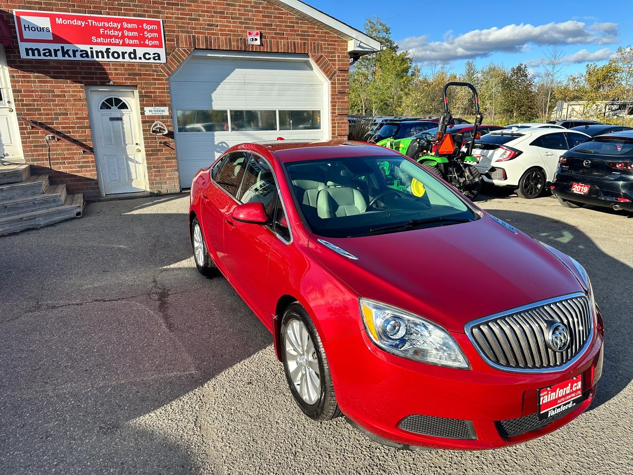 Super-Clean, LOW KM Buick Verano from Napanee, ON! This Convenience model looks great in it's Red paint and factory alloy wheels, with great options inside and out! The exterior feature keyless entry with remote start, automatic headlights, colour matched side mirrors, remote trunk release, a powerful 2.4L 4-cylindr Engine and Automatic transmission! The interior is clean and comfortable with heated cloth centred seats with drivers power adjustment and lumbar control, power door locks, windows and mirrors, a leather wrapped steering wheel with Audio and Cruise controls, an easy to read and use Gauge cluster, a central touch screen AM/FM/XM Satellite Radio with Bluetooth Handsfree, Backup Camera and CD Player, Dual-Zone A/C climate control with front and rear window defrost settings, USB/AUX/12V accessory ports and more!