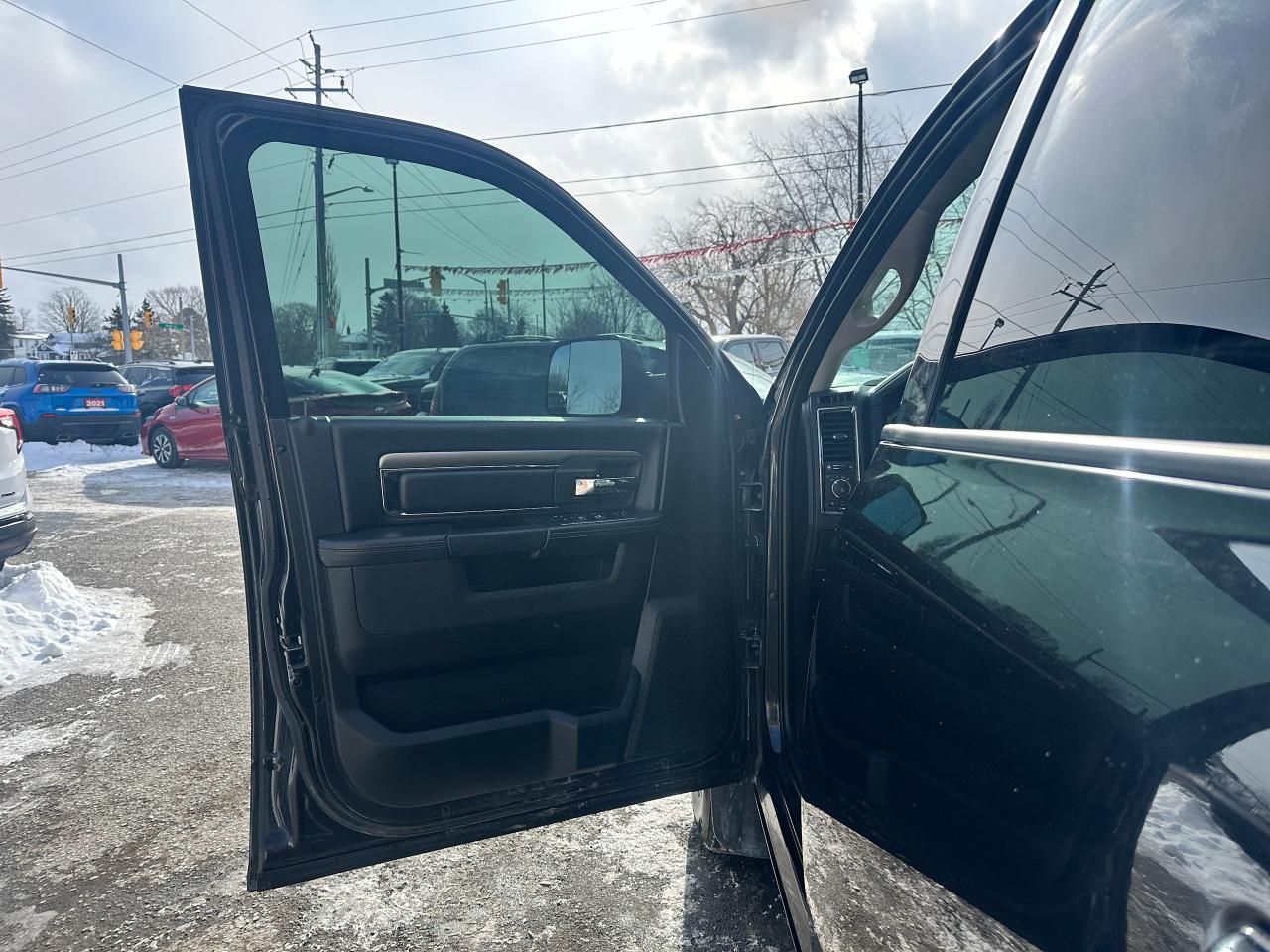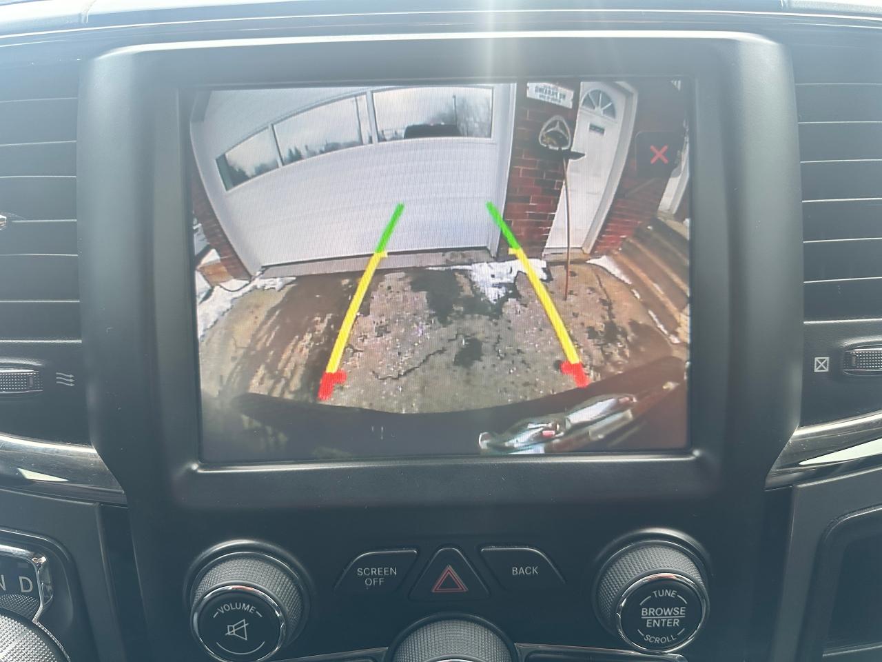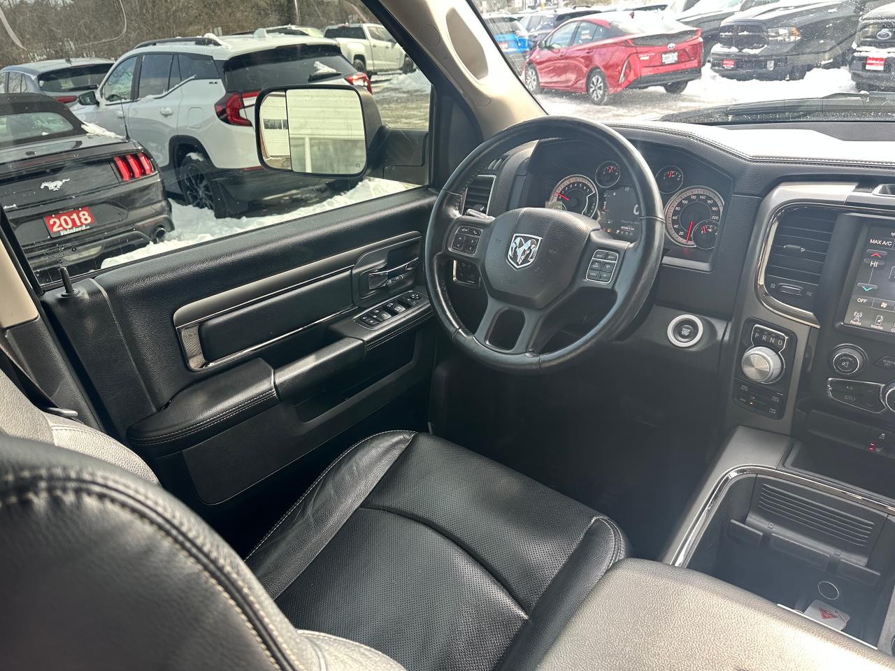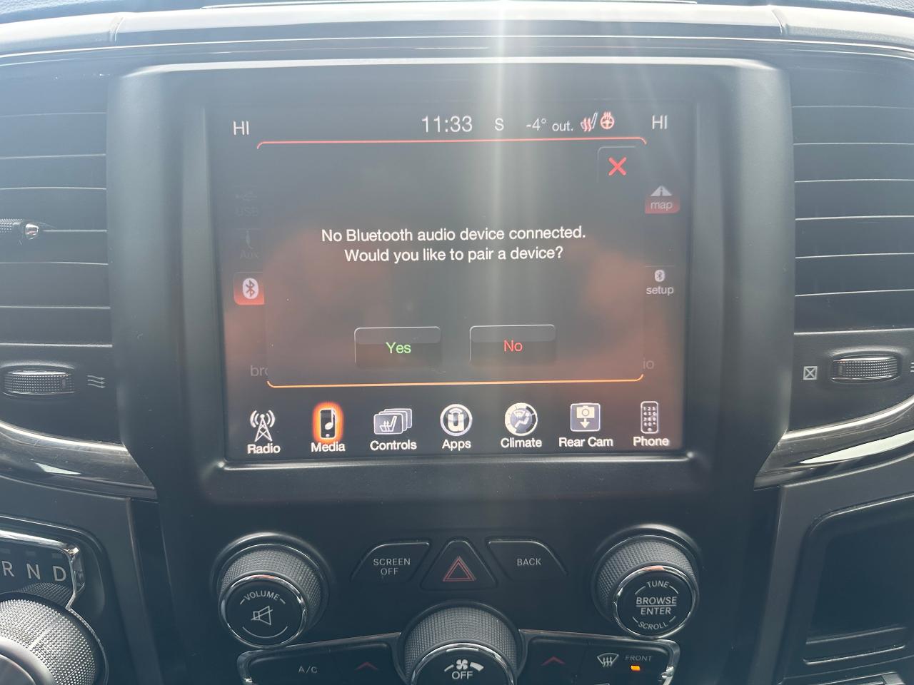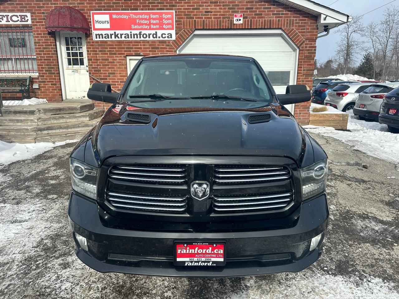 Super-Clean and well-optioned local trade-in RAM 1500 from Bowmanville, ON! This RAM 4x4 Sport model looks sharp in its Black paint and factory alloy wheels! The exterior features keyless entry with remote start and proximity key, automatic headlights, foglights, black tow-style mirrors with integrated turn signals, tinted privacy glass, sporty dual rear exhaust, a trailer hitch, spray-in bedliner, gorgeous factory polished alloy wheels and NEW All-Season tires, a powerful 5.7L V8 Engine and Automatic transmission driving the 4x4 system! The interior is clean and comfortable with Heated and Cooled front Leather Seats with power adjustment and lumbar controls, spacious rear seating, all-weather floor mats, power door locks, windows and mirrors, a heated leather-wrapped steering wheel with Audio and Cruise controls, push-button start and electronic 4x4 selection buttons, an easy-to-read and use gauge cluster, a large central touch screen AM/FM/XM Satellite Radio with Premium ALPINE Audio, Navigation, Bluetooth, and Backup Camera, Dual-Zone A/C climate controls with font andrear window defrost settings, Tow/Haul mode, USB/AUX/12V accessory ports and more!