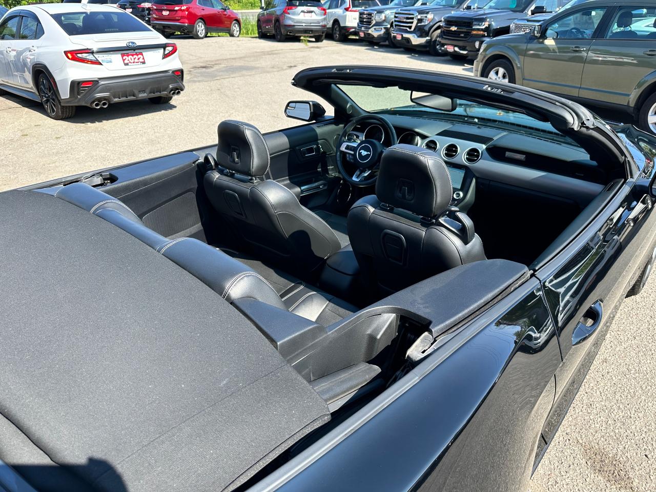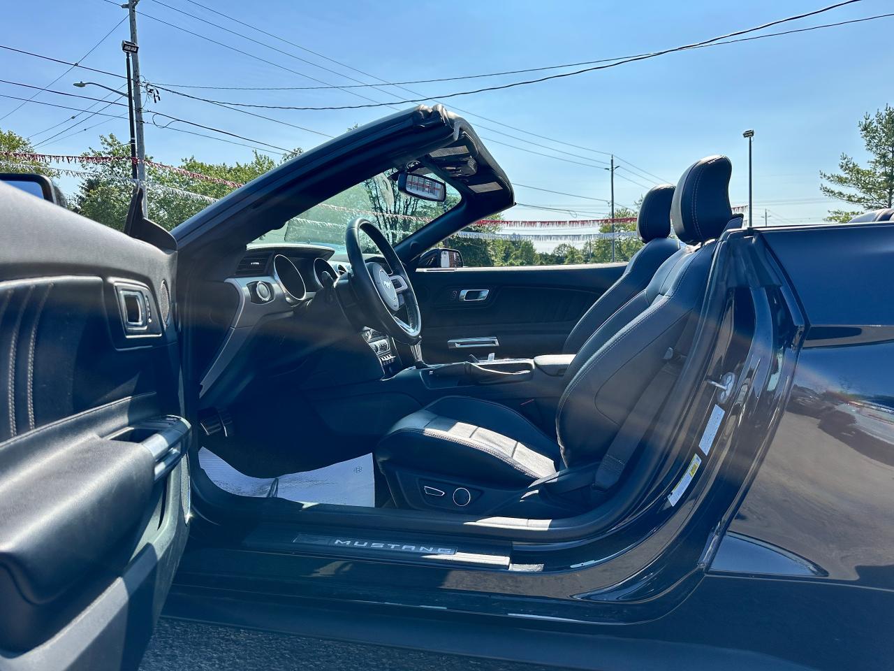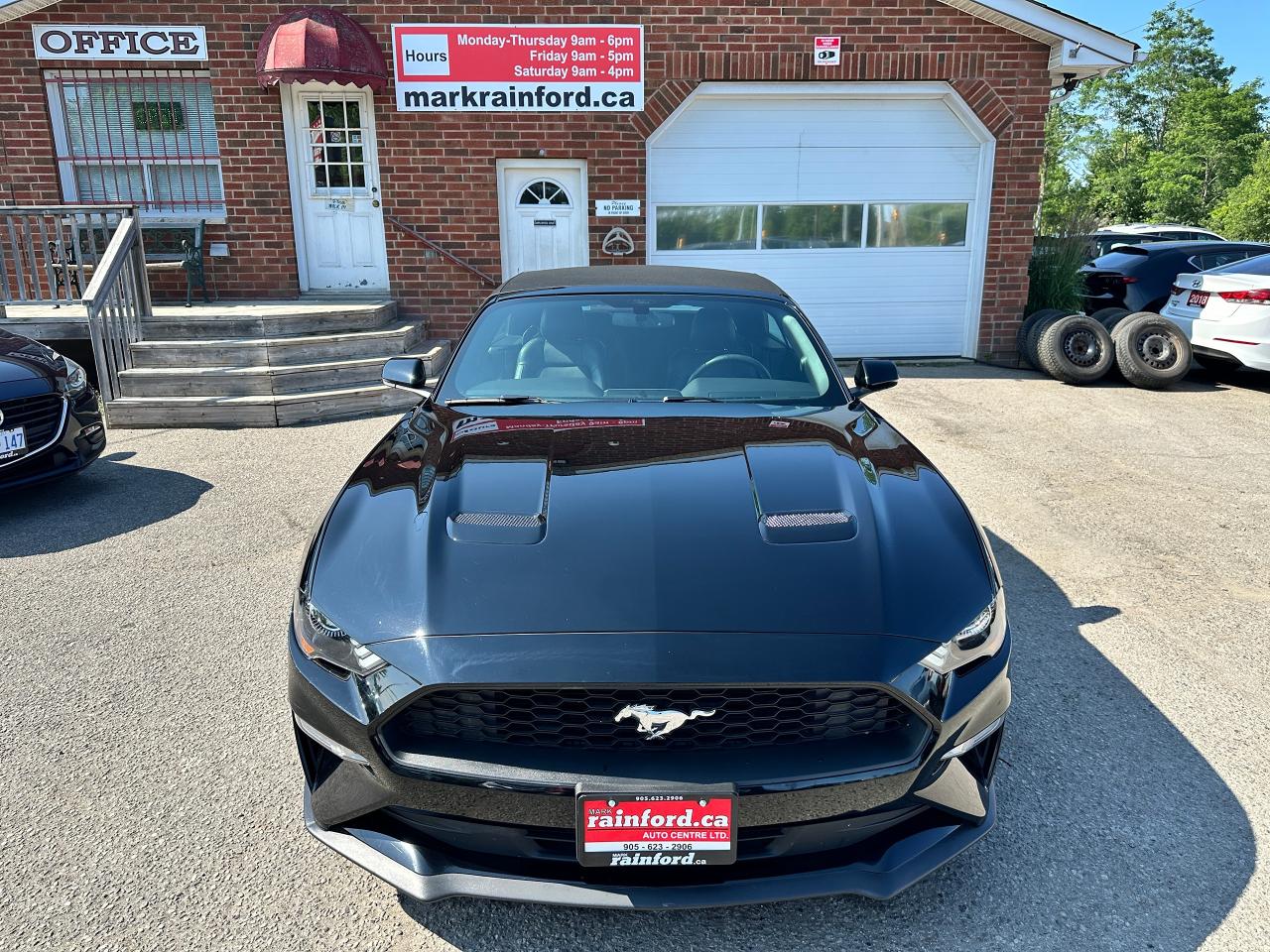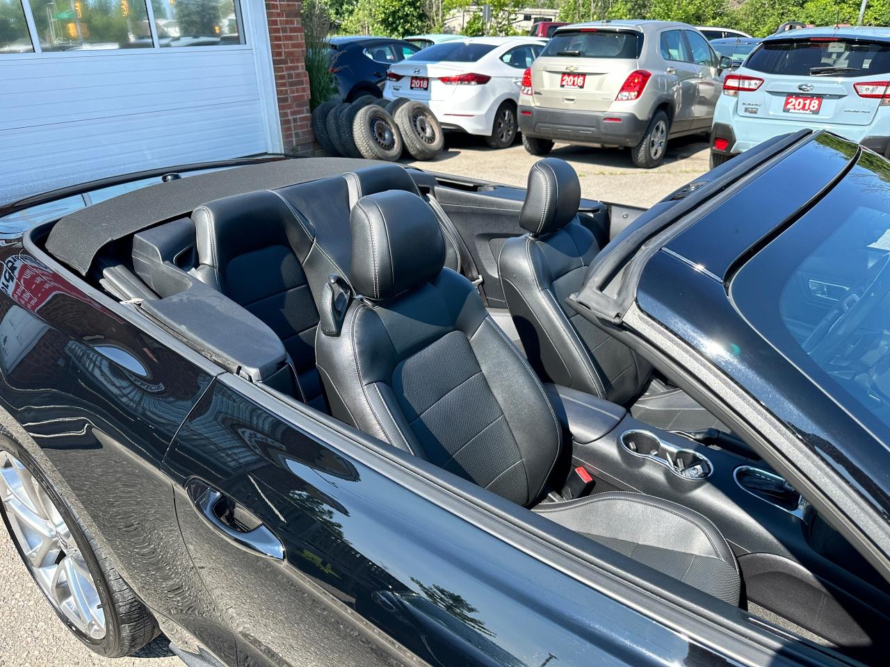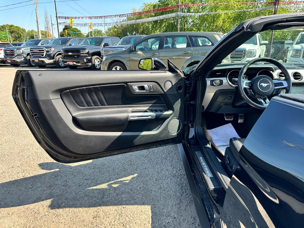 Super-Clean LOW LOW KM Ford Mustang from Lindsay, ON! This EcoBoost Premium Convertible model is absolutely stunning in its Black paint and sharp factory alloy wheels, with fantastic options inside and out! The exterior features keyless entry with remote start and proximity keys, automatic headlights, foglights, colour-matched side mirrors with integrated turn signals, a sporty dual exhaust, a sleek slim decklid spoiler, parking sensors, fabric convertible top in excellent shape, a set of gorgeous factory split spoke alloy wheels, a powerful and fuel-efficient 2.3L 4-cylinder Turbocharged engine and Automatic transmission drive this convertible through the corners! The interior is spotless and comfortable with heated and cooled front leather seats with power adjustment and driver's lumbar controls, power door locks, windows and mirrors, split rear seating, a leather wrapped steering wheel with Audio and Cruise controls, an easy to read and use gauge cluster, a large central touch screen AM/FM/XM Satellite Radio with Bluetooth, Navigation, Apple CarPlay, WiFi Settings, CD Player and Backup Camera, Dual-Zone A/C climate control with front and rear window defrost settings, multiple Drive and Steering modes from Comfort and Track to Snow settings, push-button start, USB/12V accessory ports, Universal Garage door opener, and more!