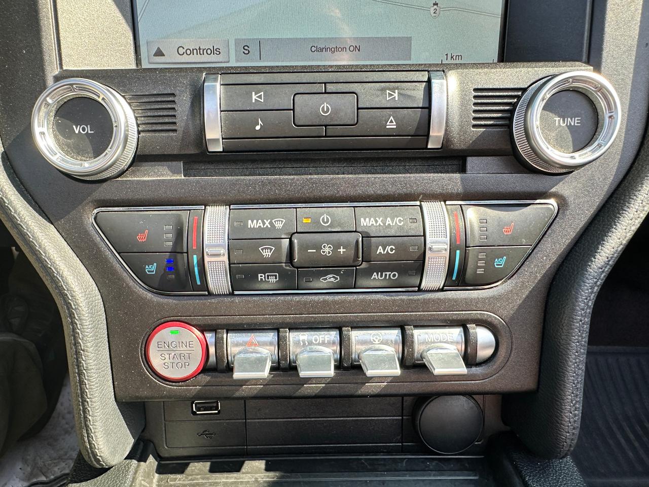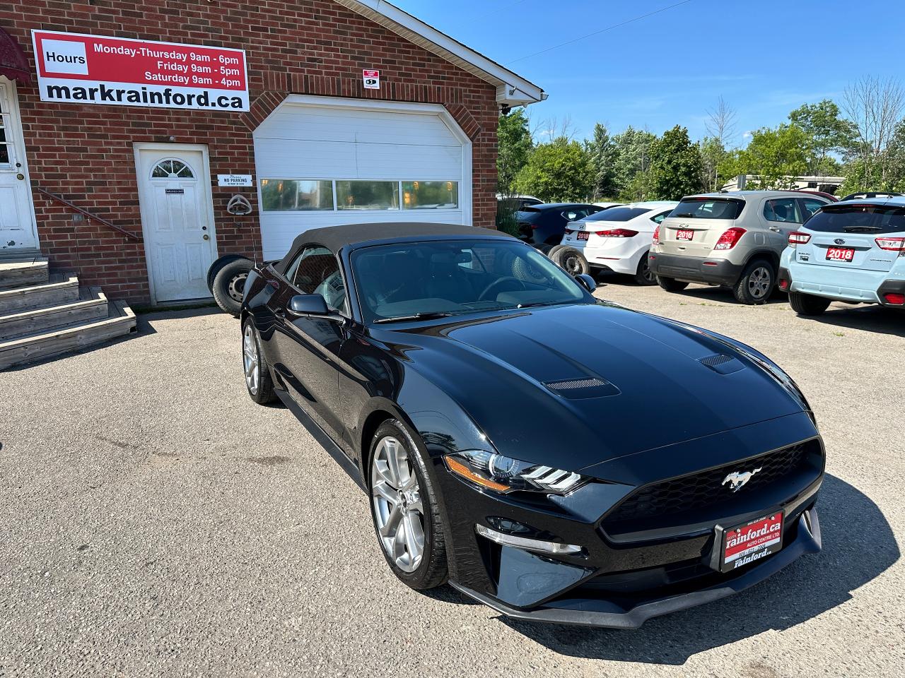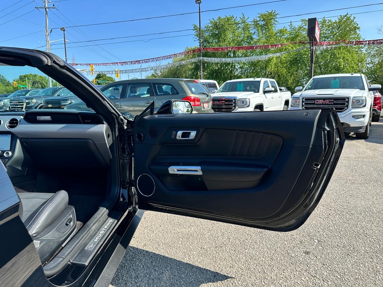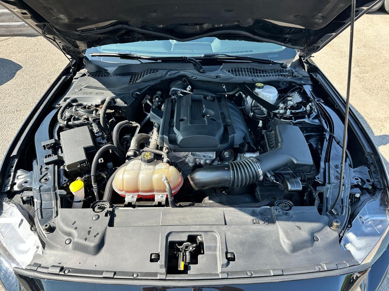 Super-Clean LOW LOW KM Ford Mustang from Lindsay, ON! This EcoBoost Premium Convertible model is absolutely stunning in its Black paint and sharp factory alloy wheels, with fantastic options inside and out! The exterior features keyless entry with remote start and proximity keys, automatic headlights, foglights, colour-matched side mirrors with integrated turn signals, a sporty dual exhaust, a sleek slim decklid spoiler, parking sensors, fabric convertible top in excellent shape, a set of gorgeous factory split spoke alloy wheels, a powerful and fuel-efficient 2.3L 4-cylinder Turbocharged engine and Automatic transmission drive this convertible through the corners! The interior is spotless and comfortable with heated and cooled front leather seats with power adjustment and driver's lumbar controls, power door locks, windows and mirrors, split rear seating, a leather wrapped steering wheel with Audio and Cruise controls, an easy to read and use gauge cluster, a large central touch screen AM/FM/XM Satellite Radio with Bluetooth, Navigation, Apple CarPlay, WiFi Settings, CD Player and Backup Camera, Dual-Zone A/C climate control with front and rear window defrost settings, multiple Drive and Steering modes from Comfort and Track to Snow settings, push-button start, USB/12V accessory ports, Universal Garage door opener, and more!