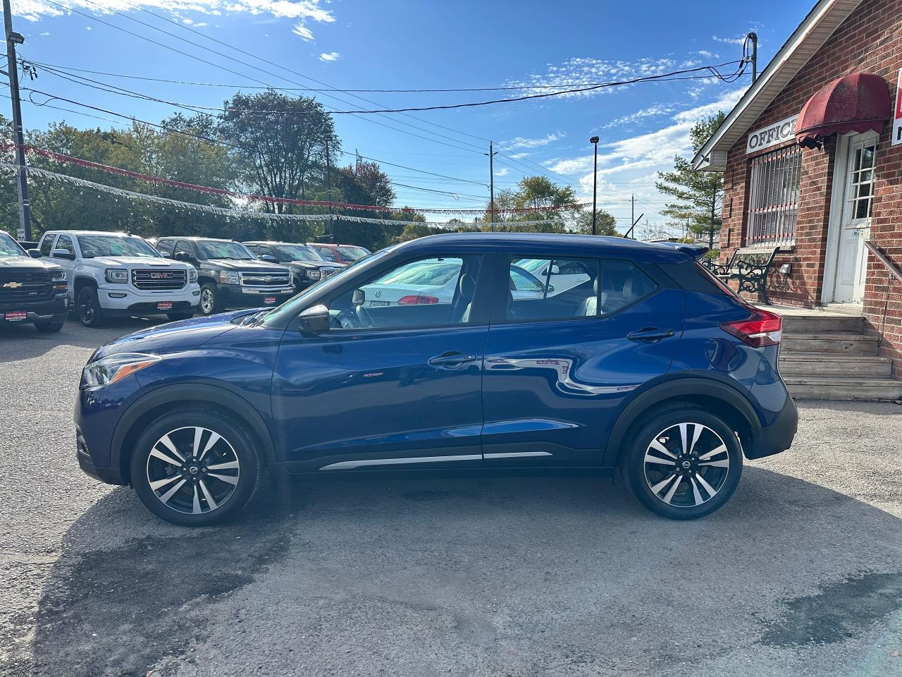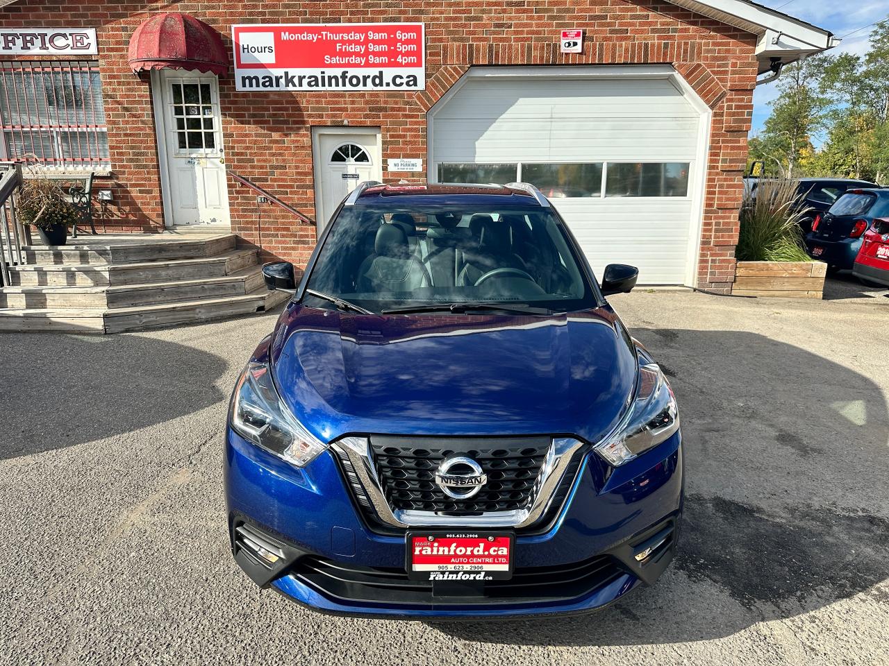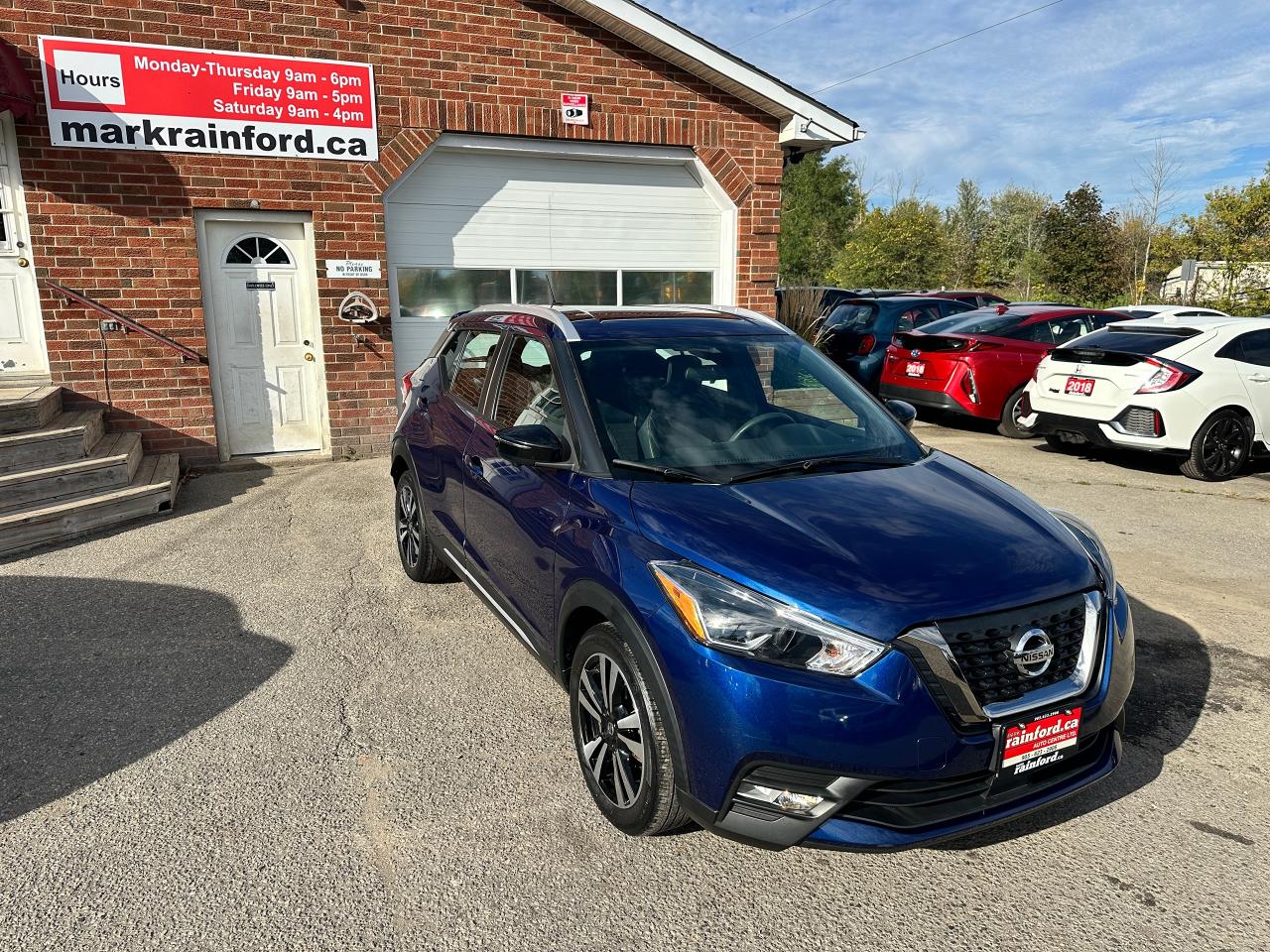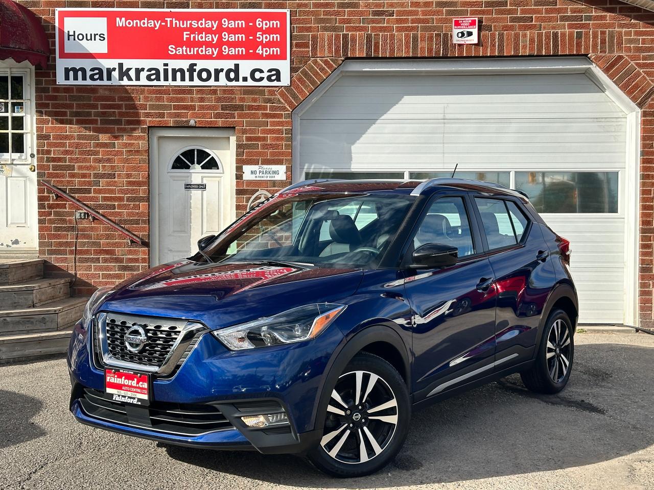 WOW! Super-Clean, LOW KM, One-Owner Nissan Kicks from Richmond Hill, ON! This SR FWD model looks incredible in its Beautiful Dark Blue paint and factory machine-finished alloy wheels, with great options inside and out! The exterior features keyless entry with remote start and proximity keys, sharp side mirrors with integrated turn signals, a sleek rear spoiler, parking sensors, roof rack rails, gorgeous factory alloy wheels, a peppy fuel-efficient 1.6L 4-cylinder Engine and CVT Auto Transmission! The interior is clean and comfortable, and full of tech with heated leather front seats, with drivers built in BOSE Personal Speakers, power door locks, windows and mirrors, comfortable rear seating and a large cargo area, orange accent stitching, a leather-wrapped and accented steering wheel with Audio and Cruise controls, an easy-to-read and use gauge cluster, push button start, a large central touch screen AM/FM/XM Satellite Radio with Bluetooth, Apple CarPlay, Android Auto, SkyView, Forward and Backup Cameras, A/C climate control with front and rear window defrost settings, USB/AUX/12V accessory ports, and more!