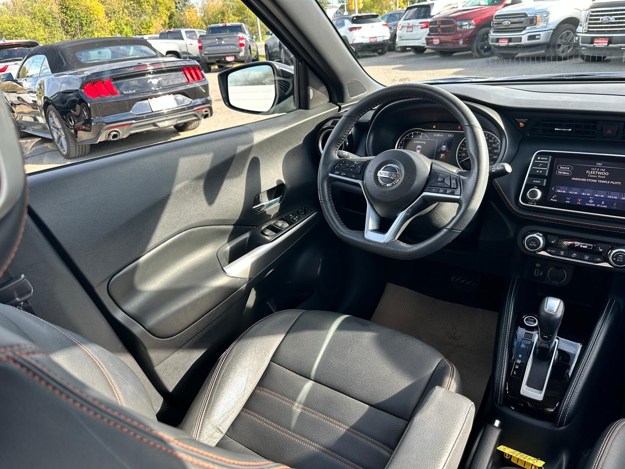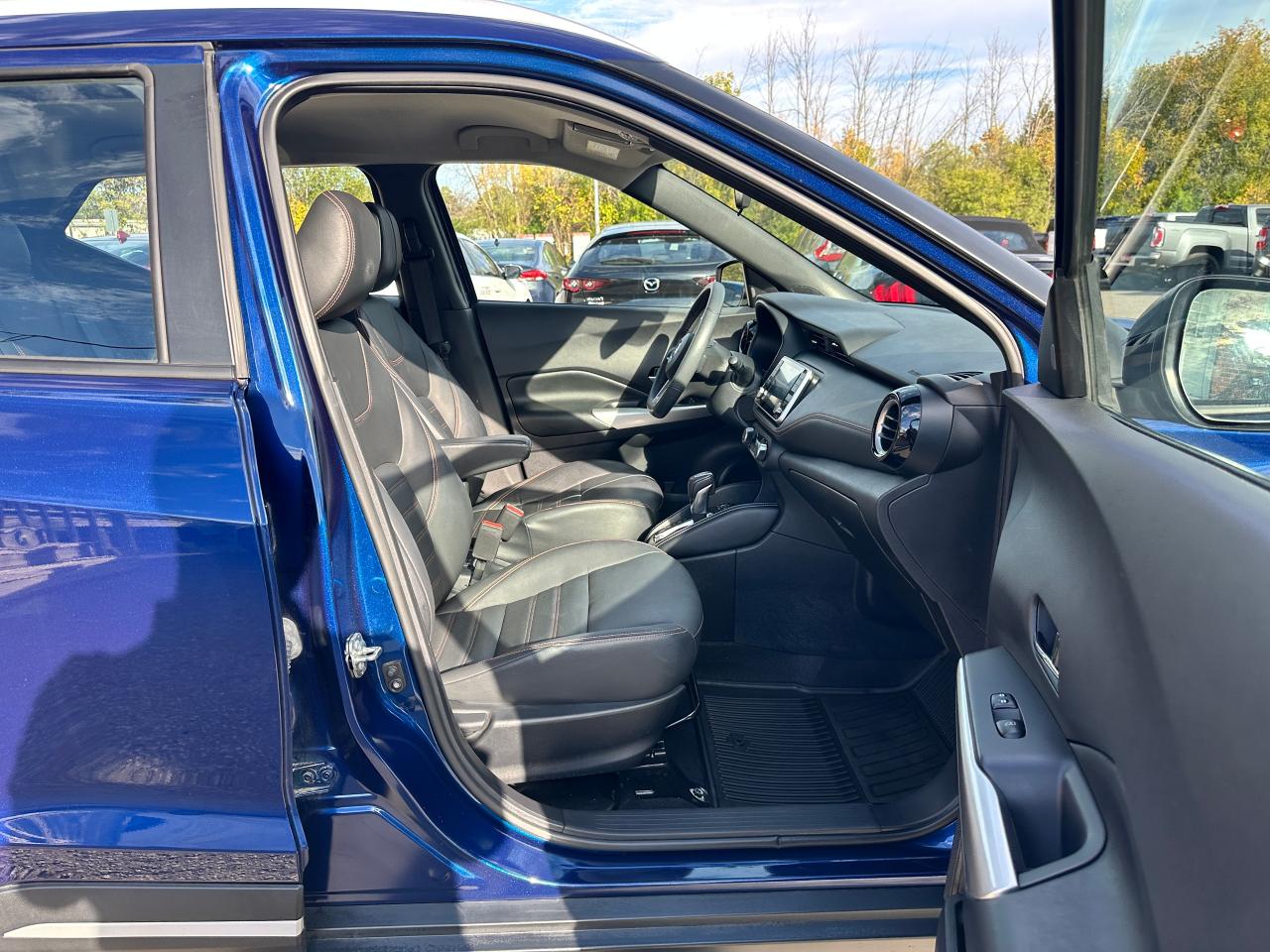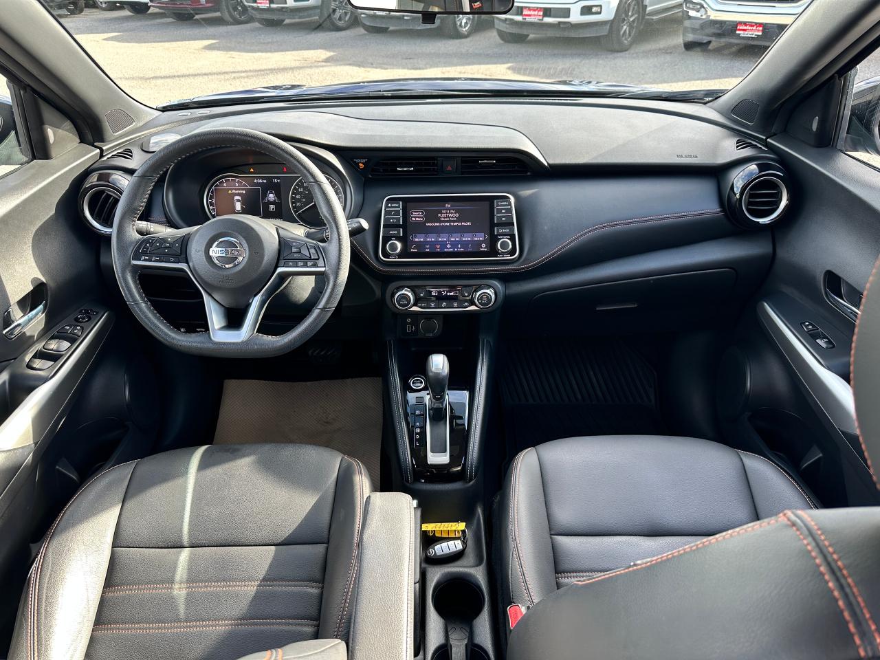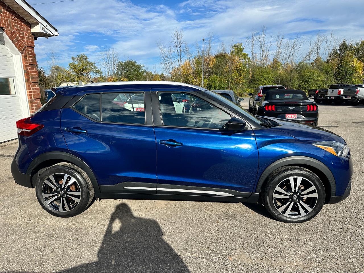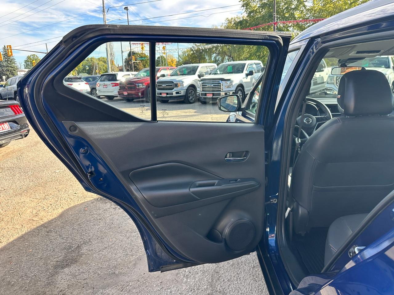 WOW! Super-Clean, LOW KM, One-Owner Nissan Kicks from Richmond Hill, ON! This SR FWD model looks incredible in its Beautiful Dark Blue paint and factory machine-finished alloy wheels, with great options inside and out! The exterior features keyless entry with remote start and proximity keys, sharp side mirrors with integrated turn signals, a sleek rear spoiler, parking sensors, roof rack rails, gorgeous factory alloy wheels, a peppy fuel-efficient 1.6L 4-cylinder Engine and CVT Auto Transmission! The interior is clean and comfortable, and full of tech with heated leather front seats, with drivers built in BOSE Personal Speakers, power door locks, windows and mirrors, comfortable rear seating and a large cargo area, orange accent stitching, a leather-wrapped and accented steering wheel with Audio and Cruise controls, an easy-to-read and use gauge cluster, push button start, a large central touch screen AM/FM/XM Satellite Radio with Bluetooth, Apple CarPlay, Android Auto, SkyView, Forward and Backup Cameras, A/C climate control with front and rear window defrost settings, USB/AUX/12V accessory ports, and more!