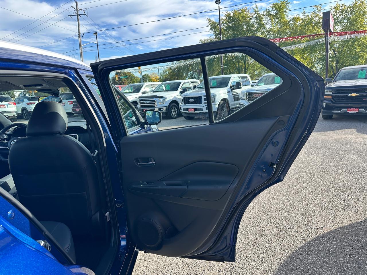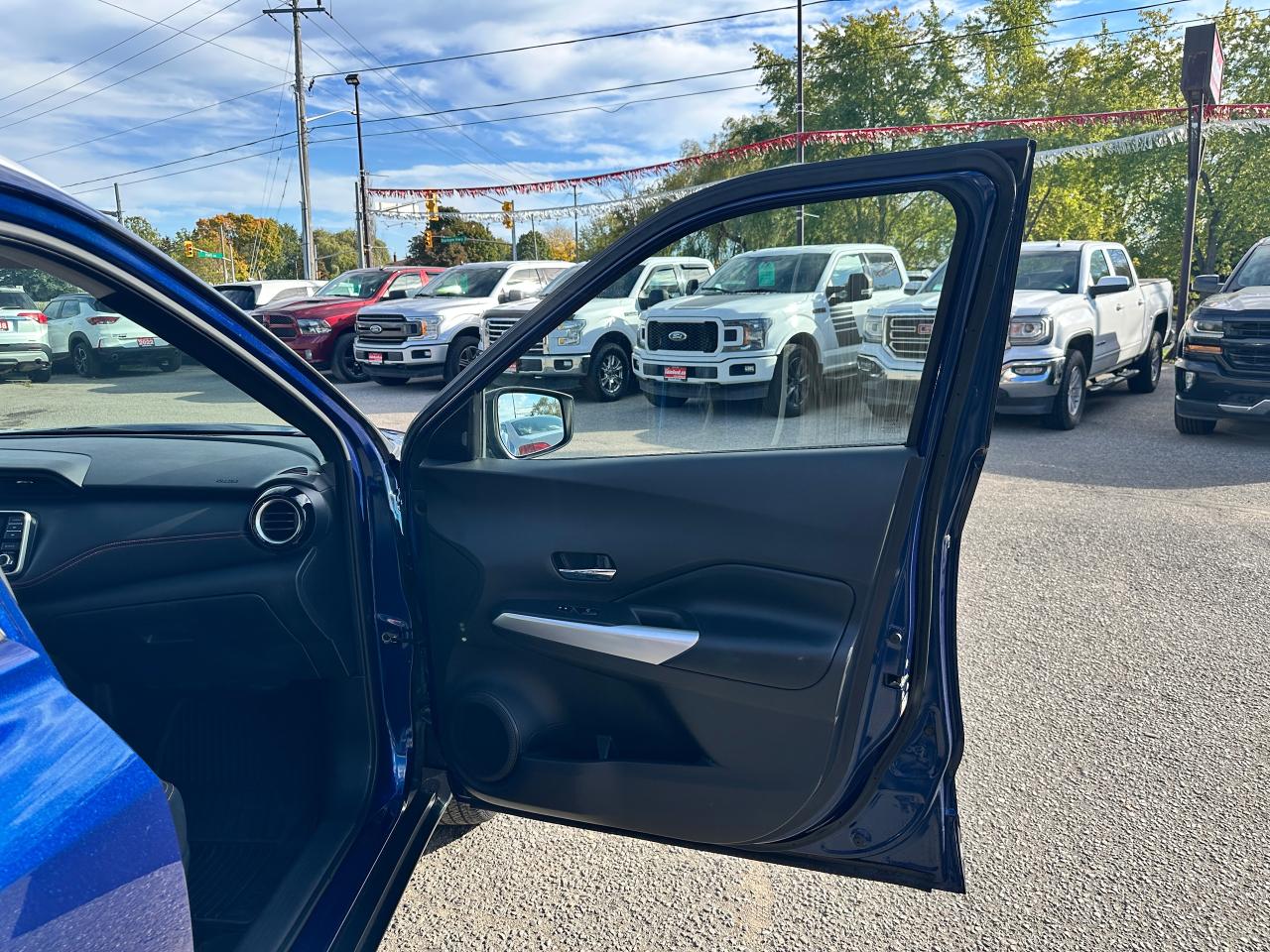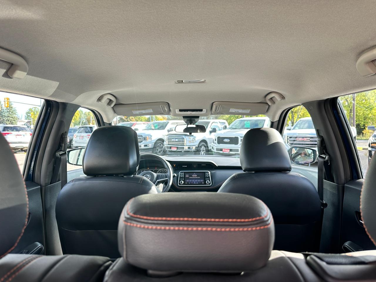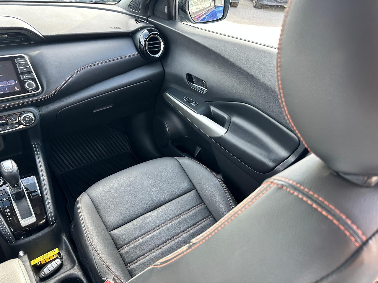 WOW! Super-Clean, LOW KM, One-Owner Nissan Kicks from Richmond Hill, ON! This SR FWD model looks incredible in its Beautiful Dark Blue paint and factory machine-finished alloy wheels, with great options inside and out! The exterior features keyless entry with remote start and proximity keys, sharp side mirrors with integrated turn signals, a sleek rear spoiler, parking sensors, roof rack rails, gorgeous factory alloy wheels, a peppy fuel-efficient 1.6L 4-cylinder Engine and CVT Auto Transmission! The interior is clean and comfortable, and full of tech with heated leather front seats, with drivers built in BOSE Personal Speakers, power door locks, windows and mirrors, comfortable rear seating and a large cargo area, orange accent stitching, a leather-wrapped and accented steering wheel with Audio and Cruise controls, an easy-to-read and use gauge cluster, push button start, a large central touch screen AM/FM/XM Satellite Radio with Bluetooth, Apple CarPlay, Android Auto, SkyView, Forward and Backup Cameras, A/C climate control with front and rear window defrost settings, USB/AUX/12V accessory ports, and more!