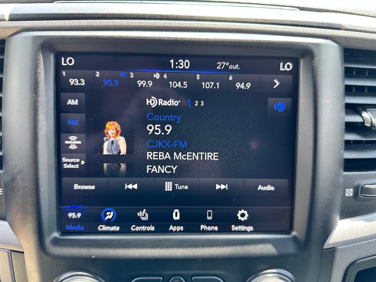 Super-Clean, LOW-KM, Sharp-looking One-Owner RAM 1500 from Cobourg, ON! This Crew Cab Express 4x4 model looks great in its Burgundy paint and Black factory alloy wheels, with great options inside and out! The exterior features keyless entry with remote start, Automatic headlights, foglights, black side mirrors, step sides, colour-matched bumpers and grille, a trailer hitch, tinted privacy glass, sporty dual exhaust, spray-in bedliner, soft folding Trifecta Tonneau cover, gorgeous Black factory alloy wheels, a powerful 5.7L V8 HEMI Engine and Automatic transmission driving the 4x4 system! The interior is clean and comfortable with cloth seating for 6 through its fold-up centre console, heated front seats with driver's power adjustment and lumbar control, power door locks, windows and mirrors, All-Weather floor mats, a heated leather-wrapped steering wheel with Audio and Cruise controls, an easy to read and use gauge cluster, electronic 4x4 selection buttons, a large central touch screen AM/FM/XM Satellite HD Radio with Bluetooth, Apple CarPlay, Android Auto, WiFi Settings, and Backup Camera, Dual-Zone A/C climate control with front and rear window defrost settings, TOW/Haul mode, USB/AUX/12V accessory ports, and more!