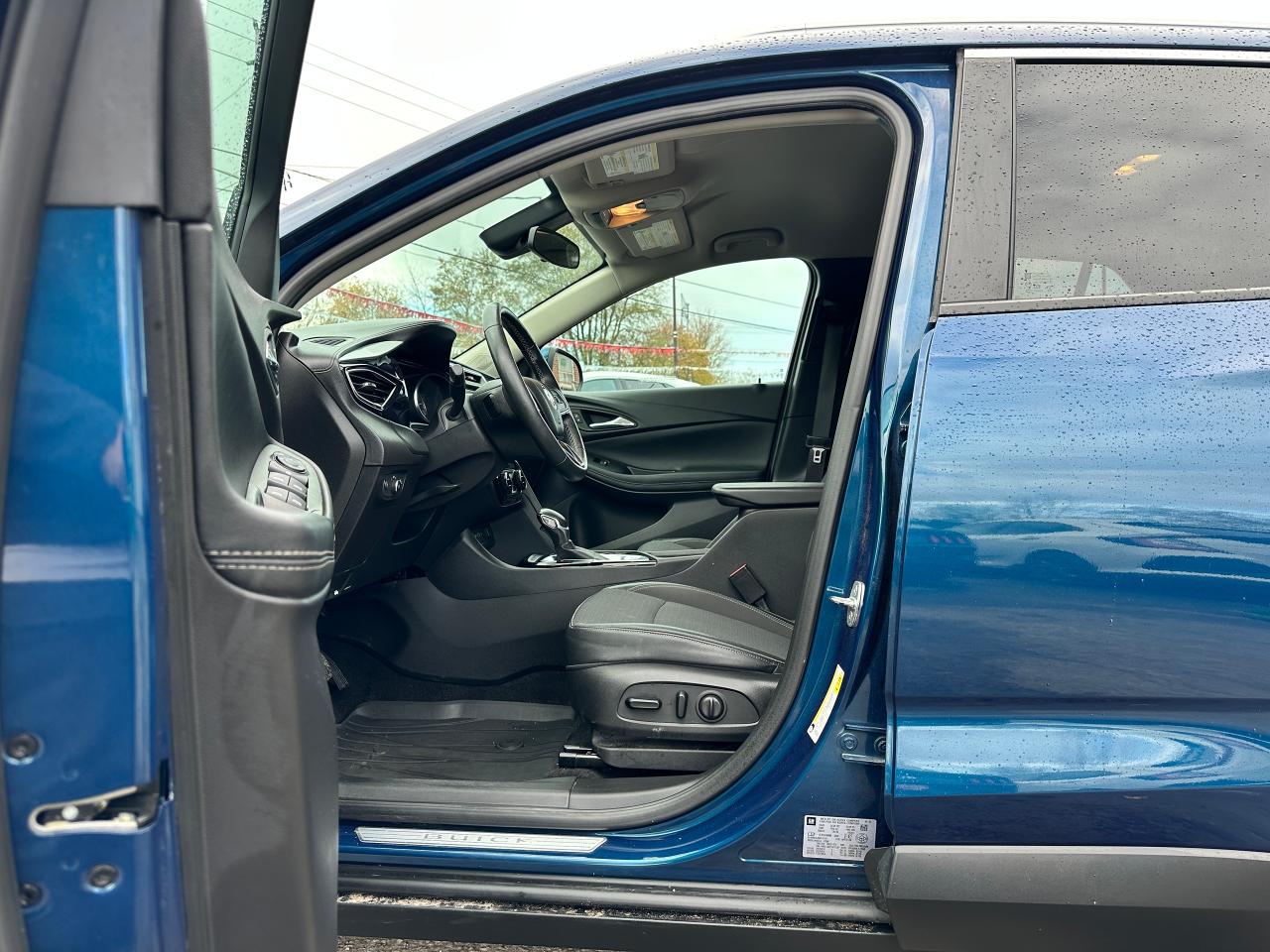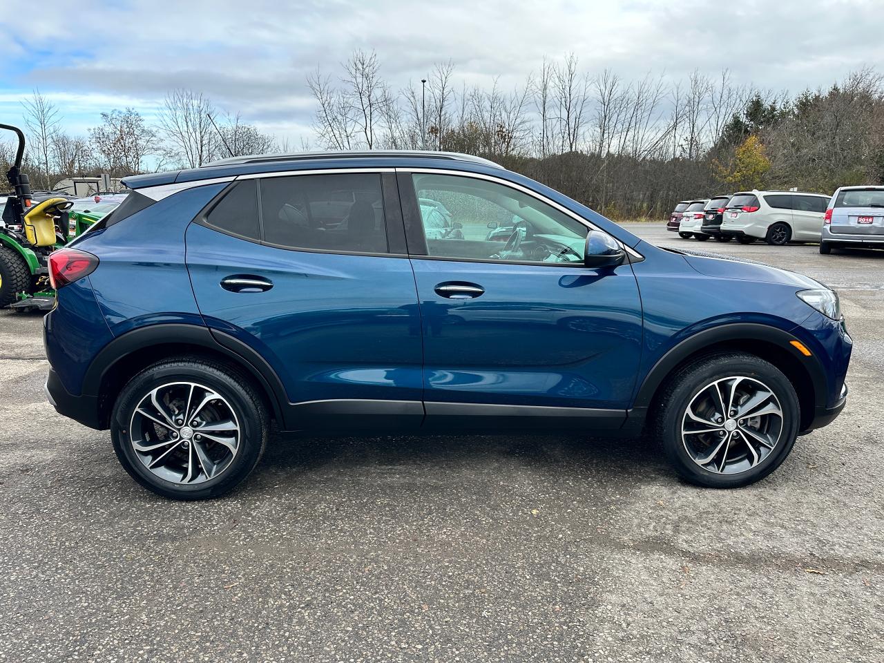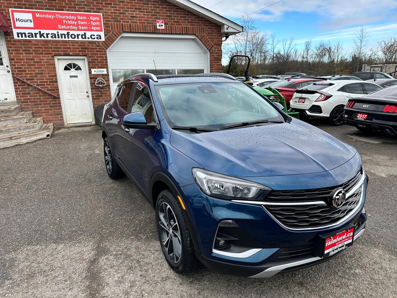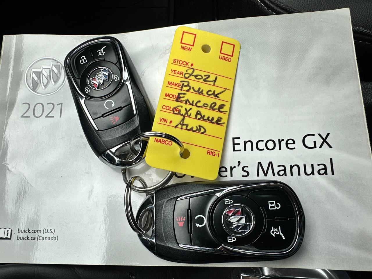Super-Clean Buick Encore GX from Kanata, ON! This Select AWD model looks fantastic in its beautiful Blue paint and factory machine-finished alloy wheels, and great options inside and out! The exterior features keyless entry with remote start and proximity keys, a power rear lift-gate, automatic headlights/highbeams, foglights, colour-matched side mirrors, rear parking sensors, blind spot monitors, lane keeping assist and forward collision warning, a sleek rear spoiler, tinted privacy glass, roof rack rails, gorgeous dark alloy wheels, a peppy fuel-efficient 1.3L 3-Cylinder turbocharged Engine and Automatic transmission powering the All-Wheel-Drive system! The interior is clean and comfortable with heated cloth front seats with driver's power adjustment and lumbar control, power door locks, windows and mirrors, All-Weather floor mats and cargo mat, comfortable rear seating area, a leather wrapped steering wheel with Audio and Cruise controls, an easy to read and use gauge cluster, push button start, a large central Touch Screen AM/FM/XM Satellite Radio with Bluetooth, Apple CarPlay, Android Auto, WiFi and Climate settings, OnStar Turn by Turn capability and Backup Camera, Dual-Zone A/C climate controls with front and rear window defrost settings, USB/USB-C/AUX/12V accessory ports, and more!