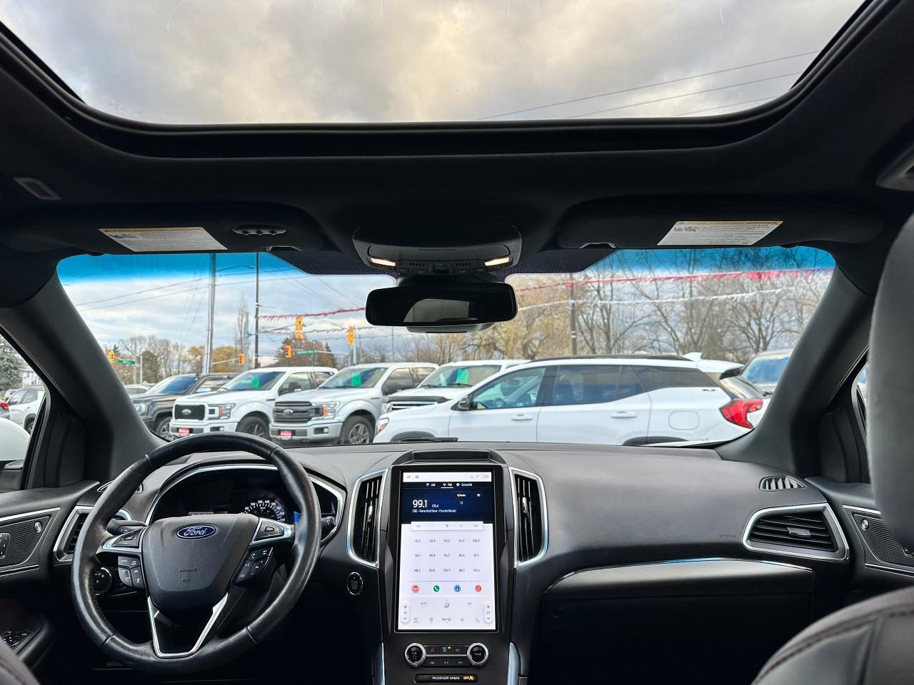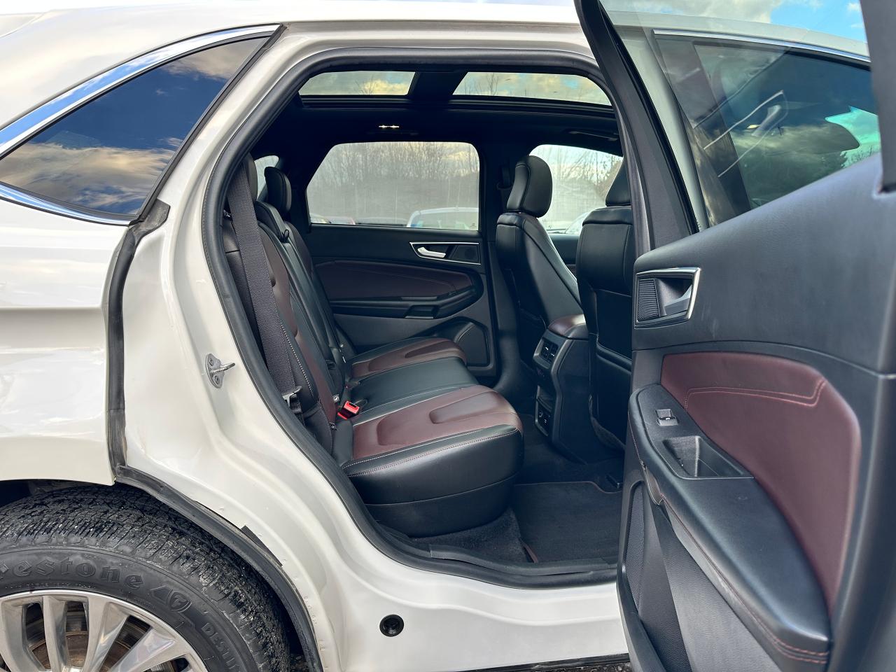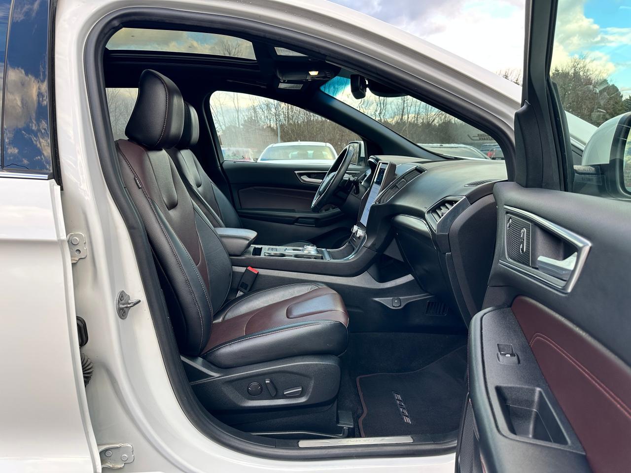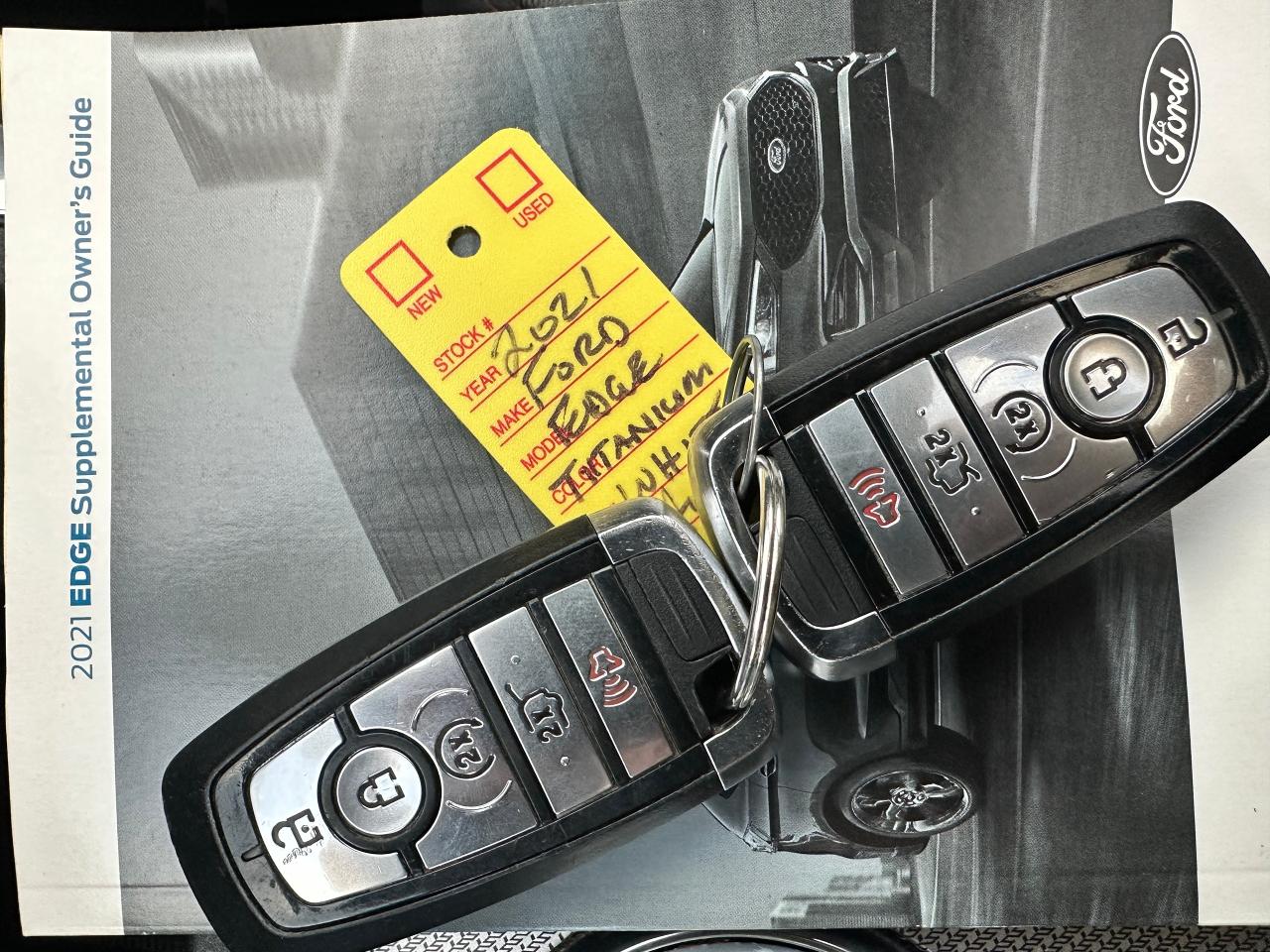 WOW! Super-Clean and well-optioned Ford Edge from Verona, ON! This Titanium AWD model looks incredible in its White paint and factory alloy wheels, with impressive options inside and out! The exterior features keyless entry with remote start and remote power liftgate, proximioty keys and coded entry, a HUGE panoramic sunroof, automatic headlights, foglights, colour-matched side mirrors with integrated turn signals, parking sensors front and rear, driver assists including lane keeping assist, adaptive cruise controls, forward collision warnings, blind spot monitors, and radar parking assists that can nearly park the vehicle for you, a sleek rear spoiler, sporty dual rear exhuast, tinted privacy glass, gorgeous 20" multi-spoke factory polish alloy wheels, a peppy fuel effient 2.0L 4-Cylinder Turbocharged Engine and Automatic transmission powering the All-Wheel-Drive system! The interior is very clean and comfortable with beautiful two-tone leather seating, heated and cooled power-adjustable front seats with lumbar controls and driver's memory settings, spacious and comfortable heated rear seats, power door locks, windows and mirrors, a heated leather-wrapped steering wheel with Audio and Cruise controls, push button start, an easy-to-read and use gauge cluster ENORMOUS central touch screen infotainment system with Premium Bang & Olufsen Audio, AM/FM/XM Satellite HD Radio with Bluetooth, Navigation, Apple CarPlay, Android Auto, Forward parking and Backup Camera, Passenger Games and Dual-Zone Climate controls with front and rear window defrost settings, Auto-Stop/Start override button, USB/12V accessory ports and more!